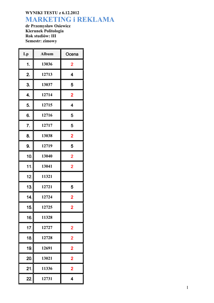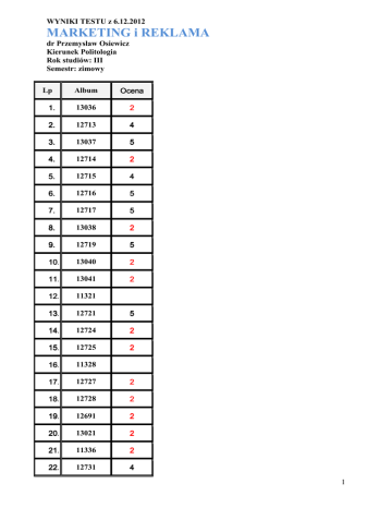 WYNIKI TESTU z 6.12.2012 MARKETING i REKLAMA dr Przemysław Osiewicz Kierunek Politologia Rok studiów: III Semestr: zimowy Album Ocena 1. 13036 2 2. 12713 4 3. 13037 5 4. 12714 2 5. 12715 4 6. 12716 5 7. 12717 5 8. 13038 2 9. 12719 5 10. 13040 2 11. 13041 2 12. 11321 13. 12721 5 14. 12724 2 15. 12725 2 16. 11328 17. 12727 2 18. 12728 2 19. 12691 2 20. 13021 2 21. 11336 2 22. 12731 4 Lp 1 23. 12732 2 24. 12733 5 25. 12734 2 26. 13043 2 27. 13044 5 28. 12718 4 29. 13107 2 30. 13541 2 31. 12735 2 32. 12736 2 33. 13046 3 34. 12737 2 35. 12738 2 36. 12739 2 37. 13047 3 38. 11856 39. 12740 2 40. 12742 3 41. 13029 4+ 42. 13048 2 43. 13045 2 44. 12743 2 45. 12745 3 46. 12747 2 Poprawka odbędzie się w dniu 20 grudnia 2012 r. 2