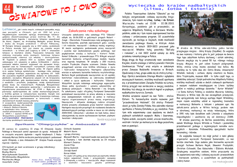 08 18 39 ‘ 96 -19 19 44 Wrzesień 2010 88 20 - Biuletyn informacyjny Latawce, jak i wiele innych, ciekawych pomysłów, mają swe początki w Chinach, już ok. 200 lat p.n.e. Najdawniejsze wzmianki opisują drewnianego latawcagołębia skonstruowanego przez mistrza Mo Ti. Za pośrednictwem kupców i marynarzy latawiec zawędrował do Korei, Japonii, na Archipelag Malajski, przez Birmę i Indie do krajów arabskich i Afryki Północnej. W Europie latawce pojawiły się w XIV wieku, aczkolwiek w Polsce musiały być już znane za czasów wojen tatarskich - w bitwie pod Legnicą w 1241 r. stosowano latawce w kształcie smoka. Puszczanie latawców było ulubioną rozrywką wielu możnych, kolorowe latawce symbolizowały również ich władzę i dostojeństwo. W Tajlandii w połowie XIV w. wydano nawet edykt zakazujący ich używania w pałacu królewskim i okolicy, ponieważ władca zamiast zajmować się sprawami kraju, spędzał czas na “latawcowych” rozrywkach. Latawce były i są wykorzystywane do różnych celów. W Japonii pełnią m.in. ważne funkcje symboliczne - każdego roku, piątego dnia piątego miesiąca, wypuszcza się ogromną ich ilość dla uczczenia męskich potomków, dodania im waleczności, płodności, szczęścia. Misjonarze używali ich do krzewienia chrześcijaństwa, gdy wysmarowane siarką, zmieszane z woskiem i prochem, podpalone, miały symbolizować gniew boży na niewiernych. Posłużyły Benjaminowi Franklinowi do wykonania pomiarów i ostatecznie do wynalezienia piorunochronu. W 1749 r. Były po raz pierwszy wykorzystane do celów meteorologicznych, a krótko potem w ratownictwie morskim. Dzięki nim odbyła się pierwsza transatlantycka transmisja radiowa. Mają szerokie zastosowanie w lotnictwie i wielu dziedzinach badań naszej planety. I oczywiście nadal pozostały wspaniałą zabawą dla małych i dużych. Rekord świata w wysokości lotu latawca został ustanowiony w USA w 1919 r. i wynosi 9740 m.!!! Wszystkim uczestnikom LATAWCOWEJ PRZYGODY życzymy podobnych sukcesów. Zakończenie roku szkolnego Uroczyste zakończenie roku szkolnego PTS “Oświata” odbyło się 26.06.2010 w gościnnych progach Robert Jungk - Oberschule. Przewodnicząca rady pedagogicznej Dorota Koszutska, powitała zaproszonych gości, uczniów i ich rodziców, nauczycieli i działaczy naszej organizcji. W swoim wystąpieniu podsumowała pracę nauczycieli i uczniów nad doskonaleniem języka polskiego, nad pogłębianiem wiedzy o kulturze i historii Polski. Konsul D.Kłaczko i przewodnicząca PTS B.Rejak wręczyli laureatom konkursu ortograficznego medale, kupony oraz nagrody książkowe. W związku z 200 rocznicą urodzin Fryderyka Chopina uczniowie Jakuba Nowaka przygotowali wiersze oraz krótkie informacje o życiu i twórczości kompozytora. Następnie usłyszeliśmy wiersze w wykonaniu laureatów konkursu recytatorskiego. Barbara Rejak podziękowała nauczycielom za ich wysiłek, komitetowi rodzicielskiemu za całoroczną działalność i wkład w życie społeczne i kulturalne “Oświaty”. Wszystkim życzyła radosnego wakacyjnego wypoczynku. Słowa pełne życzliwości i uznania usłyszeliśmy od działaczy polonijnych - Haliny Rometzki i inż. Drapały. Po zakończeniu części oficjalnej Ferdynand Domaradzki podziękował nauczycielom za pracę włożoną w nauczanie oraz zaangażowanym rodzicom za pomoc w realizacji imprez organizowanych przez naszą organizację. Nauczyciele i aktywnie działający rodzice otrzymali drobne prezenty ufundowane przez komitet rodzicielski. Następnie nauczyciele przystąpili do rozdawania świadectw dokumentujących postępy uczniów w nauce za rok szkolny 2009/2010. Uśmiechom i uściskom nie było końca, dzieci odwzajemniały się swoim wychowawcom laurkami, pięknymi kwiatami i słodyczami. Dorota Koszutska Spotkanie “Olimpijczyków” w Ambasadzie RP 30 czerwca br. uczestnicy II etapu VI Olimpiady Języka Polskiego w Niemczech zostali zaproszeni do ogrodu Ambasady RP na uroczyste wręczenie dyplomów i nagród książkowych. I Radca Ambasady Mariusz Skórko serdecznie powitał przybyłych i podsumował wyniki Olimpiady, a żona Ambasadora RP Grażyna Prawda wręczyła nagrody i dyplomy Otrzymali je nasi uczniowie z grupy młodszej: . Coqui Sophie Budig Maria Wyrzykowski Dominik Wróblewska Magdalena Redakcja: Płochecka Maja Anna Jas, Jakub Nowak e-mail:[email protected] Sowiński Julia [email protected] Ochocki Susanne Malotti Kevin i grupy starszej: Maxwell Marta - reprezentowała nas podczas finału w Poznaniu i tam dostała nagrodę za IV miejsce Kleinert Jessica Jarek Filip Górny Dominik Jarząb Kamil Korus Adam Po części oficjalnej przy smacznym poczęstunku młodzi .ludzie wspominali trudy i przyjemności związane z Olimpiadą, a rodzice i nauczyciele długo rozmawiali o ważności nauczania języka polskiego. Wycieczka do krajów nadbałtyckich (Litwa, £otwa i Estonia) Polskie Towarzystwo Szkolne “Oświata” po raz kolejny zorganizowało ciekawą wycieczkę krajoznawczą, tym razem na Litwę, Łotwę i do Estonii. Wyc iec zk a trwał a od 13. 08 - 22. 08. 201 0. Korzystając, podobnie jak w przeszłości, ze wsparcia Wspólnoty Polskiej w Gorzowie Wielkopolskim, udało się i tym razem zaproponować bardzo ciekawy i zróżnicowany program. 32 uczestników wycieczki, po noclegu w Sejnach, miało możliwość zwiedzenia pięknego Kowna, w którym Adam Mickiewicz w latach 1819-1823 pracował jako nauc zyc iel. Właśnie tutaj pow stał y “Ball ady i romanse”, a rok 1822 został uznany za datę przełomu romantycznego w Polsce. Długą drogę do Rygi urozmaicały nam: zwiedzanie Kiejdan, miasta znanego z lektury powieści Henryka Sienkiewicza “Potop” oraz wizyta w założonym przez Janusza Radziwiłla browarze w Birżach. Opuściwszy Litwę, grupa udała się do stolicy Łotwy Rygi. Oprócz zwiedzania Starego Miasta i oglądania secesyjnych kamienic, mieliśmy możliwość spotkania się z przedstawi