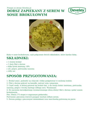 Przepis ze strony Develey.pl DORSZ ZAPIEKANY Z SEREM W SOSIE BROKUŁOWYM Ryba w sosie brokułowym, czyli połączenie dwóch składników, które bardzo lubię. SKŁADNIKI: ● ● ● ● ● 1 świeży brokuł 1 duży filet z dorsza kilka łyżek śmietany 18% sól, pieprz, pietruszka suszona żółty ser SPOSÓB PRZYGOTOWANIA: 1. Brokuł umyć, podzielić na różyczki i lekko podgotować w osolonej wodzie. 2. Filet z dorsza pokroić na kawałki, natrzeć solą i pieprzem. 3. Część wody, w której gotował się brokuł zlać, a do reszty dodać śmietanę, pietruszkę suszoną, pieprz i trochę startego żółtego sera. Wymieszać. 4. Do naczynia żaroodpornego wysmarowanego oliwą włożyć filet z dorsza i polać sosem brokułowym. Piec 30min.175 stopni w nagrzanym piekarniku. Pod koniec pieczenia wierzch posypać startym żółtym serem. 5. Dorsza podaję z pieczonymi ziemniakami oraz marchewką gotowaną na parze.