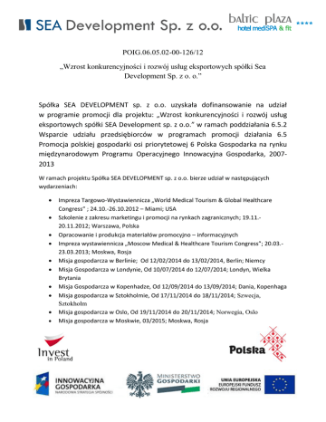 POIG.06.05.02-00-126/12 „Wzrost konkurencyjności i rozwój usług eksportowych spółki Sea Development Sp. z o. o.” Spółka SEA DEVELOPMENT sp. z o.o. uzyskała dofinansowanie na udział w programie promocji dla projektu: „Wzrost konkurencyjności i rozwój usług eksportowych spółki SEA Development sp. z o.o.” w ramach poddziałania 6.5.2 Wsparcie udziału przedsiębiorców w programach promocji działania 6.5 Promocja polskiej gospodarki osi priorytetowej 6 Polska Gospodarka na rynku międzynarodowym Programu Operacyjnego Innowacyjna Gospodarka, 20072013 W ramach projektu Spółka SEA DEVELOPMENT sp. z o.o. bierze udział w następujących wydarzeniach: Impreza Targowo-Wystawiennicza „World Medical Tourism & Global Healthcare Congress” ; 24.10.-26.10.2012 – Miami; USA Szkolenie z zakresu marketingu i promocji na rynkach zagranicznych; 19.11.20.11.2012; Warszawa, Polska Opracowanie i produkcja materiałów promocyjno – informacyjnych Impreza wystawiennicza „Moscow Medical & Healthcare Tourism Congress”; 20.03.23.03.2013; Moskwa, Rosja Misja gospodarcza w Berlinie; Od 12/02/2014 do 13/02/2014, Berlin; Niemcy Misja Gospodarcza w Londynie, Od 10/07/2014 do 12/07/2014; Londyn, Wielka Brytania Misja Gospodarcza w Kopenhadze, Od 12/09/2014 do 13/09/2014; Dania, Kopenhaga Misja gospodarcza w Sztokholmie, Od 17/11/2014 do 18/11/2014; Szwecja, Sztokholm Misja gospodarcza w Oslo, Od 19/11/2014 do 20/11/2014; Norwegia, Oslo Misja gospodarcza w Moskwie, 03/2015; Moskwa, Rosja
