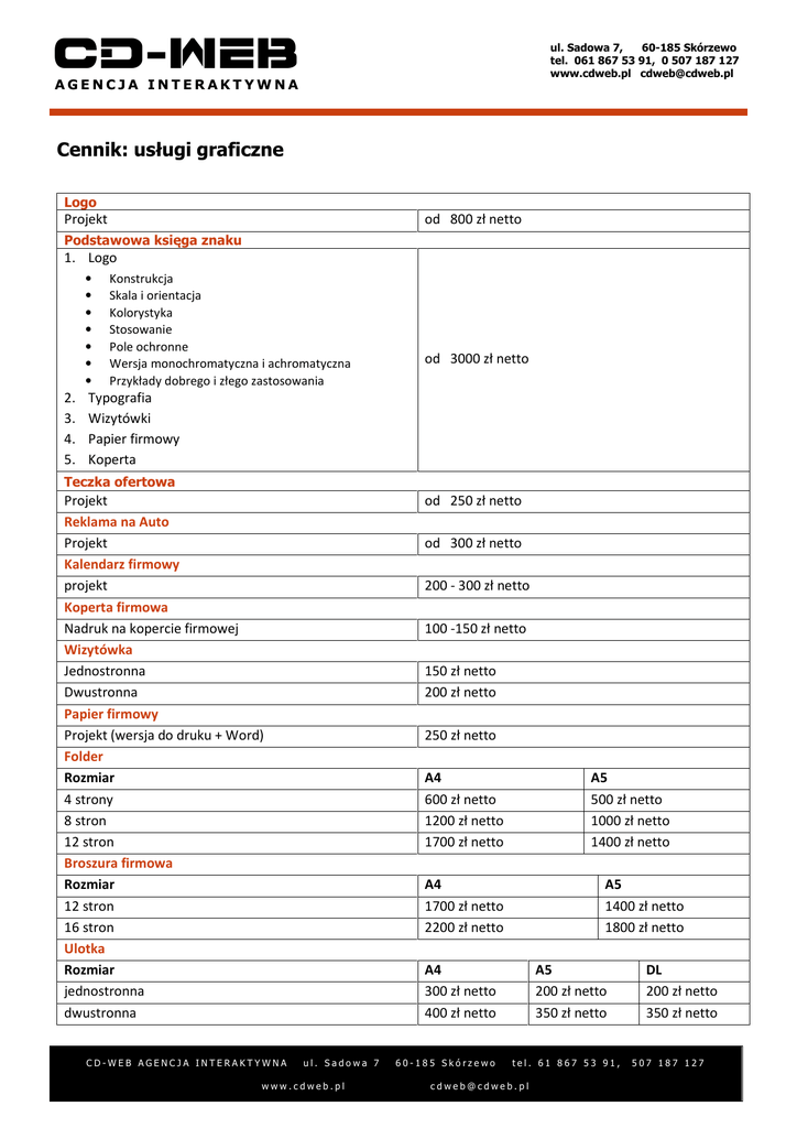 ul. Sadowa 7, 60-185 Skórzewo tel. 061 867 53 91, 0 507 187 127 www.cdweb.pl [email protected] AGENCJA INTERAKTYWNA Cennik: usługi graficzne Logo Projekt od 800 zł netto Podstawowa księga znaku 1. Logo • • • • • • • 2. 3. 4. 5. Konstrukcja Skala i orientacja Kolorystyka Stosowanie Pole ochronne Wersja monochromatyczna i achromatyczna Przykłady dobrego i złego zastosowania od 3000 zł netto Typografia Wizytówki Papier firmowy Koperta Teczka ofertowa Projekt Reklama na Auto Projekt Kalendarz firmowy projekt Koperta firmowa Nadruk na kopercie firmowej Wizytówka Jednostronna Dwustronna Papier firmowy Projekt (wersja do druku + Word) Folder Rozmiar 4 strony 8 stron 12 stron Broszura firmowa Rozmiar 12 stron 16 stron Ulotka Rozmiar jednostronna dwustronna CD-WEB AGENCJA INTERAKTYWNA od 250 zł netto od 300 zł netto 200 - 300 zł netto 100 -150 zł netto 150 zł netto 200 zł netto 250 zł netto A4 600 zł netto 1200 zł netto 1700 zł netto A5 500 zł netto 1000 zł netto 1400 zł netto A4 1700 zł netto 2200 zł netto A5 1400 zł netto 1800 zł netto A4 300 zł netto 400 zł netto ul. Sadowa 7 www.cdweb.pl 60-185 Skórzewo A5 200 zł netto 350 zł netto tel. 61 867 53 91, [email protected] DL 200 zł netto 350 zł netto 507 187 127 Plakat Rozmiar A3 Rozmiar A2 Rozmiar A1 Rollup 85 cm x 200 cm 100 cm x 200 cm 120 cm x 200 cm Reklama do gazety A6 A5 A4 City light 120 cm x 180 cm Billboard 6 m2 (3m x 2m) 12 m2 (5,04m x 2,38m) 18 m2 (6m x 3m) Katalog firmowy Format Do 32 stron Od 33 do 48 stron Od 49 do 64 stron Od 65 do 80 stron Powyżej 80 stron od 400 zł netto od 450 zł netto od 500 zł netto od 300 zł netto od 250 zł netto od 350 zł netto od 450 zł netto od 700 zł netto od 600 zł netto A4 200 zł netto / strona 175 zł netto / strona 150 zł netto / strona 125 zł netto / strona 100 zł netto / strona CD-WEB AGENCJA INTERAKTYWNA ul. Sadowa 7 www.cdweb.pl 60-185 Skórzewo tel. 61 867 53 91, [email protected] 507 187 127
