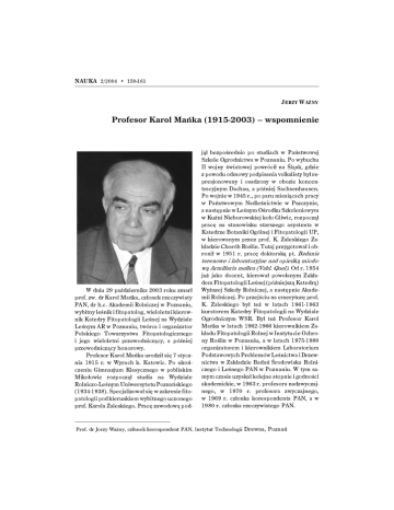 NAUKA 2/2004 • 159-161 JERZY WAŻNY Profesor Karol Mańka (1915-2003) – wspomnienie W dniu 29 października 2003 roku zmarł prof. zw. dr Karol Mańka, członek rzeczywisty PAN, dr h.c. Akademii Rolniczej w Poznaniu, wybitny leśnik i fitopatolog, wieloletni kierownik Katedry Fitopatologii Leśnej na Wydziale Leśnym AR w Poznaniu, twórca i organizator Polskiego Towarzystwa Fitopatologicznego i jego wieloletni przewodniczący, a później przewodniczący honorowy. Profesor Karol Mańka urodził się 7 stycznia 1915 r. w Wyrach k. Katowic. Po ukończeniu Gimnazjum Klasycznego w pobliskim Mikołowie rozpoczął studia na Wydziale Rolniczo-Leśnym Uniwersytetu Poznańskiego (1934-1938). Specjalizował się w zakresie fitopatologii pod kierunkiem wybitnego uczonego prof. Karola Zaleskiego. Pracę zawodową pod- jął bezpośrednio po studiach w Państwowej Szkole Ogrodnictwa w Poznaniu. Po wybuchu II wojny światowej powrócił na Śląsk, gdzie z powodu odmowy podpisania volkslisty był represjonowany i osadzony w obozie koncentracyjnym Dachau, a później Sachsenhausen. Po wojnie w 1945 r., po paru miesiącach pracy w Państwowym Nadleśnictwie w Pszczynie, a następnie w Leśnym Ośrodku Szkoleniowym w Kuźni Nieborowskiej koło Gliwic, rozpoczął pracę na stanowisku starszego asystenta w Katedrze Botaniki Ogólnej i Fitopatologii UP, w kierowanym przez prof. K. Zaleskiego Zakładzie Chorób Roślin. Tutaj przygotował i obronił w 1951 r. pracę doktorską pt. Badania terenowe i laboratoryjne nad opieńką miodową Armillaria mellea (Vahl. Quel). Od r. 1954 już jako docent, kierował powołanym Zakładem Fitopatologii Leśnej (późniejszą Katedrą) Wyższej Szkoły Rolniczej, a następnie Akademii Rolniczej. Po przejściu na emeryturę prof. K. Zaleskiego był też w latach 1961-1963 kuratorem Katedry Fitopatologii na Wydziale Ogrodniczym WSR. Był też Profesor Karol Mańka w latach 1962-1966 kierownikiem Zakładu Fitopatologii Rolnej w Instytucie Ochrony Roślin w Poznaniu, a w latach 1975-1980 organizatorem i kierownikiem Laboratorium Podstawowych Problemów Leśnictwa i Drzewnictwa w Zakładzie Badań Środowiska Rolniczego i Leśnego PAN w Poznaniu. W tym samym czasie uzyskał kolejne stopnie i godności akademickie, w 1963 r. profesora nadzwyczajnego, w 1970 r. profesora zwyczajnego, w 1969 r. członka korespondenta PAN, a w 1980 r. członka rzeczywistego PAN. Prof. dr Jerzy Ważny, członek korespondent PAN, Instytut Technologii Drewna, Poznań 160 Jerzy Ważny Jako dydaktyk Profesor Karol Mańka prowadził zajęcia z przedmiotu fitopatologia leśna na Wydziale Leśnym i wiele przedmiotów pomocniczych. Wykształcił ponad 100 magistrów, wypromował 16 doktorów, spośród których siedmioro uzyskało stopień doktora habilitowanego, a czworo także tytuł profesora. Przez dwie kadencje (1963-1969) pełnił funkcje prorektora Akademii Rolniczej ds. nauczania. W jego dorobku naukowym figuruje ponad 100 publikacji naukowych i artykułów oraz liczne tłumaczenia podręczników z zakresu fitopatologii i mikrobiologii, opracowania skryptów, książek popularnonaukowych, a także haseł w słownikach i encyklopediach. Na szczególne wyróżnienie zasługuje podręcznik Fitopatologia leśna, którego 5 kolejnych poprawianych i uzupełnianych wydań stanowi źródło wiedzy dla studentów i praktyków. Prace badawcze i działalność naukowa Profesora Karola Mańki koncentrowały się głównie na ważnych problemach chorób drzew i drzewostanów. Wprowadzając własne oryginalne koncepcje badawcze, wzbogacił znacznie wiedzę o hubie sosny (Phellinus pini) i jako pierwszy w Polsce dogłębnie zbadał opieńkową zgniliznę korzeni drzew w świerczynach górskich na południu kraju (w Beskidach). Zastosował do pracy nad tą chorobą własną metodę (tzw. metodę korelacyjną), która pozwala w 2-3 lata uchwycić przebieg i narastającą lub wygasającą fazę epidemii chorobowej trwającej wiele lat. Był to początek wdrażanego dziś monitoringu fitopatologicznego, który zaowocował oceną sytuacji w Beskidach i zapoczątkował postępującą do dnia dzisiejszego przebudowę tamtejszych drzewostanów świerkowych, podatnych na choroby, na drzewostany mieszane, które są lepiej przystosowane do siedliska, a przez to bardziej odporne. Tą samą metodą badał Profesor Mańka epifitozę holenderskiej choroby wiązów (Ophiostoma ulmi) w Poznaniu i stwierdził jej wygasanie we wczesnych latach 50. XX w. W badaniach nad opieńką oraz nad holen- derską chorobą wiązów Profesor wykazał ogromną rolę środowiska we wzmacnianiu odporności drzew oraz ich zespołów na choroby. Pracując nad tym problemem wcześniej, niż oficjalna biologia dostrzegła rolę środowiska w przebiegu rozmaitych zjawisk, wypracował koncepcję oraz metodykę badań (tzw. szeregów biotycznych) pozwalających na określenie wpływu środowiska – zwłaszcza glebowego – na wzrost i patogeniczność grzybów chorobotwórczych dla roślin. Było to i jest całkowicie oryginalne osiągnięcie, które dało początek szeroko zakrojonym badaniom nad środowiskowym uwarunkowaniem powstawania i przebiegu chorób roślin. Badania te podjęło wiele ośrodków naukowych w kraju, a także zagranicą, uzyskując wartościowe rozeznanie w dziedzinie ekologii grzybów glebowych. Podejście to zostało wykorzystane w pionierskich w Polsce badaniach nad hubą korzeni, a następnie nad zgorzelą siewek sosny i biologiczną ochroną przed obydwoma tymi chorobami. Zwłaszcza prace nad hubą korzeni były zakrojone na szeroką skalę, jako że sponsorowała je Fundacja Rockefellera, której stypendystą był w 1960 r. Karol Mańka. Podczas kilku miesięcy pracował wtedy w znakomitych ośrodkach naukowych w Anglii, Kanadzie oraz USA. Wiele interesujących i owocnych badań przeprowadzono też metodą szeregów biotycznych na polu fitopatologii rolniczej i ogrodniczej, poznając wpływ środowiska glebowego na c
