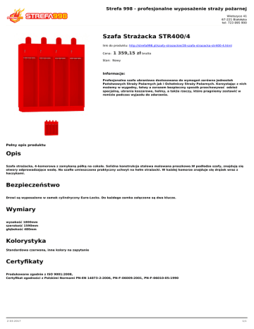 Strefa 998 - profesjonalne wyposażenie straży pożarnej Wietszyce 41 67-221 Białołęka tel: 723 895 900 Szafa Strażacka STR400/4 link do produktu: http://strefa998.pl/szafy-strazackie/28-szafa-strazacka-str400-4.html Cena: 1 359,15 zł brutto Stan: Nowy Informacje: Profesjonalna szafa ubraniowa dostosowana do wymagań zarówno jednostek Państwowych Straży Pożarnych jak i Ochotniczy Straży Pożarnych. Korzystając z nich możemy w wygodny, łatwy a zarazem bezpieczny sposób przechowywać odzież specjalną, ubrania koszarowe, hełmy, a także rzeczy, które pragniemy zostawić w remizie podczas wyjazdu do zdarzenia. Pełny opis produktu Opis Szafa strażacka, 4-komorowa z zamykaną półką na cokole. Solidna konstrukcja stalowa malowana proszkowo.W podłodze szafy, znajdują się otwory odprowadzające wodę. Na szafie umieszczono praktyczny uchwyt na hełm strażacki. W każdej komorze znajduje się drążek wraz z haczykami. Bezpieczeństwo Drzwi są wyposażone w zamek cylindryczny Euro-Locks. Do każdego zamka załączone są dwa klucze. Wymiary wysokość 1800mm szerokość 1590mm głębokość 480mm Kolorystyka Standardowa czerwona, inne kolory na zapytanie Certyfikaty Produkowane zgodnie z ISO 9001:2008, Certyfikat zgodności z Polskimi Normami PN-EN 14073-2:2006, PN-F-06009:2001, PN-F-06010-05:1990 2-03-2017 1/1