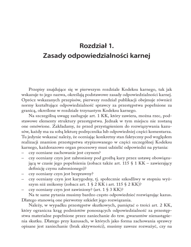 Rozdział 1. Zasady odpowiedzialności karnej Przepisy znajdujące się w pierwszym rozdziale Kodeksu karnego, tak jak wskazuje to jego nazwa, określają podstawowe zasady odpowiedzialności karnej. Oprócz wskazanych przepisów, pierwszy rozdział publikacji obejmuje również normy kształtujące odpowiedzialność sprawcy za przestępstwa popełnione za granicą, określone w rozdziale trzynastym Kodeksu karnego. Na szczególną uwagę zasługuje art. 1 KK, który zawiera, można rzec, podstawowe elementy struktury przestępstwa. Jednak w tym miejscu nie zostaną one omówione. Zakładamy, że przed przystąpieniem do rozwiązywania kazusów, każdy ma za sobą lekturę podręcznika lub odpowiedniej części komentarza. Tu jedynie wskazać należy, że oceniając konkretny stan faktyczny pod względem realizacji znamion przestępstwa stypizowanego w części szczególnej Kodeksu karnego, każdorazowo organ procesowy musi udzielić odpowiedzi na pytania: –– czy oceniane zachowanie jest czynem? –– czy oceniany czyn jest zabroniony pod groźbą kary przez ustawę obowiązującą w czasie jego popełnienia (zobacz także art. 115 § 1 KK – zawierający definicję czynu zabronionego)? –– czy oceniany czyn jest bezprawny? –– czy oceniany czyn jest karygodny, tj. społecznie szkodliwy w stopniu wyższym niż znikomy (zobacz art. 1 § 2 KK i art. 115 § 2 KK)? –– czy oceniany czyn jest zawiniony? (art. 1 § 3 KK)? Na te same pytania musimy bardzo często odpowiedzieć rozwiązując kazus. Dlatego stanowią one pierwotny szkielet jego rozwiązania. Należy, w wypadku przestępstw skutkowych, pamiętać o treści art. 2 KK, który ogranicza krąg podmiotów ponoszących odpowiedzialność za przestępstwa materialne popełnione przez zaniechanie do tzw. gwarantów nienastąpienia skutku. Dlatego przy kazusach, w których jako forma zachowania sprawcy opisane jest zaniechanie (brak aktywności), musimy zawsze rozważyć, czy na 16 Prawo karne matierialne. Zbiór kazusów podmiocie spoczywał prawny obowiązek działania, a zwłaszcza zapobiegnięcia skutkowi. Skoro mowa o przestępstwach materialnych, jeżeli już z takimi mamy do czynienia w kazusie zwróćmy uwagę czy między ocenianym zachowaniem sprawcy a skutkiem istnieje związek przyczynowy. Czasami „hakiem” w kazusie jest właśnie brak takiego związku (albo odwrotnie). Artykuł 4 KK obejmuje istotne wskazówki dotyczące stosowania ustaw, gdy obowiązywała inna ustawa w czasie popełnienia ocenianego czynu, a inna w czasie orzekania. Nie odnosimy się do treści tego artykułu we wszystkich kazusach, ale tylko w tych, które wskazują na zagadnienia intertemporalne, w szczególności mamy wskazanie dat czynów odleglejsze niż obowiązujący Kodeks karny. Wówczas pominięcie zwłaszcza treści art. 4 § 1 KK i oceny względności konkurujących ustaw będzie poczytane za istotną lukę w rozwiązaniu kazusu. Bardzo często w kazusach chodzi o wskazanie czasu popełnienia przestępstwa, niekoniecznie związane jest to z zagadnieniami intertemporalnymi, ale może chodzić także o przedawnienie karalności, czy możliwość pociągnięcia sprawcy do odpowiedzialności karnej na zasadach określonych w Kodeksie karnym, zważywszy na przykład na wiek sprawcy. Dlatego też tam, gdzie pojawiają się daty, musimy pochylić się nad treścią nie tylko art. 4 KK, ale także art. 6 § 1 KK, jak również art. 10 KK. O czasie popełnienia czynu zabronionego mowa też np. w art. 31 KK, który traktuje o niepoczytalności, poczytalności w znacznym stopniu ograniczonej sprawcy w czasie czynu. Trzeba przy tym pamiętać, że Kodeks karny przewiduje równoważne czasy popełnienia przestępstwa, a mianowicie: czas, w którym sprawca działał lub zaniechał działania, do którego był obowiązany (tu zauważyć też trzeba, że obowiązki mogą wynikać nie tylko z przepisów rangi ustawowej, ale także mogą być zamieszczone w aktach prawnych niższego rzędu). Istotne jest jednak w rozwiązywanym kazusie wskazanie na istnienie obowiązku po stronie sprawcy. Podobne reguły dotyczą miejsca popełnienia przestępstwa, które definiuje artykuł 6 § 2 KK. Ustawa wskazuje, że jest nim miejsce, gdzie sprawca działał lub zaniechał działania, do którego był obowiązany, albo gdzie skutek nastąpił lub według zamiaru sprawcy miał nastąpić (oczywiście pomijamy konsekwencje procesowe miejsca popełnienia przestępstwa związane chociażby z właściwością sądów). Przy uwzględnieniu jednak treści art. 5 KK oraz art. 109 KK – 114 KK miejsce popełnienia przestępstwa przez konkretną osobę nabiera szczególnego znaczenia i pominięcie tych kwestii przy rozwiązaniu konkretnego kazusu może pozbawić nas koniecznej liczby punktów do uzyskania pozytywnej oceny. Na marginesie zauważyć należy, że reguły tzw. prawa karnego międzynarodowe- Rozdział 1. Zasady odpowiedzialności karnej 17 go, mają coraz większe praktyczne znaczenie także w codziennym stosowaniu prawa przez organy procesowe. Sprawcy przestępstw przemieszczają się bowiem przekraczając granice państw, popełniają przestępstwa coraz częściej w grupach o składzie „międzynarodowym”. Zdobycie szerszej wiedzy w tym zakresie przyda się nie tylko przy rozwiązywaniu kazusów, ale także podczas praktyk zawodowych, aplikacji i pracy zawodowej. Artykuł 7 KK wskazuje na istotny w praktyce podział przestępstw na zbrodnie i występki. Jego znajomość przydaje się nie tylko przy klasyfikacji przestępstw, ale np. przy określaniu kar z nadzwyczajnym złagodzeniem (zobacz treść art. 60 § 6 KK), czy obostrzeniem (zobacz art. 64 § 3 KK), nie mówiąc już o obliczaniu terminów przedawnienia, a to już ma wymiar praktyczny przy rozwiązywaniu kazusów. Kolejne przepisy art. 8 i 9 KK nie są przy kwalifikacjach prawnych (podobnie jak wcześniejsze) przywoływane. Jednak zawsze odczytując elementy strony podmiotowej poszczególn