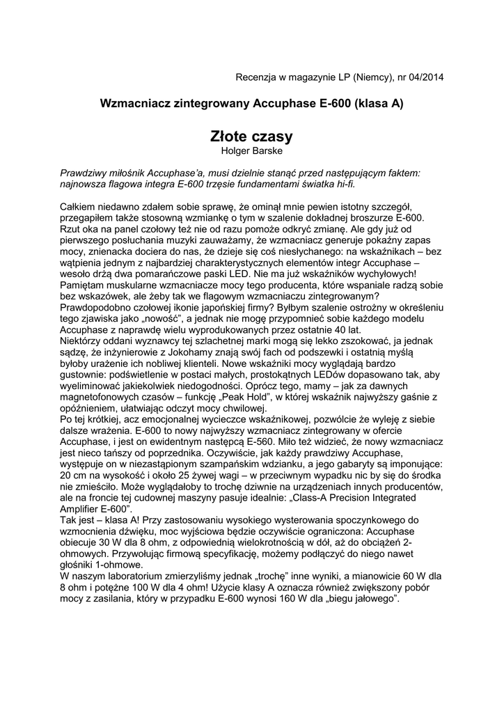 Recenzja w magazynie LP (Niemcy), nr 04/2014 Wzmacniacz zintegrowany Accuphase E-600 (klasa A) Złote czasy Holger Barske Prawdziwy miłośnik Accuphase’a, musi dzielnie stanąć przed następującym faktem: najnowsza flagowa integra E-600 trzęsie fundamentami światka hi-fi. Całkiem niedawno zdałem sobie sprawę, że ominął mnie pewien istotny szczegół, przegapiłem także stosowną wzmiankę o tym w szalenie dokładnej broszurze E-600. Rzut oka na panel czołowy też nie od razu pomoże odkryć zmianę. Ale gdy już od pierwszego posłuchania muzyki zauważamy, że wzmacniacz generuje pokaźny zapas mocy, znienacka dociera do nas, że dzieje się coś niesłychanego: na wskaźnikach – bez wątpienia jednym z najbardziej charakterystycznych elementów integr Accuphase – wesoło drżą dwa pomarańczowe paski LED. Nie ma już wskaźników wychyłowych! Pamiętam muskularne wzmacniacze mocy tego producenta, które wspaniale radzą sobie bez wskazówek, ale żeby tak we flagowym wzmacniaczu zintegrowanym? Prawdopodobno czołowej ikonie japońskiej firmy? Byłbym szalenie ostrożny w określeniu tego zjawiska jako „nowość”, a jednak nie mogę przypomnieć sobie każdego modelu Accuphase z naprawdę wielu wyprodukowanych przez ostatnie 40 lat. Niektórzy oddani wyznawcy tej szlachetnej marki mogą się lekko zszokować, ja jednak sądzę, że inżynierowie z Jokohamy znają swój fach od podszewki i ostatnią myślą byłoby urażenie ich nobliwej klienteli. Nowe wskaźniki mocy wyglądają bardzo gustownie: podświetlenie w postaci małych, prostokątnych LEDów dopasowano tak, aby wyeliminować jakiekolwiek niedogodności. Oprócz tego, mamy – jak za dawnych magnetofonowych czasów – funkcję „Peak Hold”, w której wskaźnik najwyższy gaśnie z opóźnieniem, ułatwiając odczyt mocy chwilowej. Po tej krótkiej, acz emocjonalnej wycieczce wskaźnikowej, pozwólcie że wyleję z siebie dalsze wrażenia. E-600 to nowy najwyższy wzmacniacz zintegrowany w ofercie Accuphase, i jest on ewidentnym następcą E-560. Miło też widzieć, że nowy wzmacniacz jest nieco tańszy od poprzednika. Oczywiście, jak każdy prawdziwy Accuphase, występuje on w niezastąpionym szampańskim wdzianku, a jego gabaryty są imponujące: 20 cm na wysokość i około 25 żywej wagi – w przeciwnym wypadku nic by się do środka nie zmieściło. Może wyglądałoby to trochę dziwnie na urządzeniach innych producentów, ale na froncie tej cudownej maszyny pasuje idealnie: „Class-A Precision Integrated Amplifier E-600”. Tak jest – klasa A! Przy zastosowaniu wysokiego wysterowania spoczynkowego do wzmocnienia dźwięku, moc wyjściowa będzie oczywiście ograniczona: Accuphase obiecuje 30 W dla 8 ohm, z odpowiednią wielokrotnością w dół, aż do obciążeń 2ohmowych. Przywołując firmową specyfikację, możemy podłączyć do niego nawet głośniki 1-ohmowe. W naszym laboratorium zmierzyliśmy jednak „trochę” inne wyniki, a mianowicie 60 W dla 8 ohm i potężne 100 W dla 4 ohm! Użycie klasy A oznacza również zwiększony pobór mocy z zasilania, który w przypadku E-600 wynosi 160 W dla „biegu jałowego”. Mówi to wystarczająco dużo o eksploatacji w klasie A w szerokim zakresie mocy, jednakże wzmacniacz w kluczowych momentach przełącza się w tryb klasy B. E-600 powinien zapewnić komfortowy poziom bezpieczeństwa nawet w centrum dowodzenia umieszczonego w głębokim schronie. Żeby sprostać temu zadaniu, projektant zastosował tu wszystko, czego tylko potrzeba w wysokiej klasy wzmacniaczu zintegrowanym. Jest sześć wejść liniowych RCA (w tym jedno konfigurowane jako pętla magnetofonowa) i dwa zbalansowane (XLR). Są złącza do rozdzielenia wyjścia pre- i wejścia końcówki mocy – obydwa w konfiguracji zbalansowanej i zwykłej. No i na koniec dwie pary bardzo solidnych terminali głośnikowych (A/B), oczywiście przełączanych. Tak jak inne integry i przedwzmacniacze Accuphase, tylny panel E-600 wyposażono w dwa sloty na opcjonalne płytki z elektroniką. Celem jest jak najlepsze dostosowanie opcji wejść stopnia przedwzmacniacza do wymagań użytkownika. W modelu topowym firma oferuje: moduł cyfrowy DAC-40, gramofonowy (winyl!) i AD-30 oraz liniowy Line-10. Wbrew pozornemu skomplikowaniu, ci z Was, którzy w latach 70. i 80. mieli do czynienia z wielkimi wzmacniaczami zintegrowanymi, szybko przyzwyczają się do E-600, co więcej – wspomnicie moje słowa – zapewni on wiele zabawy. Powodem jest, że po prostu nie ma tu miejsca na półśrodki i niedociągnięcia. Ten wzmacniacz w całej swojej złożoności z zabójczą precyzją zrobi wszystko, czego od niego wymagamy. Nic się nie zacina ani nie trzeszczy. Każdy przełącznik, przycisk i gałka idealnie wykonują to, do czego zostały zaprojektowane. Prawdę mówiąc, przyznam że tę samą doskonałość spotkałem nie tak dawno, w „budżetowym” E-260. I właśnie o to chodzi w sprzęcie Accuphase! Regulacja głośności następuje z nieprawdopodobną płynnością ruchu , dzięki wyjątkowemu obrotowemu potencjometrowi umieszczonemu po prawej stronie. Został on niedawno ulepszony od strony mechanicznej i osobiście sądzę, że jest on doskonałym przykładem ekstremalnej dbałości Japończyków o każdy, pozornie nieistotny szczegół konstrukcji. Regulatory barwy dźwięku? Bingo! Oczywiście są one wyłączane. Mierniki mocy wraz z liczbowym wskaźnikiem poziomy głośności (dB) też mogą być wyłączone, tak więc na widoku pozostaje tylko gustowne zielone logo Accuphase i jedna kontrolka LED. Po raz pierwszy pośród LEDów funkcyjnych odkrywamy jeden opisany jako „USB”. Jest on przeznaczony dla nowej opcjonalnej płytki DAC-40, która wyposażona jest właśnie w to wejście. Jeśli chodzi o inne technikalia, Accuphase znowu przeszedł płynną ewolucję. Potencjometr głośności AAVA – wszechstronnie przetestowany przez ostatnie kilka lat – został ulepszony ta
