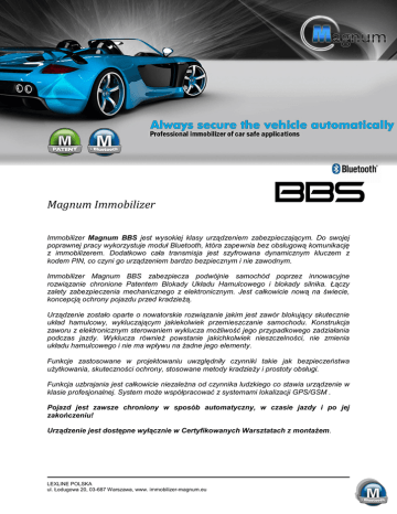 Magnum Immobilizer Immobilizer Magnum BBS jest wysokiej klasy urządzeniem zabezpieczającym. Do swojej poprawnej pracy wykorzystuje moduł Bluetooth, która zapewnia bez obsługową komunikację z immobilizerem. Dodatkowo cała transmisja jest szyfrowana dynamicznym kluczem z kodem PIN, co czyni go urządzeniem bardzo bezpiecznym i nie zawodnym. Immobilizer Magnum BBS zabezpiecza podwójnie samochód poprzez innowacyjne rozwiązanie chronione Patentem Blokady Układu Hamulcowego i blokady silnika. Łączy zalety zabezpieczenia mechanicznego z elektronicznym. Jest całkowicie nową na świecie, koncepcją ochrony pojazdu przed kradzieżą. Urządzenie zostało oparte o nowatorskie rozwiązanie jakim jest zawór blokujący skutecznie układ hamulcowy, wykluczającym jakiekolwiek przemieszczanie samochodu. Konstrukcja zaworu z elektronicznym sterowaniem wyklucza możliwość jego przypadkowego zadziałania podczas jazdy. Wyklucza również powstanie jakichkolwiek nieszczelności, nie zmienia układu hamulcowego i nie ma wpływu na żadne jego elementy. Funkcje zastosowane w projektowaniu uwzględniły czynniki takie jak bezpieczeństwa użytkowania, skuteczności ochrony, stosowane metody kradzieży i prostoty obsługi. Funkcja uzbrajania jest całkowicie niezależna od czynnika ludzkiego co stawia urządzenie w klasie profesjonalnej. System może współpracować z systemami lokalizacji GPS/GSM . Pojazd jest zawsze chroniony w sposób automatyczny, w czasie jazdy i po jej zakończeniu! Urządzenie jest dostępne wyłącznie w Certyfikowanych Warsztatach z montażem. LEXLINE POLSKA ul. Łodugowa 20, 03-687 Warszawa, www. immobilizer-magnum.eu OPIS URZĄDZENIA Magnum BBS jest immobilizerem bez obsługowym stworzonym w oparciu o sprawdzony model BTS zapewniając najlepsze funkcje z zakresu zabezpieczenia przed kradzieżą. Immobilizer Magnum BBS pomimo prostej konstrukcji posiada wszystkie logiczne funkcje obsługi i autodiagnozy. Magnum BBS posiada o Patentowany Zawór Blokujący Hamulce i blokadę wewnętrzną przekaźnik blokady elektrycznej pracujących na stykach normalnie zwartych (NC). Do obsługi immobilizera służą przypisane telefony plus dodatkowo karty transpondery w kształcie Karty kredytowej (2 sztuki w komplecie). FUNKCJE IMMOBILIZERA możliwość wkodowania 4 telefonów możliwość wkodowania 4 kart transponderów 1 obwód blokady hydraulicznej hamulca 1 obwód blokady elektrycznej w konfiguracji NC 10A 1 linia wejścia włączników masowych (wyprowadzenie immobilizera z trybu uśpienia) 1 linia wejścia załączenia zapłonu (wyprowadzenie immobilizera z trybu uśpienia) Auto uzbrojenie Tryb “serwis” X funkcje programowalne KOMPLETACJA URZĄDZENIA: Zdjęcie wszystkich elementów systemu. Centralka immobilizera - 1 sztuka. Zawór hydrauliczny - 1 sztuka Wiązka główna W14 - 1 sztuka Wiązki blokady zapłonu - 1 sztuka Karty Transpondery- w skład urządzenia wchodzą 2 sztuki LEXLINE POLSKA ul. Łodugowa 20, 03-687 Warszawa, www. immobilizer-magnum.eu FUNKCJE LOGICZNE ROZBROJENIE IMMOBILIZERA – w tym stanie dioda nie miga AUTORYZACJA PRZEZ ZLOKALIZOWANIE TELEFONU Po zlokalizowaniu wprogramowanego na pierwszej pozycji telefonu z interfejsem Bluetooth, immobilizer potwierdzi poprawność autoryzacji 3 krótkimi sygnałami buzera. Jeśli autoryzacja jest poprawna, dioda LED zgaśnie. Brak poprawnej autoryzacji uniemożliwia uruchomienie silnika. AUTORYZACJA PRZEZ KARTĘ TRANSPONDEROWĄ Następuje poprzez zbliżenie karty transpondera do anteny odbiorczej w czasie 30 sek. od otwarcia drzwi lub po przekręceniu stacyjki .Po tym czasie system przechodzi w stan uśpienia i oczekuje do ponownego otwarcia drzwi lub przekręcenie stacyjki. Sygnalizacja stanu rozbrojenia: Buzer - 3 krótkie sygnały Dioda przestaje migać (każde zbliżenie klucza transpondera do anteny sygnalizowane jest w stanie rozbrojenia immobilizera dwoma sygnałami buzera). UWAGA: Chwilowe załączenie i wyłączenie zapłonu lub otwarcie drzwi powoduje wyprowadzenie immobilizera z trybu uśpienia na zaprogramowany czas automatyczny, w którym możemy rozbroić immobilizer. Jeżeli w tym czasie nie zbliżymy karty transpondera do anteny to immobilizer automatycznie przejdzie w tryb “uśpienia” (wyłączenia układu zasilania anteny).Załączenie zapłonu w stanie uzbrojenia powoduje rozłączenie obwodów blokady elektrycznej (zadziałanie przekaźnika). AUTOMATYCZNE UZBROJENIE IMMOBILIZERA – w tym stanie dioda miga szybko Wyłączenie zapłonu i upływie 5 min. powoduje automatyczne uzbrojenie. Otwarcie drzwi skraca czas do 30sek. jeśli zapłon został wcześniej wyłączony lub opcja SZYBKO ustawiona przez instalatora skraca czas do 5 sek. System po wyłączeniu zapłonu według ustalonych reguł automatycznego uzbrojenia przejdzie do stanu uzbrojenia pomimo zlokalizowanego w zasięgu telefonu. Jeśli będziemy chcieli znowu rozbroić system i telefon pozostaje w zasięgu wystarczy otworzyć ponownie drzwi i przekręcić stacyjkę. UZBROJENIE IMMOBILIZERA – w tym stanie dioda miga wolno Sygnalizacja przejścia do stanu uzbrojenia : Buzer - 1 długi (3 sek) sygnał. Dioda zaczyna migać wolno w tempie 1Hz Pierwsza zostaje uaktywniona Blokada Elektryczna W drugiej kolejności zostaje zamknięty zawór układu hamulca Blokada Hamulca Użycie hamulca powoduje zablokowanie kół Przykład: Po wyłączeniu silnika samochodu i otwarciu drzwi po 30 sek. system uzbroi się automatycznie. Ponowne uruchomienie silnika nie wymaga zbliżenia karty transpondera do anteny jeśli telefon pozostaje w zasięgu wystarczy otworzyć ponownie drzwi i przekręcić stacyjkę. Przypomni nam o rozbrojeniu trzykrotny sygnał akustyczny po przekręceniu kluczyka w pozycję zapłon bez uprzedniego zbliżenia karty transpondera. Pierwsze użycie hamulca bez rozbrojenia spowoduje zablokowanie systemu hamulcowego. LEXLINE POLSKA ul. Łodugowa 20, 03-687 Warszawa, www. immobilizer-magnum.eu *Dla pełnej ochrony samochodu 