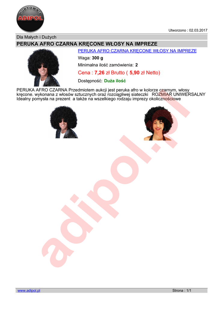 Utworzono : 02.03.2017 Dla Małych i Dużych PERUKA AFRO CZARNA KRĘCONE WŁOSY NA IMPREZE PERUKA AFRO CZARNA KRĘCONE WŁOSY NA IMPREZE Waga: 300 g Minimalna ilość zamówienia: 2 Cena : 7,26 zł Brutto ( 5,90 zł Netto) Dostępność: Duża ilość ad ip ol .p l PERUKA AFRO CZARNA Przedmiotem aukcji jest peruka afro w kolorze czarnym, włosy kręcone. wykonana z włosów sztucznych oraz rozciągliwej siateczki ROZMIAR UNIWERSALNY Idealny pomysła na prezent a także na wszelkiego rodzaju imprezy okolicznościowe www.adipol.pl Powered by TCPDF (www.tcpdf.org) Strona : 1/1
