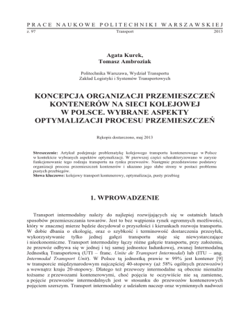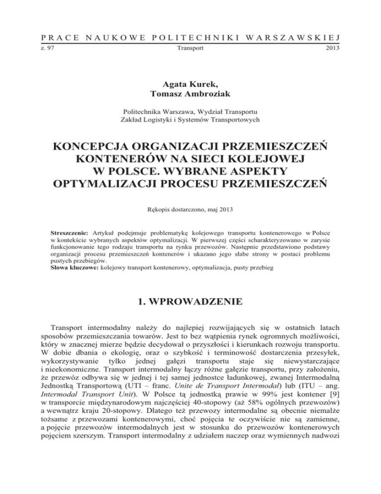 PRACE NAUKOWE POLITECHNIKI WARSZAWSKIEJ z. 97 Transport 2013 Agata Kurek, Tomasz Ambroziak Politechnika Warszawa, Wydzia Transportu Zakad Logistyki i Systemów Transportowych KONCEPCJA ORGANIZACJI PRZEMIESZCZE KONTENERÓW NA SIECI KOLEJOWEJ W POLSCE. WYBRANE ASPEKTY OPTYMALIZACJI PROCESU PRZEMIESZCZE Rkopis dostarczono, maj 2013 Streszczenie: Artyku podejmuje problematyk kolejowego transportu kontenerowego w Polsce w kontekcie wybranych aspektów optymalizacji. W pierwszej czci scharakteryzowano w zarysie funkcjonowanie tego rodzaju transportu na rynku przewozów. Nastpnie przedstawiono podstawy organizacji procesu przemieszcze kontenerów i ukazano jego sabe strony w postaci problemu pustych przebiegów. Sowa kluczowe: kolejowy transport kontenerowy, optymalizacja, pusty przebieg 1. WPROWADZENIE Transport intermodalny naley do najlepiej rozwijajcych si w ostatnich latach sposobów przemieszczania towarów. Jest to bez wtpienia rynek ogromnych moliwoci, który w znacznej mierze bdzie decydowa o przyszoci i kierunkach rozwoju transportu. W dobie dbania o ekologi, oraz o szybko i terminowo dostarczenia przesyek, wykorzystywanie tylko jednej gazi transportu staje si niewystarczajce i nieekonomiczne. Transport intermodalny czy róne gazie transportu, przy zaoeniu, e przewóz odbywa si w jednej i tej samej jednostce adunkowej, zwanej Intermodaln Jednostk Transportow (UTI – franc. Unite de Transport Intermodal) lub (ITU – ang. Intermodal Transport Unit). W Polsce t jednostk prawie w 99% jest kontener [9] w transporcie midzynarodowym najczciej 40-stopowy (a 58% ogólnych przewozów) a wewntrz kraju 20-stopowy. Dlatego te przewozy intermodalne s obecnie niemale tosame z przewozami kontenerowymi, cho pojcia te oczywicie nie s zamienne, a pojcie przewozów intermodalnych jest w stosunku do przewozów kontenerowych pojciem szerszym. Transport intermodalny z udziaem naczep oraz wymiennych nadwozi 312 Agata Kurek, Tomasz Ambroziak samochodowych stanowi nieco ponad 1% i dlatego w ujciu optymalizacji ten segment przewozów nie bdzie brany pod uwag. Intermodalny sposób przewozu towarów, niezalenie od rodzaju jednostki adunkowej pozwala wykorzysta najlepsze cechy rónych gazi transportu: adowno statków, bezpieczestwo i ekologi kolei, oraz moliwo dostarczenia adunku niemal w kade miejsce samochodami. Przyczynia si to do skrócenia czasu dostarczenia przesyki, zmniejsza koszty i, co nie mniej wane, jest przyjazne dla rodowiska. Rynek intermodalnych przewozów kolejowych w Polsce charakteryzuje si du dynamik rozwoju. Najwikszy wzrost, blisko 130%, odnotowano w latach 2004-2008 [9]. Fala kryzysu gospodarczego przypadajca na lata 2009/2010 przyczynia si do znacznego zahamowania tempa wzrostu przewozów, które zaczo przyspiesza dopiero w roku 2011. W 2012 roku przewieziono kolej ok. 639 tys. kontenerów, czyli ponad 30% wicej ni w roku 2011 i ponad 85% wicej ni w roku 2010 [9]. Pomimo tego od pocztku lat 90tych przewozy intermodalne nie przekraczaj ok. 3,5% ogólnej masy adunków przewoonych na sieci PKP, podczas gdy w krajach Unii Europejskiej wahaj si w okolicach 15% [9]. Plasuje to Polsk na jednym z ostatnich miejsc w Europie. Naley przy tym zauway, e Polska jest jednym z najwikszych rynków kolejowych w krajach Unii Europejskiej. Zajmuje drugie miejsce pod wzgldem wolumenu przewozów i czwarte pod wzgldem wykonanej pracy przewozowej. Jednoczenie warto podkreli bardzo korzystne, strategiczne wrcz pooenie geograficzne Polski na mapie szlaków transportowych. Z jednej strony, stanowic wschodni granic Unii Europejskiej, moe realizowa poczenia tranzytowe wschódzachód, z drugiej poprzez porty morskie poredniczy w przewozach adunków pónocpoudnie. 2. ZARYS ORGANIZACJI PRZEWOZÓW KONTENEROWYCH NA SIECI PKP Transport kontenerowy w Polsce opiera si na dwóch rodzajach infrastruktury, liniowej i punktowej. Infrastruktura liniowa to sie pocze drogowo-kolejowych, infrastruktura punktowa to punkty przeadunkowe, a wic terminale intermodalne morskie i ldowe. W 2011 roku wykorzystywano czynnie 26 terminali kontenerowych [9]. 5 z nich to terminale morskie: Batycki Terminal Kontenerowy w Gdyni, Gdyski Terminal Kontenerowy, Gdaski Terminal Kontenerowy, Gbokowodny Terminal Kontenerowy w Gdasku, Port Szczecin. Pozostae punkty to terminale ldowe kolejowo-drogowe oraz wewntrzgaziowe (np. Maaszewicze). Najwikszymi operatorami logistycznymi zarzdzajcymi terminalami ldowymi s Cargosped, PCC Intermodal, Polzug, Spedcont. Wród przewo ników kolejowych liderem jest PKP Cargo (72% udziau w rynku wg przewiezionych TEU za 2012 r.). Na kolejnych miejscach plasuj si Lotos Kolej (15,5%), DB Schenker (7%) oraz CTL Logistics (2,5%). Wród wszystkich terminali najwiksze znaczenie maj terminale morskie, Gdynia/Gdask (czny udzia w rynku ponad 30%) oraz kolejowo-drogowe w rodkowej i zachodniej czci Polski: Pozna, Warszawa, Koncepcja organizacji przemieszcze kontenerów na sieci kolejowej w Polsce … 313 Pruszków i ód . Wci podkrelana jest zbyt maa liczba terminali we wschodniej czci Polski, cho warto zauway, e rednia gsto w przeliczeniu na powierzchni wynosi 0,8 terminala na 10 tys. km2, a wic nie odbiega znacznie od przyjtej w Europie normy 0,9/10 tys. km2 [9]. Transport kontenerów w Polsce ma gównie charakter midzynarodowy, a dominujcy kierunek to wschód-zachód. Najpopularniejsze poczenie tworzymy wci z Niemcami. Z punktu widzenia organizacji przewozów, mona wyróni dwa sposoby przemieszania kontenerów: przewozy zwarte, przewozy wielogrupowe. Najefektywniejszym systemem zarówno pod wzgldem ekonomicznym jak i finansowym s przewozy odbywajce si w zwartych skadach pocigowych. Pocigi takie prowadzone zazwyczaj jedn lokomotyw trafiaj bezporednio od nadawcy do odbiorcy. Do tego rodzaju organizacji przewozów wliczaj si pocigi blokowe i wahadowe [8]. S one zestawiane bezporednio w terminalu, a nastpnie z pominiciem operacji wykonywanych na stacjach manewrowych i rozrzdowych docieraj do odbiorcy. Pocigi wahadowe cechuje dodatkowo s