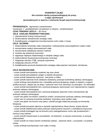 KONSPEKT ZAJĘĆ dla uczniów szkoły przysposabiającej do pracy z zajęć sportowych (prowadzonych w oparciu o elementy terapii psychomotorycznej) PROWADZĄCA: Agnieszka Lewandowska Uczniowie z upośledzeniem umysłowym w stopniu umiarkowanym CZAS TRWANIA LEKCJI – 60 minut CELE OGÓLNE /PERSPEKTYWICZNE/: 1. Usprawnianie funkcji motorycznych 2. Doskonalenie świadomości swojego ciała 3. Kształtowanie umiejętności koordynowania ruchu ciała z mową CELE GŁÓWNE: 1. doskonalenie schematu ciała /nazywanie i wskazywanie poszczególnych części ciała/ 2. wzmacnianie reakcji równoważnych ciała 3. wzmacnianie stabilizacji tułowia i barków 4. uczenie się sekwencji czynności 5. regulacja napięcia mięśniowego w obrębie całego ciała 6. doskonalenie obustronnej koordynacji ruchowej 7. integracja odruchu TOB –pozycja wyprostna 8. integracja odruchu ATOS 9. kształtowanie poczucia świadomości swojego ciała poprzez ćwiczenia dociskowe CELE SZCZEGÓŁOWE: - uczeń potrafi samodzielnie rozebrać się oraz ubrać - uczeń potrafi samodzielnie usiąść w siadzie skrzyżnym - uczeń potrafi świadomie wykonać ćwiczenie w kółku - uczeń potrafi wykonać krok odstawno-dostawny podczas konkretnej zabawy rytmizującej - uczeń próbuje samodzielnie lub z niewielka pomocą terapeuty usiąść w siadzie z nogami podkurczonymi, złapać się za stopy i wykonać nimi ruch obrotowy na zewnątrz i do wewnątrz - uczeń potrafi samodzielnie lub z pomocą terapeuty wykonywać ruch naprzemienny nogami podczas zabawy rytmizującej - uczeń potrafi samodzielnie lub z pomocą terapeuty wykonać ruchy rozmachowe rąk podczas zabawy rytmizującej - uczeń wie gdzie ma biodra i potrafi je unieść i przytrzymać podczas zabawy rytmizującej - uczeń wie co oznacza komenda werbalna: trzymamy ręce wzdłuż ciała - uczeń wie gdzie ma brzuch oraz plecy i potrafi przyjąć właściwą pozycję na komendę terapeuty - uczeń potrafi poruszać rękoma w sposób naprzemienny /lewa strona, prawa strona/ - uczeń potrafi stabilizować tułów podczas wykonywania ćwiczeń o charakterze fizycznym - uczeń potrafi podciągać się na brzuchu przy zaangażowaniu ruchu rąk (przedramion i ramion) oraz barków - uczeń potrafi maszerować w przysiadzie, na kolanach, w pozycji czworaczej i w pozycji półprzysiadu - uczeń potrafi na miarę swoich możliwości pełzać, wykonać skoki z przysiadu i na jednej nodze - uczeń próbuje koordynować ruch ciała z mową 1 - uczeń potrafi samodzielnie lub z pomocą terapeuty powtarzać krótkie, rytmizowane teksty piosenek i wierszy niezbędnych do wykonywania ćwiczeń o charakterze psychomotorycznym - uczeń potrafi samodzielnie lub z pomocą terapeuty różnicować strony prawo-lewo - uczeń zna kolejność wykonywanych ćwiczeń i potrafi je nazwać – ważny czynnik antycypacji i organizacji w czasie, uczeń uzyskuje kontrolę nad czynnościami, nad własnym ciałem, co daje mu możliwość przewidywania sukcesu - uczeń potrafi stać w szeregu, jeden obok drugiego i pilnować stałego miejsca ćwiczeń - uczeń kontroluje swoje zachowanie - uczeń reaguje na komendy werbalne terapeuty - uczeń potrafi się przywitać i pożegnać z terapeutą PRZEBIEG ZAJĘĆ I CZĘŚĆ LEKCJI ZAJĘCIA WSTĘPNE 1. Przywitanie (podanie ręki, popatrzenie w oczy, powiedzenie dzień dobry) – jako akt integracji kilku obszarów mózgowych: wzroku /spojrzenie/, mowy, ruchu dłoni. 2. Przebieranie się w strój do gimnastyki – dotyczy praksji ubierania, schematu ciała, organizacji czynności. 3. Ćwiczenia indukcyjne (pierwszy etap ćwiczeń ruchowych): indukowanie ruchów zamierzonych, ich kontrolowanie, podawanie sygnału do zahamowania oraz stymulacja czucia głębokiego sprzężonego z mową i śpiewem: - piosenka „Karuzela” (tworzenie koła, ćwiczenia kroku odstawno - dostawnego, utrzymywanie rytmu, śpiewanie piosenki) - piosenka „Kręcą się stopy” (wzbudzanie świadomości ciała, stymulacja czucia głębokiego, ćwiczenia separujące ruch stóp) - piosenka „Pociąg” (leżenie na plecach, ćwiczenia koordynacji ruchowej nóg, czucie głębokie) - wiersz „Lata mucha” (ćwiczenia rozmachowe rąk, stabilizacja tułowia i barków, siad skrzyżny, czucie głębokie) - wiersz „Pif – paf” ( ćwiczenia rozmachowe rąk, stabilizacja tułowia i barków, siad skrzyżny, czucie głębokie) - piosenka „Jawor” (ćwiczenia stabilizacji tułowia i bioder, czucie głębokie) - piosenka „Jadą misie” (ćwiczenia w leżeniu na plecach, ćwiczenia naprzemiennej koordynacji ruchowej nóg, ćwiczenia ruchu bioder i barków, czucie głębokie) II CZĘŚĆ LEKCJI Ćwiczenia dużej motoryki – jako czynności integrujące ruch i przestrzeń. Uczniowie odpoznają i nazywają kolejno postaci osób i zwierząt na obrazkach, a następnie według ustalonego porządku naśladują wcześniej poznane wzorce ruchowe. Do każdego ćwiczenia przyporządkowana jest piosenka lub krótki wierszowany tekst. 1. Kaczka – marsz w przysiadzie z ramionami złączonymi z przodu, akcent na oparciu całej stopy na podłodze i na koordynacji wzrokowo-ruchowej (ciężar ciała, stabilizacja jako punkt wyjścia dla prawidłowego ruchu, prawidłowa pozycja głowy, koncentracja), 2. Pinokio – marsz na kolanach (czucie głębokie, docisk na kolana, oddziaływanie na pozycje pleców i szyi, obustronna naprzemienna koordynacja ruchowa), 3.Piesek – marsz w pozycji czworaczej (czucie głębokie, ruch naprzemienny rąk i nóg, 2 integracja ATOS, kształtowanie łuków dłoniowych niezbędnych do kształtowania chwytu pisarskiego), 4. Zając – skoki z przysiadu z podparciem na dłonie (czucie głębokie, równowaga, grawitacja, koordynacja rąk i nóg w pozycji góra-dół), 5. Krokodyl – pełzanie na brzuchu (czucie tułowia, ciężar ciała na ramionach i przedramionach, integracja TOB – pozycja wyprostna, ćwiczenia koordynacji ruchowej górnej części ciała), 6. Spacer 