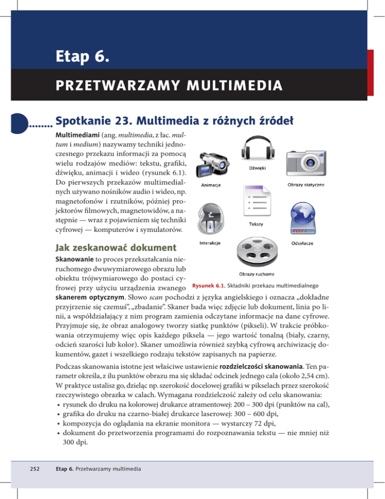 Etap 6. Przetwarzamy multimedia Spotkanie 23. Multimedia z różnych źródeł Multimediami (ang. multimedia, z łac. mul- tum i medium) nazywamy techniki jednoczesnego przekazu informacji za pomocą wielu rodzajów mediów: tekstu, grafiki, dźwięku, animacji i wideo (rysunek 6.1). Do pierwszych przekazów multimedialnych używano nośników audio i wideo, np. magnetofonów i rzutników, później projektorów filmowych, magnetowidów, a następnie — wraz z pojawieniem się techniki cyfrowej — komputerów i symulatorów. Jak zeskanować dokument Skanowanie to proces przekształcania nie- ruchomego dwuwymiarowego obrazu lub obiektu trójwymiarowego do postaci cyfrowej przy użyciu urządzenia zwanego Rysunek 6.1. Składniki przekazu multimedialnego skanerem optycznym. Słowo scan pochodzi z języka angielskiego i oznacza „dokładne przyjrzenie się czemuś”, „zbadanie”. Skaner bada więc zdjęcie lub dokument, linia po linii, a współdziałający z nim program zamienia odczytane informacje na dane cyfrowe. Przyjmuje się, że obraz analogowy tworzy siatkę punktów (pikseli). W trakcie próbkowania otrzymujemy więc opis każdego piksela — jego wartość tonalną (biały, czarny, odcień szarości lub kolor). Skaner umożliwia również szybką cyfrową archiwizację dokumentów, gazet i wszelkiego rodzaju tekstów zapisanych na papierze. Podczas skanowania istotne jest właściwe ustawienie rozdzielczości skanowania. Ten parametr określa, z ilu punktów obrazu ma się składać odcinek jednego cala (około 2,54 cm). W praktyce ustalisz go, dzieląc np. szerokość docelowej grafiki w pikselach przez szerokość rzeczywistego obrazka w calach. Wymagana rozdzielczość zależy od celu skanowania: •rysunek do druku na kolorowej drukarce atramentowej: 200 – 300 dpi (punktów na cal), •grafika do druku na czarno-białej drukarce laserowej: 300 – 600 dpi, •kompozycja do oglądania na ekranie monitora — wystarczy 72 dpi, •dokument do przetworzenia programami do rozpoznawania tekstu — nie mniej niż 300 dpi. 252 Spotkanie Etap 6. Przetwarzamy 23. Multimedia multimedia z różnych źródeł zapamiętaj Możesz wykorzystać cudze obrazy tylko wtedy, gdy masz na to pozwolenie ich autora. Zazwyczaj do zakupionego skanera jest dołączone specjalizowane oprogramowanie. Jeśli jednak Twój skaner jest zgodny ze standardem TWAIN (ang. Technology Without An Interesting Name), podłącz go do portu USB komputera, a komputer sam zainstaluje potrzebne sterowniki. Ikona skanera pojawi się w oknie Urządzenia i drukarki, które otwiera się poprzez menu Start/Urządzenia i drukarki. Aby pobrać obraz ze skanera, kliknij ikonę skanera prawym przyciskiem myszy i wybierz opcję Rozpocznij skanowanie. Wtedy zostanie otwarty program obsługi skanera. Aby zobaczyć roboczy podgląd dokumentu, naciśRysunek 6.2. Okno programu dostarczonego ze skanerem nij odpowiedni przycisk — w naszym przypadku jest to Podgląd. Dokument zostanie szybko zeskanowany w niskiej rozdzielczości. Następnie wskaż obszar, który chcesz zeskanować, rozciągając nad nim ramkę zaznaczania, i kliknij przycisk Skanuj (rysunek 6.2). Programy do skanowania dostarczane wraz z zakupionym urządzeniem mogą się różnić wyglądem i działaniem. Poniżej opisano parametry, na które warto zwrócić uwagę, a które zazwyczaj pojawiają się w tego typu programach, choć mogą być inaczej nazwane przez producenta: Format koloru — służy do skanowania obiektów w kolorze; możesz wybrać pełen kolor albo skalę odcieni szarości lub wersję czarno-białą. Typ pliku — umożliwia wybór formatu pliku wyjściowego (JPEG, TIFF, PNG, BMP). Rozdzielczość (DPI) — umożliwia określenie stopnia dokładności skanowania. Jasność, Kontrast — pozwalają wstępnie dostosować parametry kolorów (jasność i kontrast). Jak uzyskać doskonałe skany •W przypadku skanowania elementów z czasopisma, gazety lub książki wybierz w pro- gramie skanującym opcję derasteryzującą (np. Derasteryzacja, Descreen), aby usunąć ewentualny efekt mory. Efekt ten powstaje, gdy skanowany wzór (włókna materiału, Spotkanie 23. Multimedia z różnych źródeł 253 równoległe linie) pokrywa się z rozdzielczością czujnika obrazu, co w efekcie powoduje powstanie nieistniejącej w rzeczywistości faktury. •Unikaj korzystania z tzw. interpolowanej rozdzielczości skanera i używaj wyłącznie optycznej. Podobnie jak w cyfrowych aparatach fotograficznych, ten sam efekt powiększenia możesz w każdej chwili uzyskać podczas obróbki w dowolnym edytorze graficznym. •Jeśli zdjęcie wielkości pocztówki chcesz wydrukować na dwa razy większej kartce A4 przy użyciu kolorowej drukarki atramentowej, zamiast zalecanej rozdzielczości 200 – 300 dpi zastosuj dwukrotnie większą. •Przed rozpoczęciem skanowania wyczyść szybę skanera. Pył, włosy i odciski palców mogą zepsuć efekt Twojej pracy. Nawet jeśli nie możesz dostrzec takich zabrudzeń na szybie skanera, skanowanie z dużą rozdzielczością je uwidoczni. •Obraz przeznaczony dla programu typu OCR (komputerowe rozpoznawanie tekstu) powinien być zapisany w odcieniach szarości, najlepiej w formacie nieskompresowanym. Czym jest OCR Wynikiem skanowania jest zawsze obraz graficzny. Dotyczy to także dokumentów tekstowych. Aby móc edytować zeskanowany tekst, musisz zastosować oprogramowanie typu OCR (ang. Optical Character Recognition). Pozwala ono uwolnić użytkownika komputera od żmudnej, odtwórczej pracy, polegającej na ręcznym przepisywaniu tekstu. ICR (ang. Intelligent Character Recognition) to technika zmierzająca do rozpoznawania pisma odręcznego z użyciem mechanizmów sieci neuronowych, przypominających działanie ludzkiego mózgu. Znanymi programami OCR są komercyjne aplikacje FineReader i ReadIris. Trudno wskazać ich bezpłatne odpowiedniki. Na stronie http://www.free-ocr.com/ jest dostępne narzędzie tego typu, które dz