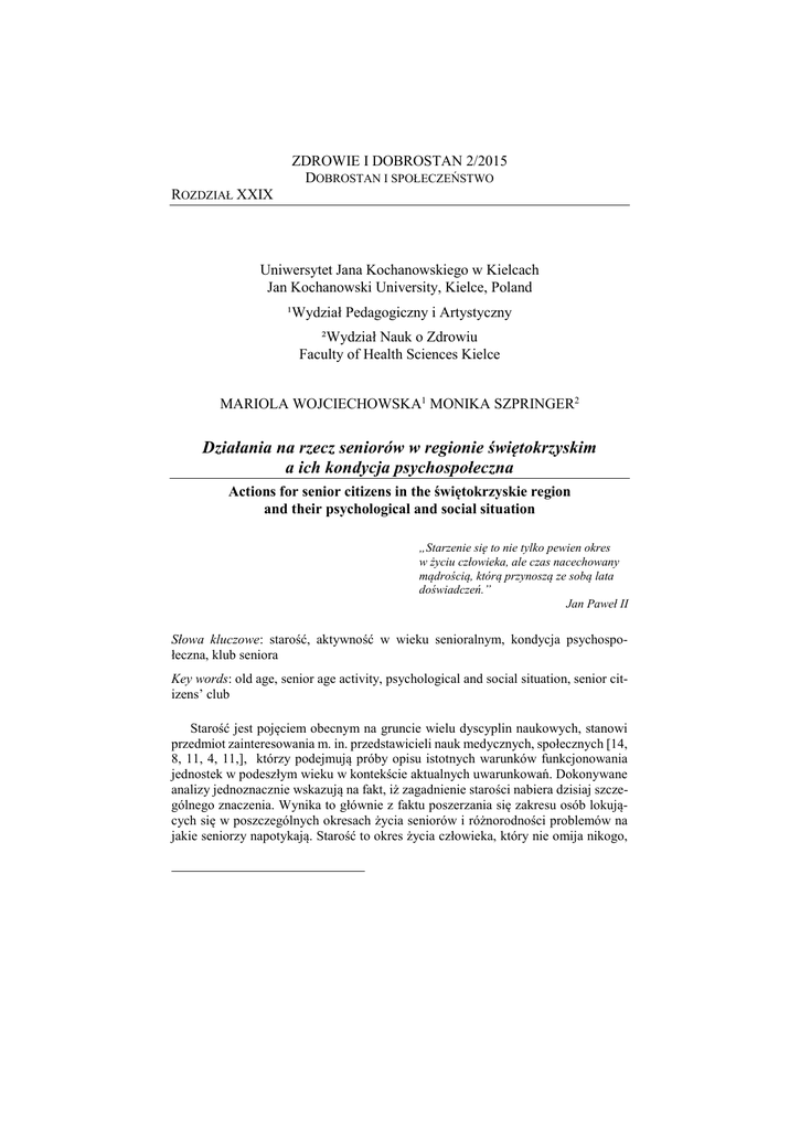 ZDROWIE I DOBROSTAN 2/2015 DOBROSTAN I SPOŁECZEŃSTWO ROZDZIAŁ XXIX Uniwersytet Jana Kochanowskiego w Kielcach Jan Kochanowski University, Kielce, Poland ¹Wydział Pedagogiczny i Artystyczny ²Wydział Nauk o Zdrowiu Faculty of Health Sciences Kielce MARIOLA WOJCIECHOWSKA1 MONIKA SZPRINGER2 Działania na rzecz seniorów w regionie świętokrzyskim a ich kondycja psychospołeczna Actions for senior citizens in the świętokrzyskie region and their psychological and social situation „Starzenie się to nie tylko pewien okres w życiu człowieka, ale czas nacechowany mądrością, którą przynoszą ze sobą lata doświadczeń.” Jan Paweł II Słowa kluczowe: starość, aktywność w wieku senioralnym, kondycja psychospołeczna, klub seniora Key words: old age, senior age activity, psychological and social situation, senior citizens’ club Starość jest pojęciem obecnym na gruncie wielu dyscyplin naukowych, stanowi przedmiot zainteresowania m. in. przedstawicieli nauk medycznych, społecznych [14, 8, 11, 4, 11,], którzy podejmują próby opisu istotnych warunków funkcjonowania jednostek w podeszłym wieku w kontekście aktualnych uwarunkowań. Dokonywane analizy jednoznacznie wskazują na fakt, iż zagadnienie starości nabiera dzisiaj szczególnego znaczenia. Wynika to głównie z faktu poszerzania się zakresu osób lokujących się w poszczególnych okresach życia seniorów i różnorodności problemów na jakie seniorzy napotykają. Starość to okres życia człowieka, który nie omija nikogo, ZDROWIE I DOBROSTAN 2/2015 Dobrostan i społeczeństwo lecz może przebiegać w różnorodny sposób. Tym samym, wymaga konkretnego zabezpieczenia i nieustannego wspierania w tym trudnym i szczególnym czasie życia człowieka. Seniorzy zwykle traktowani są jako grupa społeczna o minimalnych potrzebach. Jedynie konieczność zabezpieczenia lekarskiego i pielęgniarskiego nie budzi większych zastrzeżeń. Mimo pewnych starań w pomocy seniorom w spędzaniu przez nich czasu wolnego, dostęp do tych form jest w gruncie rzeczy ograniczony. Należy jednak docenić starania środowisk lokalnych dla wsparcia seniorów w utrzymaniu optymalnego poziomu aktywności życiowej [13]. Jednak seniorzy odczuwają coraz intensywniej trudności dnia codziennego, a szczególnie pogarszającą się sytuację ekonomiczną i stan zdrowia, przeżywają stan osamotnienia i samotności, różnego rodzaju lęki. W zamyśle, końcowy etap życia człowieka powinien mieć pełnię satysfakcji, zadowolenia, tymczasem okazuje się czasem pełnym niepokoju, zagrożeń, bólu. W literaturze przedmiotu znajdujemy liczne definicje pojęć starości i starzenia się, należy przy tym zaznaczyć, że tłumaczenie tych pojęć nie zostało w pełni ujednolicone. Starzenie się ujmowane jest jako proces dokonujący się w dość długim czasie, z kolei pojęcie starość ujmowana jest jako okres w życiu, jego faza, nawet zjawisko będące konsekwencją starzenia się człowieka. Na trudności definicyjne wymienionych pojęć wskazywał przed laty A. Kępiński: „Starość należy do tych pojęć, które, choć dla każdego w pospolitym znaczeniu oczywiste, są trudne, a nawet niemożliwe do naukowego zdefiniowania. Klasycznym przykładem takiego pojęcia, trudnego do naukowego zdefiniowania jest życie, którego nikt jeszcze nie potrafi określić bez zastrzeżeń. Starość jest fazą końcową, po której przychodzi tylko śmierć, w konsekwencji brak definicji życia przekreśla możliwość zdefiniowania jednego z jego okresów w sposób bezdyskusyjny” [5]. Pojęcie „starzenia się” najczęściej odnosi się do wymiaru / kontekstu biologicznego, wyrazicielami tego stanowiska mogą być określenia proponowane przed laty przez J. Piotrowskiego. Autor pisze: „starzenie jest procesem zmian zachodzących w ustroju w ciągu całego życia, doprowadzając – wraz z upływem lat – do osłabienia funkcji poszczególnych organów i ostatecznie do śmierci”. [7] Z kolei A. Leszczyńska – Rejchert wskazuje na dwuaspektowość omawianego pojęcia i twierdzi, ze starzenie się należy ujmować jako ”nieuchronny, powszechny, długotrwały, zróżnicowany i wielopłaszczyznowy proces (zachodzący w wymiarze biologicznym, psychologicznym i społecznym), który zależy od człowieka i od czynników społecznych, ekonomicznych, biologicznych, psychologicznych, ekologicznych, historycznych i kulturowych” [6]. Współczesne próby ujęcia pojęcia „starość” jednoznacznie potwierdzają szerokoprofilowe rozumienie pojęcia. Dowodzą tego stanowiska M. B. Pecyny, B. Sielowy, J. Staręgi – Piasek, czy A. Lisowskiego. Na przykład B. Sielowa wskazuje na starość jako na „okres stopniowego pogarszania się biologicznych i społecznych funkcji człowieka, narastania upośledzenia sprawności oraz ograniczania kontaktów ze środowiskiem zewnętrznym, na co nakłada się szereg czynników środowiskowych i zdrowotnych” [9]. Z pojęciem „starość” bezpośrednio związane jest pojęcie „aktywność osób starszych”, którą W. Szewczuk tłumaczy jako warunek pomyślnego rozwoju, pisząc, że 404 Mariola Wojciechowska, Monika Szpringer Działania na rzecz seniorów w regionie świętokrzyskim a ich kondycja psychospołeczna „[…] do istoty samego życia należy aktywność. Organizm z natury swej jest ściśle związany z otaczającym światem, jego istnienie opiera się na nieustannej regulacji stosunku z tym światem. Ta regulacja jest aktywnością . Zmienia się tylko jej zakres i poziom” [12]. Powszechnie uznaje się, że zakres aktywności uznanej przez jednostkę stanowi wyraz jego zadowolenia z życia, oceny własnej wartości, oceny przydatności własnej. Gerontolodzy dowodzą, że aktywność jednostki w późnym wieku przyczynia się do lepszej sprawności psychofizycznej, wydłuża wiek życia, poprawia radzenie sobie z problemami codziennego życia, rzadziej wskazują na osamotnienie