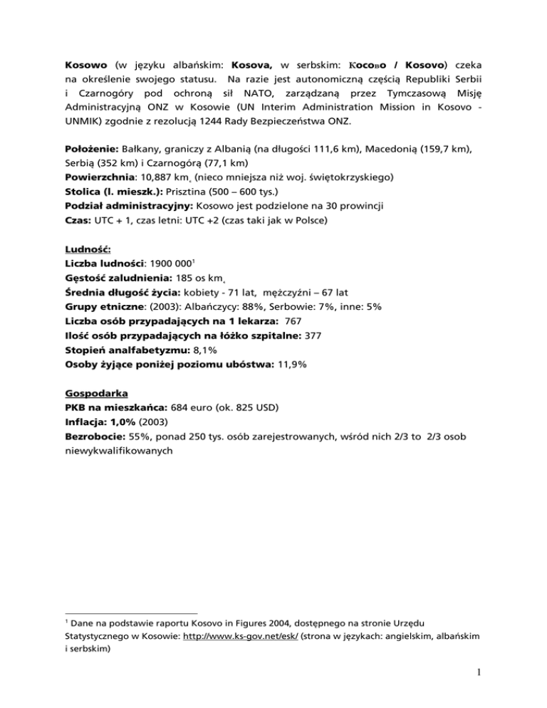 Kosowo (w języku albańskim: Kosova, w serbskim: Кocoвo / Kosovo) czeka na określenie swojego statusu. i Czarnogóry pod ochroną Na razie jest autonomiczną częścią Republiki Serbii sił NATO, zarządzaną przez Tymczasową Misję Administracyjną ONZ w Kosowie (UN Interim Administration Mission in Kosovo UNMIK) zgodnie z rezolucją 1244 Rady Bezpieczeństwa ONZ. Położenie: Bałkany, graniczy z Albanią (na długości 111,6 km), Macedonią (159,7 km), Serbią (352 km) i Czarnogórą (77,1 km) Powierzchnia: 10,887 km˛ (nieco mniejsza niż woj. świętokrzyskiego) Stolica (l. mieszk.): Prisztina (500 – 600 tys.) Podział administracyjny: Kosowo jest podzielone na 30 prowincji Czas: UTC + 1, czas letni: UTC +2 (czas taki jak w Polsce) Ludność: Liczba ludności: 1900 0001 Gęstość zaludnienia: 185 os km˛ Średnia długość życia: kobiety - 71 lat, mężczyźni – 67 lat Grupy etniczne: (2003): Albańczycy: 88%, Serbowie: 7%, inne: 5% Liczba osób przypadających na 1 lekarza: 767 Ilość osób przypadających na łóżko szpitalne: 377 Stopień analfabetyzmu: 8,1% Osoby żyjące poniżej poziomu ubóstwa: 11,9% Gospodarka PKB na mieszkańca: 684 euro (ok. 825 USD) Inflacja: 1,0% (2003) Bezrobocie: 55%, ponad 250 tys. osób zarejestrowanych, wśród nich 2/3 to 2/3 osob niewykwalifikowanych 1 Dane na podstawie raportu Kosovo in Figures 2004, dostępnego na stronie Urzędu Statystycznego w Kosowie: http://www.ks-gov.net/esk/ (strona w językach: angielskim, albańskim i serbskim) 1 Jak dojechać? Do Kosowa najłatwiej dolecieć samolotami węgierskich linii lotniczych Malev. lot do Prisztiny wymaga przesiadki na lotnisku w Budapeszcie. W 2005 roku bilet kosztował około 1550 złotych. Najlepiej kupić go bezpośrednio w biurze Maleva w Warszawie: jest wtedy najtańszy, choć – uwaga – trzeba płacić gotówką. Podróż trwa wraz z przesiadkami około 5 godzin. Do Prisztiny można się również dostać liniami austriackimi (ok. 2350 złotych, przesiadka w Wiedniu). W sytuacjach awaryjnych można lecieć do Skopje w Macedonii a stamtąd dostać się do Kosowa autobusem lub taksówką. Do Prisztiny jedzie się około 2 godzin. Trzeba się liczyć z wydatkiem rzędu nawet 100 euro. Można również jechać samochodem: przez Czarnogórę. Zajmuje to minimum dwa dni z Warszawy a trasa przez Węgry, Serbię i Czarnogórę niesie w sobie wiele, przede wszystkim granicznych niespodzianek. Nie jest jednak tak uciążliwa, jakby się mogło wydawać i bardzo ciekawa – no i posiadanie samochodu, bardzo ułatwia poruszanie się na miejscu. Transport lokalny Całe Kosowo pokryte jest siecią, bądź wygodnych autobusów (klimatyzacja, kierowca często rozdaje cukierki i wodę, są pokazy wideo), bądź mniej wygodnych minibusów, które odjeżdżają, w zależności od kierunku, z dwóch miejsc w Prisztinie. W autobusach bez problemu dostaniemy bilet, w minibusach biletów brak – płaci się do ręki kierowcy. Transport jest dość drogi: bilety kosztują nawet 6 euro za dystans około 100 km Taksówki: jest ich dużo, dają rachunki. Z lotniska do Prisztiny można się dostać za około 10-11 euro. Na podróżnych, którzy zjawiają się w Prisztinie po raz pierwszy czekają taksówki za około 20 euro, warto więc zorganizować sobie odbiór z lotniska przy pomocy partnerów, którzy zamówią nam taksówkę. Poruszanie się własnym samochodem jest bardzo bezpieczne. Wszędzie pełno stacji benzynowych, myjni, warsztatów naprawczych, wulkanizatorów oraz małych zajazdów, moteli i restauracji. Wiza i przepisy wjazdowe Dla Polaków nie ma wiz ani opłat wjazdowych. Jak informuje polskie MSZ wjeżdżając a teren Serbii i Czarnogóry dobrze jest zgłosić wwożoną kwotę powyżej 2000 euro i uzyskać potwierdzenie wwozu, dzięki temu nie będzie problemu z ewentualnym wywozem gotówki. 2 Waluta i przepisy celne. Walutą obowiązującą w Kosowie jest euro. Bez problemu można robić przelewy bankowe – opłaty nie odbiegają od standardowych kosztów wysyłki pieniędzy do innych krajów. W niektórych miejscach w Prisztinie można skorzystać z bankomatu, nie należy jednak na to liczyć zbyt mocno. Lokalizację bankomatów można sprawdzić na stronach: http://www.mastercard.com/atmlocator/index.jsp - dla kart Maestro, Mastercard (strona w jęz. ang.) http://visa.via.infonow.net/locator/global/jsp/SearchPage.jsp - dla kart Visa (strona w jęz. ang.) Język i porozumiewanie się Dominuje język albański, a konkretnie kosowski dialekt, co oznacza, że teksty tłumaczone przez Albańczyków z Albanii nie zawsze są tu w pełni zrozumiałe. Drugi język to serbski – w enklawach i turecki – którym mówi turecka mniejszość. Wielu, zwłaszcza nieco starszych Albańczyków, świetnie zna serbski, ale zdecydowanie nie należy ich namawiać do korzystania z jego znajomości. Po angielsku mówią niemal wszyscy lokalni pracownicy organizacji międzynarodowych i wielu studentów. Noclegi Hoteli ciągle przybywa. Nocleg w dwójce z łazienką kosztuje minimum 20 euro od osoby i zwłaszcza w Prisztinie trudno liczyć na lepszą cenę. Są wprawdzie hotele (np. Sara), które proponują 30 euro, ale jednocześnie wynajmują pokoje na godziny. Największe – Grand, Iliria, Baci w Prisztinie – kosztują około 70 euro, a standard pierwszych dwóch sprawia, że nie są to miejsca warte tej ceny. W pozostałych miejscowościach Kosowa, nawet w dużych miastach, jak Prizren, Peje lub Gjilan hotele są w cenie około 18 Euro od osoby w pokoju dwuosobowym. Warunki higieniczno – sanitarne Czasami nie ma prądu a w związku z tym i wody. Hotele radzą sobie z tym na ogół bardzo dobrze i w razie wyłączenia prądu uruchamiają generatory. Nie ma kwestii, które wymagałyby specjalnych przygotowań. 3 Sale szkoleniowe, ośrodki szkoleniowe Sale szkoleniowe najczęściej wynajmuje się w hotelach – i wtedy oczekuje się, że będzie również zamówiona przerwa kawowa i lunch. W