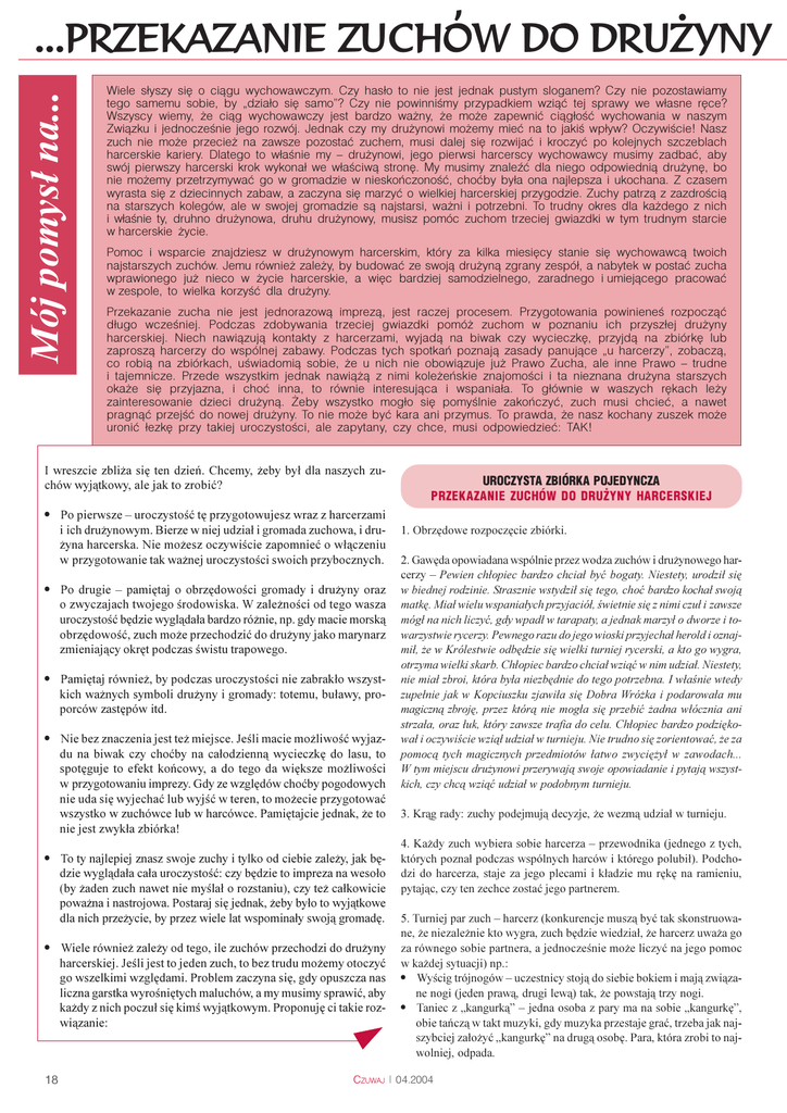 Mój pomys³ na... ...PRZEKAZANIE ZUCHÓW DO DRU¯YNY Wiele s³yszy siê o ci¹gu wychowawczym. Czy has³o to nie jest jednak pustym sloganem? Czy nie pozostawiamy tego samemu sobie, by „dzia³o siê samo”? Czy nie powinniœmy przypadkiem wzi¹æ tej sprawy we w³asne rêce? Wszyscy wiemy, ¿e ci¹g wychowawczy jest bardzo wa¿ny, ¿e mo¿e zapewniæ ci¹g³oœæ wychowania w naszym Zwi¹zku i jednoczeœnie jego rozwój. Jednak czy my dru¿ynowi mo¿emy mieæ na to jakiœ wp³yw? Oczywiœcie! Nasz zuch nie mo¿e przecie¿ na zawsze pozostaæ zuchem, musi dalej siê rozwijaæ i kroczyæ po kolejnych szczeblach harcerskie kariery. Dlatego to w³aœnie my – dru¿ynowi, jego pierwsi harcerscy wychowawcy musimy zadbaæ, aby swój pierwszy harcerski krok wykona³ we w³aœciw¹ stronê. My musimy znaleŸæ dla niego odpowiedni¹ dru¿ynê, bo nie mo¿emy przetrzymywaæ go w gromadzie w nieskoñczonoœæ, choæby by³a ona najlepsza i ukochana. Z czasem wyrasta siê z dziecinnych zabaw, a zaczyna siê marzyæ o wielkiej harcerskiej przygodzie. Zuchy patrz¹ z zazdroœci¹ na starszych kolegów, ale w swojej gromadzie s¹ najstarsi, wa¿ni i potrzebni. To trudny okres dla ka¿dego z nich i w³aœnie ty, druhno dru¿ynowa, druhu dru¿ynowy, musisz pomóc zuchom trzeciej gwiazdki w tym trudnym starcie w harcerskie ¿ycie. Pomoc i wsparcie znajdziesz w dru¿ynowym harcerskim, który za kilka miesiêcy stanie siê wychowawc¹ twoich najstarszych zuchów. Jemu równie¿ zale¿y, by budowaæ ze swoj¹ dru¿yn¹ zgrany zespó³, a nabytek w postaæ zucha wprawionego ju¿ nieco w ¿ycie harcerskie, a wiêc bardziej samodzielnego, zaradnego i umiej¹cego pracowaæ w zespole, to wielka korzyœæ dla dru¿yny. Przekazanie zucha nie jest jednorazow¹ imprez¹, jest raczej procesem. Przygotowania powinieneœ rozpocz¹æ d³ugo wczeœniej. Podczas zdobywania trzeciej gwiazdki pomó¿ zuchom w poznaniu ich przysz³ej dru¿yny harcerskiej. Niech nawi¹zuj¹ kontakty z harcerzami, wyjad¹ na biwak czy wycieczkê, przyjd¹ na zbiórkê lub zaprosz¹ harcerzy do wspólnej zabawy. Podczas tych spotkañ poznaj¹ zasady panuj¹ce „u harcerzy”, zobacz¹, co robi¹ na zbiórkach, uœwiadomi¹ sobie, ¿e u nich nie obowi¹zuje ju¿ Prawo Zucha, ale inne Prawo – trudne i tajemnicze. Przede wszystkim jednak nawi¹¿¹ z nimi kole¿eñskie znajomoœci i ta nieznana dru¿yna starszych oka¿e siê przyjazna, i choæ inna, to równie interesuj¹ca i wspania³a. To g³ównie w waszych rêkach le¿y zainteresowanie dzieci dru¿yn¹. ¯eby wszystko mog³o siê pomyœlnie zakoñczyæ, zuch musi chcieæ, a nawet pragn¹æ przejœæ do nowej dru¿yny. To nie mo¿e byæ kara ani przymus. To prawda, ¿e nasz kochany zuszek mo¿e uroniæ ³ezkê przy takiej uroczystoœci, ale zapytany, czy chce, musi odpowiedzieæ: TAK! I wreszcie zbli¿a siê ten dzieñ. Chcemy, ¿eby by³ dla naszych zuchów wyj¹tkowy, ale jak to zrobiæ? · Po pierwsze – uroczystoœæ tê przygotowujesz wraz z harcerzami i ich dru¿ynowym. Bierze w niej udzia³ i gromada zuchowa, i dru¿yna harcerska. Nie mo¿esz oczywiœcie zapomnieæ o w³¹czeniu w przygotowanie tak wa¿nej uroczystoœci swoich przybocznych. · Po drugie – pamiêtaj o obrzêdowoœci gromady i dru¿yny oraz o zwyczajach twojego œrodowiska. W zale¿noœci od tego wasza uroczystoœæ bêdzie wygl¹da³a bardzo ró¿nie, np. gdy macie morsk¹ obrzêdowoœæ, zuch mo¿e przechodziæ do dru¿yny jako marynarz zmieniaj¹cy okrêt podczas œwistu trapowego. · Pamiêtaj równie¿, by podczas uroczystoœci nie zabrak³o wszystkich wa¿nych symboli dru¿yny i gromady: totemu, bu³awy, proporców zastêpów itd. · Nie bez znaczenia jest te¿ miejsce. Jeœli macie mo¿liwoœæ wyjazdu na biwak czy choæby na ca³odzienn¹ wycieczkê do lasu, to spotêguje to efekt koñcowy, a do tego da wiêksze mo¿liwoœci w przygotowaniu imprezy. Gdy ze wzglêdów choæby pogodowych nie uda siê wyjechaæ lub wyjœæ w teren, to mo¿ecie przygotowaæ wszystko w zuchówce lub w harcówce. Pamiêtajcie jednak, ¿e to nie jest zwyk³a zbiórka! · To ty najlepiej znasz swoje zuchy i tylko od ciebie zale¿y, jak bêdzie wygl¹da³a ca³a uroczystoœæ: czy bêdzie to impreza na weso³o (by ¿aden zuch nawet nie myœla³ o rozstaniu), czy te¿ ca³kowicie powa¿na i nastrojowa. Postaraj siê jednak, ¿eby by³o to wyj¹tkowe dla nich prze¿ycie, by przez wiele lat wspomina³y swoj¹ gromadê. · Wiele równie¿ zale¿y od tego, ile zuchów przechodzi do dru¿yny harcerskiej. Jeœli jest to jeden zuch, to bez trudu mo¿emy otoczyæ go wszelkimi wzglêdami. Problem zaczyna siê, gdy opuszcza nas liczna garstka wyroœniêtych maluchów, a my musimy sprawiæ, aby ka¿dy z nich poczu³ siê kimœ wyj¹tkowym. Proponujê ci takie rozwi¹zanie: 18 UROCZYSTA ZBIÓRKA POJEDYNCZA PRZEKAZANIE ZUCHÓW DO DRU¯YNY HARCERSKIEJ 1. Obrzêdowe rozpoczêcie zbiórki. 2. Gawêda opowiadana wspólnie przez wodza zuchów i dru¿ynowego harcerzy – Pewien ch³opiec bardzo chcia³ byæ bogaty. Niestety, urodzi³ siê w biednej rodzinie. Strasznie wstydzi³ siê tego, choæ bardzo kocha³ swoj¹ matkê. Mia³ wielu wspania³ych przyjació³, œwietnie siê z nimi czu³ i zawsze móg³ na nich liczyæ, gdy wpad³ w tarapaty, a jednak marzy³ o dworze i towarzystwie rycerzy. Pewnego razu do jego wioski przyjecha³ herold i oznajmi³, ¿e w Królestwie odbêdzie siê wielki turniej rycerski, a kto go wygra, otrzyma wielki skarb. Ch³opiec bardzo chcia³ wzi¹æ w nim udzia³. Niestety, nie mia³ zbroi, która by³a niezbêdnie do tego potrzebna. I w³aœnie wtedy zupe³nie jak w Kopciuszku zjawi³a siê Dobra Wró¿ka i podarowa³a mu magiczn¹ zbrojê, przez któr¹ nie mog³a siê przebiæ ¿adna w³ócznia ani strza³a, oraz ³uk, który zawsze trafia do celu. Ch³opiec bardzo podziêkowa³ i oczywiœcie wzi¹³ udzia³ w turnieju. Nie trudno siê zorientowaæ, ¿e za pomoc¹ tych magicznych przedmiotów ³atwo zwyciê¿y³ w zaw