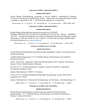Uchwała nr 8/2016 z dnia 01.03.2016 r. /międzyzebraniowa/ Zarząd Okręgu Dolnośląskiego przyjmuje w poczet członków wspierających Polskiego Towarzystwa Tanecznego Szybiak Dance Studio – Jelenia Góra prowadząca Karolina Szybiak z siedzibą ul. Ogrodowa 43 lok. 1, 58-530 Kowary (deklaracja w załączeniu). Głosowanie: za – 6 / przeciw – 0 / wstrzymało się – 0 / nie głosowało – 3 (RH, PKB, GS)/ Uchwała nr 9/2016 z dnia 03.03.2016 r. /międzyzebraniowa/ Zarząd Okręgu Dolnośląskiego postanawia przyjąć nowe ZASADY WSPÓŁZAWODNICTWA W GRUPACH REKREACYJNYCH klas: ”BRĄZ”, „SREBRO”, „ZŁOTO” Okręgu Dolnośląskiego oraz Repertuar Rekreacji Okręgu Dolnośląskiego zgodnie załącznikami. Uchwała wchodzi w życie z dniem 11.03.2016 roku i podlega opublikowaniu na stronie internetowej www.ptt.wroclaw.pl. Głosowanie: za – 7 / przeciw – 0 / wstrzymało się – 0 / nie głosowało – 2 (PS, AM)/ Uchwała nr 10/2016 z dn.11.03.2016r. /międzyzebraniowa/ Zarząd Okręgu Dolnośląskiego postanawia przyjąć następujące wnioski o przeniesienie praw organizacji turnieju: 1.Ogólnopolski Integracyjny T.T.T."O Puchar Starosty Wołowskiego oraz Grand Prix Burmistrza Wołowa" termin: 16.04.2016r. organizator: Wołowski Ośrodek Kultury, KTT "Impuls" Prochowice, miejsce: Wołów Ośrodek Sportu i Rekreacji. 2.XVI O.T.T.T. "O Puchar Burmistrza Trzebnicy" termin: 23.04.2016r. organizator: Wrocławska Akademia Tańca miejsce: Hala Sportowa "ZAPO" w Trzebnicy. 3.VII O.T.T.T. "O Puchar JM Rektora Politechniki Wrocławskiej" termin: 08.05.2016r. organizator: KT "Iskra" miejsce: Hala Sportowa Uniwersytetu Przyrodniczego we Wrocławiu ul.Chełmońskiego 34 Głosowanie: za – 8 / przeciw – 0 / wstrzymało się – 0 / nie głosowało – 1 (DW) Uchwała nr 11/2016 z dn.11.03.2016r. /międzyzebraniowa/ Zarząd Okręgu Dolnośląskiego postanawia przyjąć regulamin Ogólnopolskiego Integracyjnego T.T.T. "O Puchar Starosty Wołowskiego oraz Grand Prix Burmistrza Wołowa" w dniu 16.04.2016r. Głosowanie: za – 8 / przeciw – 0 / wstrzymało się – 0 / nie głosowało – 1 (DW) Uchwała nr 12/2016 z dn.11.03.2016r. /międzyzebraniowa/ Zarząd Okręgu Dolnośląskiego postanawia przyjąć regulamin O.T.T.T. "XXXI Noworudzkie Spotkania Taneczne"; termin: 03.04.2016r. organizator: Miejski Ośrodek Kultury w Nowej Rudzie; miejsce: Hala Sportowa Nowa Ruda-Słupiec ul.Kłodzka Głosowanie: za – 8 / przeciw – 0 / wstrzymało się – 0 / nie głosowało – 1 (DW) Uchwała nr 13/2016 z dnia 15.03.2016 roku /międzyzebraniowa/ Zarząd Okręgu Dolnośląskiego przyjmuje w poczet członków wspierających Polskiego Towarzystwa Tanecznego Mateusz Śmikiel ANIMA DANZA; prowadzący Mateusz Śmikiel z siedzibą Plac 1000-lecia 4/23, 67-200 Głogów (deklaracja w załączeniu). Głosowanie: za – 9 / przeciw – 0 / wstrzymało się – 0 / Uchwała nr 14/2016 z dnia 16.03.2016r. / międzyzebraniowa / Zarząd Okręgu Dolnośląskiego postanawia przyjąć regulamin VII O.T.T.T "O Puchar Prezydenta Miasta Legnicy" termin: 09.03.2016r. organizator: Młodzieżowe Centrum Kultury w Legnicy, S.T "TAKT" Legnica miejsce: Hala Sportowa OSiR w Legnicy. Głosowanie: za – 7 / przeciw – 0 / wstrzymało się – 0 / nie głosowało – 2 (RH, DW) Uchwała nr 15/2016 z dnia 22.03.2016r. / międzyzebraniowa / Zarząd Okręgu Dolnośląskiego przychyla się do prośby organizatora KTT "Impuls" Prochowice o przeniesienie terminu turnieju z dnia 16.04.2016r. na dzień 30.04.2016r. Regulamin turnieju pozostaje bez zmian. Głosowanie: za – 8 / przeciw – 0 / wstrzymało się – 0 / nie głosowało – 2 (GS) Uchwała nr 16/2016 z dnia 25.03.2016 r. /międzyzebraniowa/ Zarząd Okręgu Dolnośląskiego przyjmuje w poczet członków zwyczajnych sześćdziesiąt cztery osoby według załączonych deklaracji (lista w załączeniu). Głosowanie: 8 – za / 0 – przeciw / 0 – wstrzymujących się / 1- nie głosował (AM) Uchwała nr 17/2016 z dnia 25.03.2016 r. /międzyzebraniowa/ Zarząd Okręgu Dolnośląskiego przyjmuje sporządzone przez Prezesa ZOD Grzegorza Kijkowskiego Sprawozdanie Z Działalności Zarządu Okręgu Dolnośląskiego PTT za rok 2015 (sprawozdanie w załączeniu). Głosowanie: 7 – za / 0 – przeciw / 0 – wstrzymujących się / 2 – nie głosował (AM, GK) Uchwała nr 18/2016 z dnia 05.04.2016r. /międzyzebraniowa/ Zarząd Okręgu Dolnośląskiego postanawia przyjąć regulamin XVII Ogólnopolskiego T.T.T "O Puchar Burmistrza Trzebnicy" Termin: 23.04.2016r. organizator: Wrocławska Akademia Tańca, Trzebnickie Centrum Kultury i Sportu miejsce: Trzebnica hala sportowa ZAPO ul. Kościelna 5 Proszę o przegłosowanie kandydatur na sędziego głównego podanych przez organizatora: 1.Barbara Pisarska-Gubernat - 1 2.Andrzej Bieniek - 6 3.Sławomir Grzybek - 1 Głosowanie: 8 – za / 0 – przeciw / 0 – wstrzymujących się / 1- nie głosował (RH) Uchwała nr 19/2016 z dnia 13.04.2016 roku Zarząd Okręgu Dolnośląskiego przyjmuje w poczet członków wspierających Polskiego Towarzystwa Tanecznego Studio Tańca Skydance Wrocław; prowadząca Małgorzata Spryszak z siedzibą ul. Ślężna 2-24, 53-302 Wrocław (deklaracja w załączeniu). Głosowanie: za – 7 / przeciw – 0 / wstrzymało się – 0 / nie głosowało – 2 (AM, PKB) Uchwała nr 20/2016 z dnia 13.04.2016 r. Zarząd Okręgu Dolnośląskiego przyjmuje w poczet członków zwyczajnych czterdziestu jeden osób według załączonych deklaracji (lista w załączeniu). Głosowanie: 7 – za / 0 – przeciw / 0 – wstrzymujących się / 2 - nie głosował (AM, PKB)