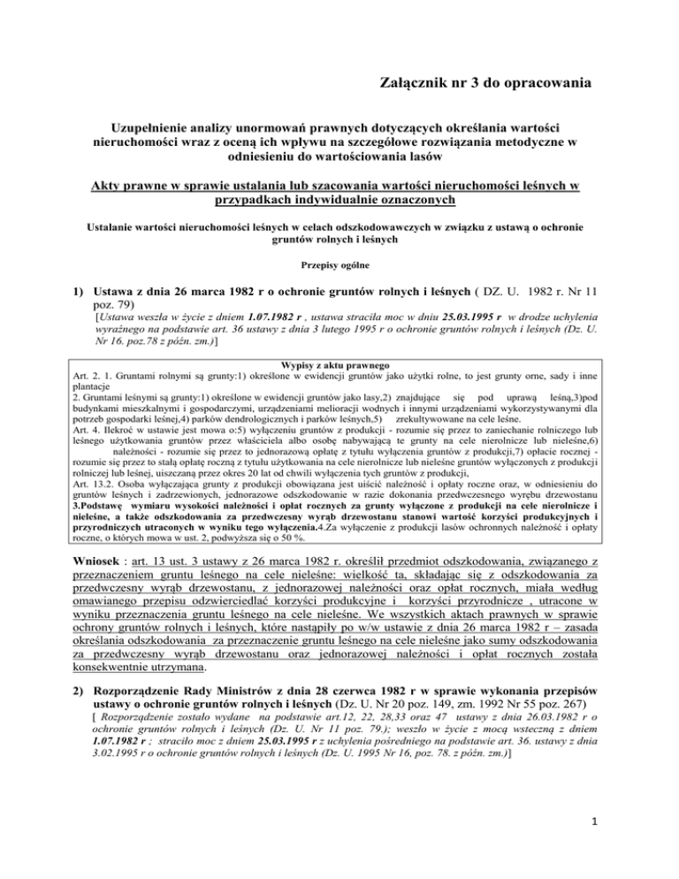 Załącznik nr 3 do opracowania Uzupełnienie analizy unormowań prawnych dotyczących określania wartości nieruchomości wraz z oceną ich wpływu na szczegółowe rozwiązania metodyczne w odniesieniu do wartościowania lasów Akty prawne w sprawie ustalania lub szacowania wartości nieruchomości leśnych w przypadkach indywidualnie oznaczonych Ustalanie wartości nieruchomości leśnych w celach odszkodowawczych w związku z ustawą o ochronie gruntów rolnych i leśnych Przepisy ogólne 1) Ustawa z dnia 26 marca 1982 r o ochronie gruntów rolnych i leśnych ( DZ. U. 1982 r. Nr 11 poz. 79) [Ustawa weszła w życie z dniem 1.07.1982 r , ustawa straciła moc w dniu 25.03.1995 r w drodze uchylenia wyraźnego na podstawie art. 36 ustawy z dnia 3 lutego 1995 r o ochronie gruntów rolnych i leśnych (Dz. U. Nr 16. poz.78 z późn. zm.)] Wypisy z aktu prawnego Art. 2. 1. Gruntami rolnymi są grunty:1) określone w ewidencji gruntów jako użytki rolne, to jest grunty orne, sady i inne plantacje 2. Gruntami leśnymi są grunty:1) określone w ewidencji gruntów jako lasy,2) znajdujące się pod uprawą leśną,3)pod budynkami mieszkalnymi i gospodarczymi, urządzeniami melioracji wodnych i innymi urządzeniami wykorzystywanymi dla potrzeb gospodarki leśnej,4) parków dendrologicznych i parków leśnych,5) zrekultywowane na cele leśne. Art. 4. Ilekroć w ustawie jest mowa o:5) wyłączeniu gruntów z produkcji - rozumie się przez to zaniechanie rolniczego lub leśnego użytkowania gruntów przez właściciela albo osobę nabywającą te grunty na cele nierolnicze lub nieleśne,6) należności - rozumie się przez to jednorazową opłatę z tytułu wyłączenia gruntów z produkcji,7) opłacie rocznej rozumie się przez to stałą opłatę roczną z tytułu użytkowania na cele nierolnicze lub nieleśne gruntów wyłączonych z produkcji rolniczej lub leśnej, uiszczaną przez okres 20 lat od chwili wyłączenia tych gruntów z produkcji, Art. 13.2. Osoba wyłączająca grunty z produkcji obowiązana jest uiścić należność i opłaty roczne oraz, w odniesieniu do gruntów leśnych i zadrzewionych, jednorazowe odszkodowanie w razie dokonania przedwczesnego wyrębu drzewostanu 3.Podstawę wymiaru wysokości należności i opłat rocznych za grunty wyłączone z produkcji na cele nierolnicze i nieleśne, a także odszkodowania za przedwczesny wyrąb drzewostanu stanowi wartość korzyści produkcyjnych i przyrodniczych utraconych w wyniku tego wyłączenia.4.Za wyłączenie z produkcji lasów ochronnych należność i opłaty roczne, o których mowa w ust. 2, podwyższa się o 50 %. Wniosek : art. 13 ust. 3 ustawy z 26 marca 1982 r. określił przedmiot odszkodowania, związanego z przeznaczeniem gruntu leśnego na cele nieleśne: wielkość ta, składając się z odszkodowania za przedwczesny wyrąb drzewostanu, z jednorazowej należności oraz opłat rocznych, miała według omawianego przepisu odzwierciedlać korzyści produkcyjne i korzyści przyrodnicze , utracone w wyniku przeznaczenia gruntu leśnego na cele nieleśne. We wszystkich aktach prawnych w sprawie ochrony gruntów rolnych i leśnych, które nastąpiły po w/w ustawie z dnia 26 marca 1982 r – zasada określania odszkodowania za przeznaczenie gruntu leśnego na cele nieleśne jako sumy odszkodowania za przedwczesny wyrąb drzewostanu oraz jednorazowej należności i opłat rocznych została konsekwentnie utrzymana. 2) Rozporządzenie Rady Ministrów z dnia 28 czerwca 1982 r w sprawie wykonania przepisów ustawy o ochronie gruntów rolnych i leśnych (Dz. U. Nr 20 poz. 149, zm. 1992 Nr 55 poz. 267) [ Rozporządzenie zostało wydane na podstawie art.12, 22, 28,33 oraz 47 ustawy z dnia 26.03.1982 r o ochronie gruntów rolnych i leśnych (Dz. U. Nr 11 poz. 79.); weszło w życie z mocą wsteczną z dniem 1.07.1982 r ; straciło moc z dniem 25.03.1995 r z uchylenia pośredniego na podstawie art. 36. ustawy z dnia 3.02.1995 r o ochronie gruntów rolnych i leśnych (Dz. U. 1995 Nr 16, poz. 78. z późn. zm.)] 1 Wypisy z aktu prawnego § 7. 1. Należność za 1 ha gruntu leśnego bez drzewostanu, wyłączonego z produkcji na cele nierolnicze i nieleśne, wynosi: Lp. Typy siedliskowe lasów (według planów urządzenia Równowartość m2 drewna tartacznego sosnowego leśnego) II klasy jakości 1 Lasy:gospodarstwa świeży, wilgotny, łęgowy i górski oraz ols jesionowy i ols górski 1.300 2 Lasy mieszane: świeży, wilgotny i bagienny, wyżowy, górski i ols 3 Bory mieszane: świeży, wilgotny, bagienny, wyżowy i górski 4 Bory: świeży, wilgotny i górski 5 Bory: suchy i bagienny 1.000 750 400 150 2. Opłata roczna wynosi 10% należności. § 9. Wysokość jednorazowego odszkodowania za przedwczesny wyrąb drzewostanu stanowi różnicę między spodziewaną wartością drzewostanu w wieku rębności a wartością w chwili jego wyrębu, określoną według zasad ustalonych przez Ministra Leśnictwa i Przemysłu Drzewnego; w drzewostanach młodszych, w których nie można pozyskać sortymentów drzewnych, odszkodowanie to stanowi wartość kosztów poniesionych na założenie i pielęgnację drzewostanu. Wniosek: rozporządzenie wykreowało pojęcie spodziewanej wartości drzewostanu w wieku rębności, tj. spodziewanej wartości zdolności do zaspakajania określonych potrzeb przez drzewostan dojrzały do wyrębu; z dalszych, niżej omówionych, szczegółowych rozwiązań legislacyjnych wynika, że chodzi tu o wartość sprzedażną drzewostanu dojrzałego do wyrębu, ocenianą jednak z „perspektywy” aktualnego wieku drzewostanu (jeżeli aktualny wiek drzewostanu wynosi 40 lat, to spodziewana wartość tego drzewostanu w wieku rębności odpowiada wartości sprzedażnej, jaką ten drzewostan będzie miał w wieku rębności (a więc np. za około 60 lat), odpowiednio „sprowadzonej” (zdyskontowanej) do aktualnego wieku tego drzewostanu (tj. do wieku 40 lat). Ponieważ przedmiotem regulacji § 9 jest odszkodowanie za pr