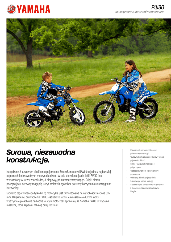 PW80 www.yamaha-motor.pl/accessories Surowa, niezawodna konstrukcja. • Napędzany 2-suwowym silnikiem o pojemności 80 cm3, motocykl PW80 to jedna z najbardziej odpornych i niezawodnych maszyn dla dzieci. W celu ułatwienia jazdy, lekki PW80 jest wyposażony w łatwy w obsłudze, 3-biegowy, półautomatyczny napęd. Dzięki niemu początkujący kierowcy mogą się uczyć zmiany biegów bez potrzeby korzystania ze sprzęgła na kierownicy. • Siodełko tego ważącego tylko 61 kg motocykla jest zamontowane na wysokości zaledwie 635 mm. Dzięki temu prowadzenie PW80 jest bardzo łatwe. Zawieszenie o dużym skoku i wytrzymałe plastikowe nadwozie w stylu motocross sprawiają, że Yamaha PW80 to wydajna maszyna, która zapewni zabawę całej rodzinie! • • • • • Przyjazny dla kierowcy, 3-biegowy, półautomatyczny napęd Wytrzymały i niezawodny 2-suwowy silnik o pojemności 80 cm3 Lekkie i wytrzymałe nadwozie z polipropylenu Waga zaledwie 61 kg zapewnia łatwe prowadzenie Oddzielny zbiornik oleju do silnika 2-suwowego ułatwia obsługę Przednie i tylne zawieszenie o dużym skoku 3-biegowa, półautomatyczna skrzynia biegów Krok na drodze do większych motocykli. Fenomen motocykli dla dzieci narodził się w Yamaha wraz z opracowaniem popularnego modelu PW50. Solidny, niezawodny motocykl Yamaha PW80 jest przeznaczony dla starszych dzieci, zarówno tych przesiadających się z mniejszego modelu 50, jak i dla osób, które dopiero rozpoczynają przygodę z dwoma kółkami. Mini motocykl średnich rozmiarów jest wyposażony w 3-biegową, półautomatyczną skrzynię biegów, a brak dźwigni sprzęgła oznacza jeszcze więcej zabawy. Podobnie jak w przypadku motocykli terenowych Yamaha o większej pojemności, nadwozie PW80 zostało wykonane z polipropylenu. Szprychowane koła, zawieszenie o dużym skoku i wydajny układ wydechowy sprawiają, że ten wysokiej jakości motocykl dla dzieci to świetna zabawa dla całej rodziny. PW80 www.yamaha-motor.pl/accessories Łatwy w konserwacji, 2-suwowy silnik o pojemności 80 cm3 Wytrzymała rama centralna i zawieszenie o dużym skoku Dynamiczny, 2-suwowy silnik PW80 zadowoli zarówno młodych kierowców, jak ich rodziców. Zwarta budowa i mały ciężar silnika sprawiają, że motocykl waży zaledwie 61 kg i jest łatwy w prowadzeniu. Dzięki ułatwionemu dostępowi do świecy zapłonowej i zamontowanemu z boku gaźnikowi konserwacja maszyny jest dziecinnie prosta. Ponieważ rama centralna jest produkowana ze stali o dużej wytrzymałości na rozciąganie, charakteryzuje się małą wagą i dużą wytrzymałością. Mocne zawieszenie, którego przedni skok wynosi 110 mm, a tylny 95 mm, zostało zaprojektowane z myślą o wygodnej jeździe po wybojach. 3-biegowa, półautomatyczna skrzynia biegów Jedną z najważniejszych cech modelu PW80 jest półautomatyczny napęd, który eliminuje potrzebę korzystania z dźwigni sprzęgła. Trzy przełożenia przekładni zmieniane są lewą stopą, co pozwala kierowcy w pełni wykorzystać moc dynamicznego, 2-suwowego silnika o pojemności 80 cm3. Wydajny układ wydechowy Lekkie nadwozie z polipropylenu 14-calowe koło przednie i 12-calowe tylne Lekki, wydajny układ wydechowy zapewnia optymalną pracę, mały ciężar i komfort jazdy motocyklem PW80. Układ jest montowany blisko silnika i nadwozia, a z dala od nogi kierowcy. Prześwit pod motocyklem wynosi 185 cm. Projekt nadwozia modelu PW80 w niebieskich barwach rajdowych jest wzorowany na motocyklach Yamaha z serii YZ MX. Błotniki, zbiornik paliwa, chwyty powietrza i panele boczne są wykonane z niezwykle odpornego i zadziwiająco lekkiego polipropylenu. Dzięki temu PW80 nie tylko estetycznie wygląda, ale też sprawdza się w trudnym terenie. W wyboistym terenie przydadzą Ci się 14-calowe koło przednie i 12-calowe tylne z niezwykle wytrzymałymi szprychami i mocnymi stalowymi obręczami. Dzięki mocnemu zawieszeniu o dużym skoku i terenowym oponom z masywnym bieżnikiem z dużymi klockami, PW80 świetnie się nadaje do zabawy w trudnym terenie. PW80 www.yamaha-motor.pl/accessories Silnik Typ silnika Chłodzony powietrzem, 2-suwowy, Nachylony do przodu, jednocylindrowy, Zawór membranowy Pojemność 79 cm3 Średnica x skok tłoka 47,0 mm x 45,6 mm Stopień sprężania 6,6 : 1 Układ smarowania Yamaha Autolube Gaźnik Mikuni VM15/1 Typ sprzęgła Mokre, odśrodkowe, automatyczne Układ zapłonu CDI Układ rozrusznika Nożny Skrzynia biegów Półautomatyczna Napęd końcowy Łańcuch Podwozie Rama Rama z rur stalowych Układ przedniego zawieszenia Widelec teleskopowy Skok przedniego zawieszenia 110 mm Kąt wyprzedzania sworznia zwrotnicy 26º Tor 62 mm Układ tylnego zawieszenia Wahacz, (monocross) Skok tylnego zawieszenia 95 mm Hamulec przedni Jednotarczowe, Ø 95 mm Hamulec tylny Bębnowe, Ø 110 mm Opona przednia 2.50-14 4PR Opona tylna 3.00-12 4PR Wymiary Długość całkowita 1 540 mm Szerokość całkowita 640 mm Wysokość całkowita 880 mm Wysokość siodełka 635 mm Rozstaw kół 1 055 mm Minimalny prześwit 185 mm Masa z obciążeniem (wliczając wypełnione zbiorniki oleju i paliwa) 61 kg Pojemność zbiornika paliwa 4,9 litrów Pojemność zbiornika oleju 0,75 litrów Racing Blue Jakość w stylu Yamaha Technicy Yamaha są przeszkoleni i w pełni wyposażeni, aby służyć klientom najlepszymi usługami i poradami na temat produktów Yamaha. Dlatego Yamaha zaleca, aby wszelkie prace serwisowe były wykonywane przez oficjalnych przedstawicieli Yamaha. Yamaha zdecydowanie zaleca stosowanie oryginalnych części zamiennych i akcesoriów. Yamaha zaleca również stosowanie produktów Yamalube®. Yamalube to oferowana przez Yamaha gama najwyższej jakości środków smarnych. Opracowane z myślą o niezawodnej pracy praktycznie w każdych warunkach stanowią o prawdziwej mocy silników Yamaha. Oprócz akcesoriów użytkowych i ozdobnych oferujemy również szeroką gamę najwyższej jakości odzieży dla motocyklistów, która zapew