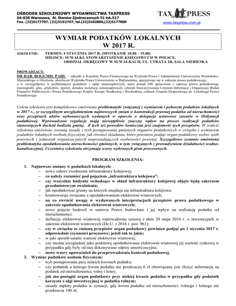 OŚRODEK SZKOLENIOWY WYDAWNICTWA TAXPRESS 04-028 Warszawa, Al. Stanów Zjednoczonych 51 lok.517 Fax. (22)5177707, (22)3102707, tel.(22)3102800,(22)5177800 www.taxpress.com.pl WYMIAR PODATKÓW LOKALNYCH W 2017 R. SZKOLENIE: TERMIN: 4 STYCZNIA 2017 R. (SPOTKANIE 10.00 – 15.00) MIEJSCE: SUWAŁKI, STOWARZYSZENIE KSIĘGOWUCH W POLSCE, ODDZIAŁ OKRĘGOWY W SUWAŁKACH, UL. UTRATA 2B, SALA NIEBIESKA PROWADZĄCY: – adiunkt w Katedrze Prawa Finansowego na Wydziale Prawa i Administracji Uniwersytetu WarmińskoMazurskiego w Olsztynie, absolwent Wydziału Prawa Uniwersytetu w Białymstoku, specjalizuje się w zakresie prawa podatkowego, a w szczególności w problematyce podatków i opłat samorządowych, autor ponad 200 opracowań z zakresu prawa podatkowego (monografii, glos, artykułów, opinii), doradca instytucji samorządowych, członek Stowarzyszenia Centrum Informacji i Organizacji Badań Finansów Publicznych i Prawa Podatkowego Krajów Europy Środkowej i Wschodniej, członek Zespołu Eksperckiego ds. Lokalnego Prawa Podatkowego. DR HAB. BOGUMIŁ PAHL Celem szkolenia jest kompleksowe omówienie problematyki związanej z wymiarem i poborem podatków lokalnych w 2017 r., ze szczególnym uwzględnieniem najnowszych zmian w konstrukcji prawnej podatku od nieruchomości oraz przepisach aktów wykonawczych wydanych w oparciu o delegacje ustawowe zawarte w Ordynacji podatkowej. Wprowadzone regulacje mają niewątpliwie znaczny wpływ na proces realizacji podatków stanowiących dochód budżetu gminy. Z tych też powodów konieczna jest znajomość tych przepisów. W trakcie szkolenia omówione zostaną zasady i tryb postępowania gminnych organów podatkowych w związku z wymiarem podatków lokalnych osobom fizycznym, jak również działania, które powinien podjąć organ podatkowy wobec osób prawnych i jednostek organizacyjnych nieposiadających osobowości prawnej. Szczegółowo zostanie omówiona problematyka opodatkowania nieruchomości gminnych, w tym związanych z prowadzeniem działalności wodnokanalizacyjnej. Uczestnicy szkolenia otrzymają wzory wybranych pism procesowych. PROGRAM SZKOLENIA: 1. Najnowsze zmiany w podatkach lokalnych: nowy zakres zwolnienia infrastruktury kolejowej; co należy rozumieć pod pojęciem „infrastruktura kolejowa”; czy wszystkie budynki wchodzące w skład infrastruktury kolejowej objęte będą zakresem przedmiotowym zwolnienia; jak opodatkować grunty na których znajduje się infrastruktura kolejowa; kontrowersje związane z opodatkowaniem elektrowni wiatrowych; na co zwrócić uwagę w wydawanych interpretacjach przepisów prawa podatkowego w zakresie opodatkowania elektrowni wiatrowych; nowe pojęcie budowli w ustawie Prawo budowlane i jej wpływ na realizację podatku od nieruchomości; definicja elektrowni wiatrowej wprowadzona ustawą z dnia 20 maja 2016 r. o inwestycjach w zakresie elektrowni wiatrowych (Dz.U. z 2016 r. poz. 961); czy w związku ze zmianą przepisów organ podatkowy powinien podjąć po 1 stycznia 2017 r. odpowiednie czynności procesowe; jeżeli tak to jakie; w jaki sposób ustalić wartość elektrowni wiatrowej; czy można uwzględnić jako podstawę opodatkowania elektrowni wiatrowej jej wartość rynkową w przypadku gdy były od niej dokonywane odpisy amortyzacyjne; nowe wzory upoważnień do przeprowadzenia kontroli podatkowej. 2. Wymiar podatków osobom fizycznym: tryb postępowania przy niskich kwotach podatku; czy podatnik u którego kwota podatku nie przekracza 6 zł obowiązany jest złożyć informację na podatek od nieruchomości, rolny i leśny; jak ma postąpić organ podatkowy przy niskiej kwocie podatku w przypadku gdy podatnik korzysta z ulgi inwestycyjnej w podatku rolnym; zasady zapłaty podatku w sytuacji, gdy kwota podatku od nieruchomości, rolnego i leśnego nie przekracza 100 zł; OŚRODEK SZKOLENIOWY WYDAWNICTWA TAXPRESS 04-028 Warszawa, Al. Stanów Zjednoczonych 51 lok.517 Fax. (22)5177707, (22)3102707, tel.(22)3102800,(22)5177800 www.taxpress.com.pl 3. 4. 5. 6. informacje na podatek od nieruchomości, rolny i leśny a obowiązek wydania postanowienia o wszczęciu postępowania i postanowienia o siedmiodniowym terminie do wypowiedzenia się w sprawie zebranego materiału dowodowego; jak postąpić w przypadku gdy wszyscy współwłaściciele nie złożyli informacji na podatek od nieruchomości; czy w tym przypadku można nie wydawać postanowienia o wszczęciu postępowania i postanowienia o siedmiodniowym terminie do wypowiedzenia się w sprawie zebranego materiału dowodowego; co z podpisywaniem decyzji ustalających wysokość zobowiązania podatkowego; kontrowersje związane z zasadami obliczania liczby hektarów przeliczeniowych w podatku rolnym. Zasady postępowania w stosunku do osób prawnych i jednostek organizacyjnych nieposiadających osobowości prawnej: czy osoby prawne mają obowiązek składania deklaracji przy „niskich” kwotach podatków; jak postąpić w przypadku gdy złożona deklaracja jest nieprawidłowa bądź też jej w ogóle nie złożono; w jakich przypadkach organ podatkowy może dokonać korekty deklaracji z urzędu; pełnomocnictwa do składania deklaracji na podatek od nieruchomości, rolny, leśny i od środków transportowych; kiedy podatnik zobowiązany jest przedstawić pełnomocnictwo do złożenia deklaracji; co z opłatą skarbową od pełnomocnictwa; tryb postępowania ze złożonymi wnioskami o stwierdzenie nadpłaty w podatkach lokalnych. Opodatkowanie nieruchomości gminnych: zakres zwolnienia z podatku od nieruchomości gruntów i budynków stanowiących własność gminy (art. 7 ust. 1 pkt. 15 u.p.o.l.); które grunty i budynki nie powinny być wykazywane przez gminę w składanej deklaracji na podatek od nieruchomości; czy takie obiekty jak: świetlice wiejskie, remizy strażackie, budynki GOPS-u, MOPS-u, Biblioteki Gminnej są zwolnione od podatku na podstawie nowego art. 7 ust. 1 pkt. 15 ustawy o podatkach i opłatach lokalnych; czy gmina powi