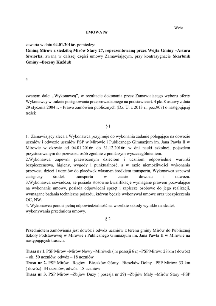 Wzór UMOWA Nr zawarta w dniu 04.01.2016r. pomiędzy: Gminą Mirów z siedzibą Mirów Stary 27, reprezentowaną przez Wójta Gminy –Artura Siwiorka, zwaną w dalszej części umowy Zamawiającym, przy kontrasygnacie Skarbnik Gminy –Bożeny Kuźdub a zwanym dalej „Wykonawcą”, w rezultacie dokonania przez Zamawiającego wyboru oferty Wykonawcy w trakcie postępowania przeprowadzonego na podstawie art. 4 pkt.8 ustawy z dnia 29 stycznia 2004 r. - Prawo zamówień publicznych (Dz. U. z 2013 r., poz.907) o następującej treści: §1 1. Zamawiający zleca a Wykonawca przyjmuje do wykonania zadanie polegające na dowozie uczniów i odwozie uczniów PSP w Mirowie i Publicznego Gimnazjum im. Jana Pawła II w Mirowie w okresie od 04.01.2016r. do 31.12.2016r. w dni nauki szkolnej, pojazdem przystosowanym do przewozu osób zgodnie z poniższym wyszczególnieniem. 2.Wykonawca zapewni przewożonym dzieciom i uczniom odpowiednie warunki bezpieczeństwa, higieny, wygody i punktualność, a w razie niemożliwości wykonania przewozu dzieci i uczniów do placówek własnym środkiem transportu, Wykonawca zapewni zastępczy środek transportu w czasie dowozu i odwozu. 3.Wykonawca oświadcza, że posiada stosowne kwalifikacje wymagane prawem pozwalające na wykonanie umowy, posiada odpowiedni sprzęt i zaplecze osobowe do jego realizacji, wymagane badania techniczne pojazdu, którym będzie wykonywał umowę oraz ubezpieczenia OC, NW. 4. Wykonawca ponosi pełną odpowiedzialność za wszelkie szkody wynikłe na skutek wykonywania przedmiotu umowy. §2 Przedmiotem zamówienia jest dowóz i odwóz uczniów z terenu gminy Mirów do Publicznej Szkoły Podstawowej w Mirowie i Publicznego Gimnazjum im. Jana Pawła II w Mirowie na następujących trasach: Trasa nr 1. PSP Mirów –Mirów Nowy –Mirówek ( nr posesji 6 c) –PSP Mirów: 28 km ( dowóz) – ok. 50 uczniów, odwóz – 18 uczniów Trasa nr 2. PSP Mirów –Rogów –Bieszków Górny –Bieszków Dolny –PSP Mirów: 33 km ( dowóz) -34 uczniów, odwóz -18 uczniów Trasa nr 3. PSP Mirów –Zbijów Duży ( posesja nr 29) –Zbijów Mały –Mirów Stary –PSP Mirów: II autobus – 34 km ( dowóz) – 36 uczniów, odwóz -34 uczniów Trasa nr 4. PSP Mirów –Mirów Nowy –Mirówek –PSP Mirów: klasy 0-III ( nr posesji 6 c) – 28 km ( dowóz i odwóz) – 36 uczniów Trasa nr 5. Odwóz uczniów z klas sportowych: Mirów (szkoła) - Mirów Stary –Zbijów Mały –Zbijów Duży ( posesja nr 29) –Bieszków Górny –Bieszków Dolny –Rogów ( Komorniki) – Mirówek –Mirów Nowy: długość trasy: 34 km, 29 uczniów. 1) Dowóz uczniów do szkoły z trasy nr 1 powinien zakończyć się nie wcześniej niż o godz. 7:30 2) Dowóz uczniów do szkoły z trasy nr 2 powinien zakończyć się o godz. 7.50 3) Dowóz uczniów do szkoły z trasy nr 3 powinien zakończyć się nie wcześniej niż o godzinie 7.30 4) Dowóz uczniów do szkoły z trasy nr 4 powinien zakończyć się o godz. 7.50 5) Odwóz uczniów z klas sportowych po zajęciach. Dowóz i odwóz dzieci będzie się odbywał codziennie od poniedziałku do piątku z wyłączeniem dni ustawowo wolnych od nauki (przerwy świąteczne, ferie zimowe, wakacje zgodnie z obowiązującym terminem). §3 Dowóz i odwóz dzieci ma się odbywać, co najmniej dwoma pojazdami. 1. Jeden pojazd dla trasy 1 i 2. 2. Jeden pojazd dla trasy 3 i 4. 3. Odwóz dzieci dla trasy nr 1,2,3,4 i 5 –jednorazowy, dla każdej trasy, po zakończeniu zajęć przez dzieci przewożone na danej trasie. W przypadku zmiany organizacji zajęć polegającej na: a. skróceniu godzin nauki, sprawdzianu klas szóstych, egzaminu gimnazjalnego, b. odpracowaniu zajęć z dnia wypadającego pomiędzy dwoma dniami świątecznymi ustawowo wolnymi od pracy lub piątku wypadającego bezpośrednio po dniu świątecznym ustawowo wolnym od pracy w sobotę lub innych przyczyn, Wykonawca zostaje powiadomiony przez Zamawiającego o zmianie terminu dowozu lub odwozu uczniów. Zamawiający zapewni opiekę na czas przewozu uczniów, w szczególności najmłodszych – uczniów klas I-III szkoły podstawowej oraz dzieci w wieku przedszkolnym. Wielkość autobusu winna być dostosowana do ilości przewożonych uczniów. §4 W przypadku awarii pojazdu, Wykonawca zobowiązany jest zapewnić pojazd zastępczy dla wykonywania umowy. §5 1.Za wykonanie przedmiotu zamówienia Wykonawca otrzyma wynagrodzenie w kwocie brutto ……………................. zł, słownie ( ………………………………………………………….) 2.Cena obejmuje całościowe ( ryczałtowe) wykonanie niniejszego zamówienia przez cały okres trwania umowy. 3.Zamawiający będzie płacił Wykonawcy ratę w wysokości 1/10 wartości umowy miesięcznie. 4.Płatność nastąpi przelewem na konto Wykonawcy na podstawie faktur VAT wystawionych przez Wykonawcę na koniec miesiąca kalendarzowego, za dany miesiąc, w terminie do 14 dni od otrzymania faktury. §6 Umowna zostaje zawarta na czas określony od 04.01.2016 roku do dnia 31.12 2016 roku. §7 Wykonawca nie ponosi odpowiedzialności za nie wykonanie usługi, bądź jej opóźnienie wynikłe z przyczyn od niego niezależnych np. nieprzejezdność dróg spowodowana warunkami atmosferycznymi ( zaspy, śnieżyce). §8 1. Wykonawca zapłaci Zamawiającemu karę umowną za odstąpienie od umowy wskutek okoliczności, za które on sam odpowiada w wysokości 10% wartości umowy brutto, jak również pokryje koszty wykonania zastępczego w przypadku nie wykonania, lub nieprawidłowego wykonania umowy. W razie wystąpienia istotnych zmian okoliczności powodujących, że wykonanie umowy nie leży w interesie publicznym, czego nie można było przewidzieć w chwili zawarcia umowy, Zamawiający może od umowy odstąpić w terminie 30 dni od podjęcia wiadomości o tych okolicznościach. §9 Zamawiający może rozwiązać umowę bez wypowiedzenia, Jeżeli ogłoszona zostanie upadłość lub likwidacja Wykonawcy, gdy nas