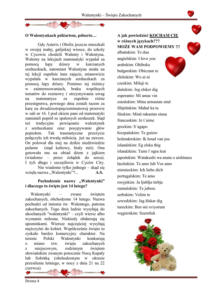 Walentynki – Święto Zakochanych O Walentynkach półżartem, półserio… Gdy Asterix i Obelix jeszcze mieszkali w swojej małej, galijskiej wiosce, do szkoły w Cycowie chodzili Walenty i Walentyna. Walenty na lekcjach matematyki wypalał za pomocą lupy dziury w karcianych serduszkach, natomiast Walentyna miała na tej lekcji zupełnie inne zajęcie, mianowicie wypalała w karcianych serduszkach za pomocą lupy dziury. Pomimo tej różnicy w zainteresowaniach, braku wspólnych tematów do rozmowy i otrzymywania uwag na matematyce za zupełnie różne przestępstwa, pewnego dnia zostali razem za karę na dwudziestopięciominutowej przerwie w sali nr 16. I pod okiem pani od matematyki zamiatali popiół ze spalonych serduszek. Stąd też tradycyjne powiązanie walentynek z serduszkami oraz posypywanie głów popiołem. Tak traumatyczne przeżycie połączyło ich trwałą miłością już na zawsze. On polował dla niej na dzikie niedźwiedzie polarne (stąd kultowy, biały miś). Ona gotowała mu na obiad dżem z jajkiem (wiadomo – przez żołądek do serca). I żyli długo i szczęśliwie w Cyców City. Nie wiadomo tylko jednego – skąd się wzięła nazwa ,,Walentynki”?... A.S. Pochodzenie nazwy „Walentynki” i dlaczego to święto jest 14 lutego? Walentynki – zwane świętem zakochanych, obchodzone 14 lutego. Nazwa pochodzi od imienia św. Walentego, patrona zakochanych. Tego dnia ludzie wysyłają do ukochanych "walentynki" – czyli wiersz albo wyznanie miłosne. Niekiedy obdarzają się upominkami. Wiersze najczęściej wysyłają mężczyźni do kobiet. Współcześnie święto to zyskało bardzo komercyjny charakter. Na terenie Polski Walentynki konkurują o miano tzw. święta zakochanych z miejscowym, rodzimym świętem słowiańskim zwanym potocznie Nocą Kupały lub Sobótką (obchodzonym w okresie przesilenia letniego, w nocy z dnia 21 na 22 czerwca). Strona 4 A jak powiedzieć KOCHAM CIĘ w różnych językach??? MOŻE WAM PODPOWIEMY !!! albańskim: Te dua angielskim: I love you arabskim: Ohiboka bułgarskim: Obiczam te chińskim: Wo ai ni czeskim: Miluji te duńskim: Jeg elsker dig esperanto: Mi amas vin estońskim: Mina armastan sind filipińskim: Mahal ka ta fińskim: Minä rakastan sinua francuskim: Je t´aime greckim: S´agapo hiszpańskim: Te guiero holenderskim: Ik houd van jou islandzkim: Eg elska thig irlandzkim: Taim i' ngra leat japońskim: Watakushi wa anata o aishinasu łacińskim: Te amo lub Vos amo niemieckim: Ich liebe dich portugalskim: Te amo rosyjskim: Ja ljublju tiebja rumuńskim: Te jubesc serbskim: Volim te szwedzkim: Jag älskar dig tureckim: Ben sni sviyorum węgierskim: Szeretlek