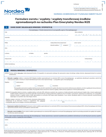 8-cyfrowy identyfikator Klienta znajdujący się w korespondencji przekazywanej przez Nordea DFE * IKZE-P - 1/2014 Nr Klienta* Formularz zwrotu / wypłaty / wypłaty transferowej środków zgromadzonych na rachunku Plan Emerytalny Nordea IKZE 1 DANE OSOBY SKŁADAJĄCEJ WNIOSEK / DYSPOZYCJĘ Oszczędzający / Osoba Uprawniona (w przypadku zgonu Oszczędzającego) imię data urodzenia D D M M R R R R nazwisko PESEL rodzaj dokumentu tożsamości dowód osobisty seria i numer paszport ulica nr domu nr lokalu poczta miejscowość kod pocztowy telefon kontaktowy 2 RODZAJ WNIOSKU / DYSPOZYCJI UWAGA: Prosimy wybrać tylko jeden rodzaj dyspozycji/wniosku. W przypadku nie zaznaczenia żadnego lub zaznaczenia więcej niż jednego rodzaju zlecenia, dyspozycja/wniosek nie zostanie zrealizowana. Wniosek o wypłatę środków z rachunku IKZE (Wypłata środków zgromadzonych na rachunku IKZE na rzecz Oszczędzającego – po spełnieniu określonych warunków: wiek 65 lat i dokonywanie wpłat w minimum 5 latach kalendarzowych lub na rzecz Uprawnionego – w przypadku zgonu Oszczędzającego) Wypłata: jednorazowa ratalna* * miesięczna kwartalna przypadku zaznaczenia wypłaty ratalnej, prosimy określić częstotliwość wypłaty. Wysokość raty zostanie obliczona przy założeniu, że okres wypłaty jest równy okresowi, W w którym dokonywane były wpłaty. W przypadku braku oznaczenia wariantu wypłaty, środki zostaną wypłacone w formie jednorazowej. UWAGA: W przypadku złożenia wniosku o wypłatę ratalną z rachunku IKZE, obliczona wysokość raty, wyrażona w liczbie jednostek rozrachunkowych, będzie stała, a kwota wypłacanych środków będzie uzależniona od wartości jednostki rozrachunkowej na dzień przeliczenia wypłacanej raty. W związku z powyższym, przyjmuję do wiadomości, że w przypadku realizacji wniosku o wypłatę ratalną, środki zgromadzone na rachunku IKZE będą nadal zarządzane, a tym samym akceptuję ryzyko, że wartość jednostki rozrachunkowej wpływająca na wysokość raty może ulegać zmianie. Wypłata nastąpi w terminie 14 dni od momentu otrzymania dokumentów niezbędnych do jej dokonania. Prosimy o uzupełnienie daty wyłącznie w przypadku, gdy ma ona nastąpić w terminie późniejszym. D D M M data R R R R Dyspozycja wypłaty transferowej (Przekazanie całości środków zgromadzonych na rachunku IKZE do innej instytucji finansowej prowadzącej IKZE, z którą Oszczędzający lub Osoba Uprawniona zawarła umowę o prowadzenie rachunku IKZE) Wniosek o zwrot środków (Zwrot całości środków zgromadzonych na rachunku IKZE wyłącznie na wniosek Oszczędzającego i jeżeli nie zachodzą przesłanki do wypłaty lub wypłaty transferowej, opisane powyżej) Nazwa i adres Urzędu Skarbowego właściwego dla Oszczędzającego / Osoby Uprawnionej w sprawach opodatkowania podatkiem dochodowym od osób fizycznych (prosimy wypełnić w przypadku wniosku o wypłatę lub zwrot środków) nazwa adres Nordea Powszechne Towarzystwo Emerytalne S.A., Al. Jana Pawła II 27, Atrium Centrum, 00-867 Warszawa, tel. +48 (22) 541 00 00, fax: +48 (22) 541 00 01, infolinia: 801 306 306, e-mail: [email protected], www.nordeapolska.pl, Rejestr Przedsiębiorców nr KRS 0000010345 w Sądzie Rejonowym dla m. st. Warszawy, w Warszawie, XII Wydział Gospodarczy Krajowego Rejestru Sądowego, NIP: 521-29-76-286, REGON: 014860559, Kapitał Zakładowy 72 209 370,00 złotych w całości wpłacony. 3 FORMA WYPŁATY / ZWROTU ŚRODKÓW UWAGA: Prosimy wybrać tylko jeden z poniższych wariantów. Informujemy, że podanie numeru rachunku bankowego pozwoli na przyspieszenie procesu przekazania środków. Przelew na rachunek bankowy: imię i nazwisko właściciela rachunku bankowego (prosimy wypełnić w przypadku, gdy właścicielem rachunku nie jest wnioskodawca) Przekaz pocztowy na adres: imię i nazwisko adresata przekazu ulica nr domu nr lokalu poczta miejscowość 4 kod pocztowy WYKAZ DOKUMENTÓW JAKIE NALEŻY ZAŁĄCZYĆ DO FORMULARZA W ZALEŻNOŚCI OD RODZAJU ZLECENIA UWAGA: Prosimy dołączyć do wniosku oryginały lub kopie poniższych dokumentów potwierdzone za zgodność z oryginałem przez notariusza lub osobę działającą w odpowiednim urzędzie z upoważnienia wójta, burmistrza lub prezydenta miasta. • Odpis aktu zgonu • Kopia dokumentu tożsamości Osoby Uprawnionej potwierdzona za zgodność z oryginałem • W przypadku braku Osoby Uprawnionej prawomocne postanowienie sądu o stwierdzeniu nabycia spadku albo akt poświadczenia dziedziczenia oraz zgodne oświadczenie wszystkich spadkobierców o sposobie podziału środków zgromadzonych przez Oszczędzającego, bądź prawomocne postanowienie sądu o dziale spadku oraz dokumenty stwierdzające tożsamość spadkobierców Wypłata środków zgłoszona przez Osobę Uprawnioną Wypłata transferowa zgłoszona przez Osobę Uprawnioną • Odpis aktu zgonu • Kopia dokumentu tożsamości Osoby Uprawnionej potwierdzona za zgodność z oryginałem • W przypadku braku Osoby Uprawnionej prawomocne postanowienie sądu o stwierdzeniu nabycia spadku albo akt poświadczenia dziedziczenia oraz zgodne oświadczenie wszystkich spadkobierców o sposobie podziału środków zgromadzonych przez Oszczędzającego, bądź prawomocne postanowienie sądu o dziale spadku oraz dokumenty stwierdzające tożsamość spadkobierców • Potwierdzenie zawarcia umowy o prowadzenie IKZE z inną instytucją finansową Wypłata transferowa zgłoszona przez Oszczędzającego • Potwierdzenie zawarcia umowy o prowadzenie IKZE z inną instytucją finansową • Kopia dokumentu tożsamości Oszczędzającego potwierdzona za zgodność z oryginałem Zwrot lub Wypłata środków zgłoszona przez Oszczędzającego • Kopia dokumentu tożsamości Oszczędzającego potwierdzona za zgodność z oryginałem 5 PODPISY I OŚWIADCZENIA Oświadczam, że wszystkie podane przeze mnie dane są zgodne z prawdą. Oświadczam, że zapoznałem się z konsekwencjami zw