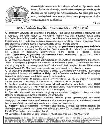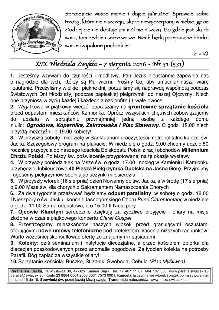 Sprzedajcie wasze mienie i dajcie jałmużnę! Sprawcie sobie trzosy, które nie niszczeją, skarb niewyczerpany w niebie, gdzie złodziej się nie dostaje ani mól nie niszczy. Bo gdzie jest skarb wasz, tam będzie i serce wasze. Niech będą przepasane biodra wasze i zapalone pochodnie! (Łk 12) XIX Niedziela Zwykła – 7 sierpnia 2016 - Nr 31 (531) 1. Jesteśmy wzywani do czujności i modlitwy. Pan Jezus nieustannie zapewnia nas o nagrodzie dla tych, którzy są Mu wierni. Prośmy Go, aby umacniał naszą wiarę i zaufanie. Przeżyliśmy wielkie i piękne dni, poczuliśmy się naprawdę wspólnotą podczas Światowych Dni Młodzieży, podczas papieskiej pielgrzymki do naszej Ojczyzny. Niech one przyniosą w życiu każdej i każdego z nas obfite i trwałe owoce! 2. Wyjątkowo w piątkowy wieczór zapraszamy na gruntowne sprzątanie kościoła przed odpustem mieszkańców Kamionka. Oprócz wszystkich chętnych zobowiązujemy do udziału w sprzątaniu przynajmniej jedną osobę z każdego domu z ulic: Ogrodowa, Kopernika, Zakrzowska i Plac Stawowy. O godz. 18.00 niech przyjdą mężczyźni, o 19.00 kobiety! 3. W przyszłą sobotę i niedzielę w Sanktuarium uroczystości metropolitalne ku czci św. Jacka. Szczegółowy program na plakacie. W niedzielę o godz. 9.00 chcemy uczcić 50 rocznicę przybycia do naszego kościoła Episkopatu Polski z racji obchodów Millennium Chrztu Polski. Po Mszy św. poświęcenie przygotowanej na tę okazję wystawy 4. W przyszły poniedziałek na Mszę św. o godz. 17.00 i nocleg w Kamieniu i Kamionku przybędzie Jubileuszowa 40 Piesza Pielgrzymka Opolska na Jasną Górę. Przyjmijmy i ugośćmy pielgrzymów spełniając uczynki miłosierdzia 5. W przyszły wtorek (16 sierpnia) dzień Nowenny do św. Jacka, a w środę (17 sierpnia) o 9.00 Msza św. dla chorych z Sakramentem Namaszczenia Chorych 6. Za dwa tygodnie przeżywać będziemy odpust parafialny: w sobotę o godz. 18.00 I Nieszpory o św. Jacku i koncert Jasnogórskiego Chóru Pueri Claromontani; w niedzielę o godz. 11.00 Suma odpustowa, a o 15.00 II Nieszpory 7. Ojcowie Klaretyni serdecznie dziękują za życzliwe przyjęcie i ofiary na misje złożone w czasie piątkowego koncertu Claret Gospel 8. Przestrzegamy mieszkańców naszych wiosek przed grasującymi oszustami oferującymi nowe umowy telefoniczne pod pretekstem płacenia niższych rachunków! Warto wcześniej skonsultować ofertę ze znajomymi i sąsiadami 9. Kolekty: dziś seminarium i instytucje diecezjalne, a przed kościołem zbiórka dla diecezjan poszkodowanych przez anomalie pogodowe. Za tydzień kolekta na potrzeby Parafii. Bóg zapłać za wszystkie ofiary! 10. Sprzątanie kościoła: Buszke, Strzałek, Swoboda, Cebula (Plac Myśliwca) Parafia św. Jacka, Pl. Myśliwca 30, 47-325 Kamień Śląski, tel. 77 467 11 07, 604 107 358; www.parafia.swjacek.eu [email protected], Konto 23 8884 0004 2003 0031 7573 0001, Kancelaria czynna we wtorek i piątek po mszy porannej oraz od 16 do 18. Spowiedź św. przed każdą Mszą świętą. Transmisja nabożeństw: www.msza.swjacek.eu XIX NIEDZIELA ZWYKŁA (Kolekta dla Diecezji) 7 VIII 7.30 Msza św. za + męża i ojca Jerzego Gorzel w kolejną rocznicę śmierci 10.00 Msza św. za ++ żonę i matkę Renatę Przybyła, ojca Pawła Przybyła, bratanka Marcina, teściów Magdalenę i Edwarda Bieniek, z pokr. Przybyła i Bieniek 15.00 Nieszpory niedzielne 16.00 Msza św. koncelebrowana: 1) za + męża Eryka Glueck w 1 rocznicę śmierci; 2) za + Józefa Glik w miesiąc po śmierci PONIEDZIAŁEK Dominika 8 VIII 7.00 Msza św. do B. Op. (…) w int. Ks. Abpa Alfonsa Nossola w dniu urodzin 11.00 Msza św. ślubna: Izabela Liszka – Denis Howan 17.00 Kamionek: Msza św. za ++ rodz. Karola i Marię Krawiec, brata Bernarda, Andrzeja Dubiński WTOREK 9 VIII Teresy Benedykty od Krzyża 7.00 Msza św. za ++ męża Huberta Rygoł, braci i bratową, rodz. Engelberta i Martę, z rodzin Rygoł, Glück i Mehlich ŚRODA Wawrzyńca 10 VIII 7.00 Msza św. w jęz. niem.: za + Elżbietę Kowolik w 1 rocznicę śmierci 17.00 Kamionek: Msza św. do B. Op. i MBNP (…) w int. Jadwigi Woś i dzieci z rodzinami oraz za ++ męża Henryka Woś i brata Jerzego Rygol CZWARTEK 11 VIII Klary 7.00 Msza św. za ++ męża Alfreda Bartoszek, jego rodz. Bertę i Józefa, rodz. Martę i Karola Gołąb, brata Jerzego, siostry zakonne Gerhildę i Konsumatę i z pokr. PIĄTEK 12 VIII 7.00 Msza św. za ++ rodz. Monikę i Jacka Fesser, matkę Marię Lysek, dziadków Marię i Franciszka Fesser, Martę i Jana Blaut oraz dusze w cz. c. SOBOTA 13 VIII 7.00 Msza św. w intencji czcicieli MB Fatimskiej i o nawrócenie grzeszników 10.30 Msza św. ślubna: Evelin Wenzl – Kamil Reinert 12.00 Msza św. ślubna: Sandra Kaczkan – Bartłomiej Kiebzak 15.00 Msza św. do B. Op. (…) w intencji Rocznika 1956 i za ++ trzech kolegów 16.00 Św. Barbara: Msza św. do B. Op. (…) w int. Haliny Jarosz z okazji urodzin 17.00 Kamionek: za ++ matkę Emilię Gabor, ojca Jacka, wszystkich z pokr. Skowronek, Gabor i Buk 17.30 Sanktuarium: Nabożeństwo do MB Miłosierdzia 18.00 Sanktuarium: Msza św. pontyfikalna ku czci św. Jacka (Ks. Bp A. Czaja) XX NIEDZIELA ZWYKŁA (Kolekta dla Parafii) 14 VIII 7.30 Msza św. do B. Op. (…) w intencji Sabiny Reinert z okazji urodzin 9.00 Msza św. koncelebrowana: 1) w int. Parafian z okazji 50 rocznicy obchodów milenijnych w Kamieniu; 2) do Anioła Stróża w int. rocznego dziecka Karoliny Skrzypek, rodz. i chrzestnych. Po Mszy poświęcenie Wystawy 11.00 Sanktuarium: Suma odpustowa ku czci św. Jacka (Ks. Bp J. Jezierski) 15.00 Sanktuarium: Nabożeństwo do Miłosierdzia Bożego 15.30 Chrzest: Nikol Biela 16.00 Msza św. do B. Op. (…) w int. rodziny Sabiny Ledwoch oraz za ++ rodz. z obu stron, z rodzin Przemus i Sleziona 17.00 Chrzest: Bianka Przybyła