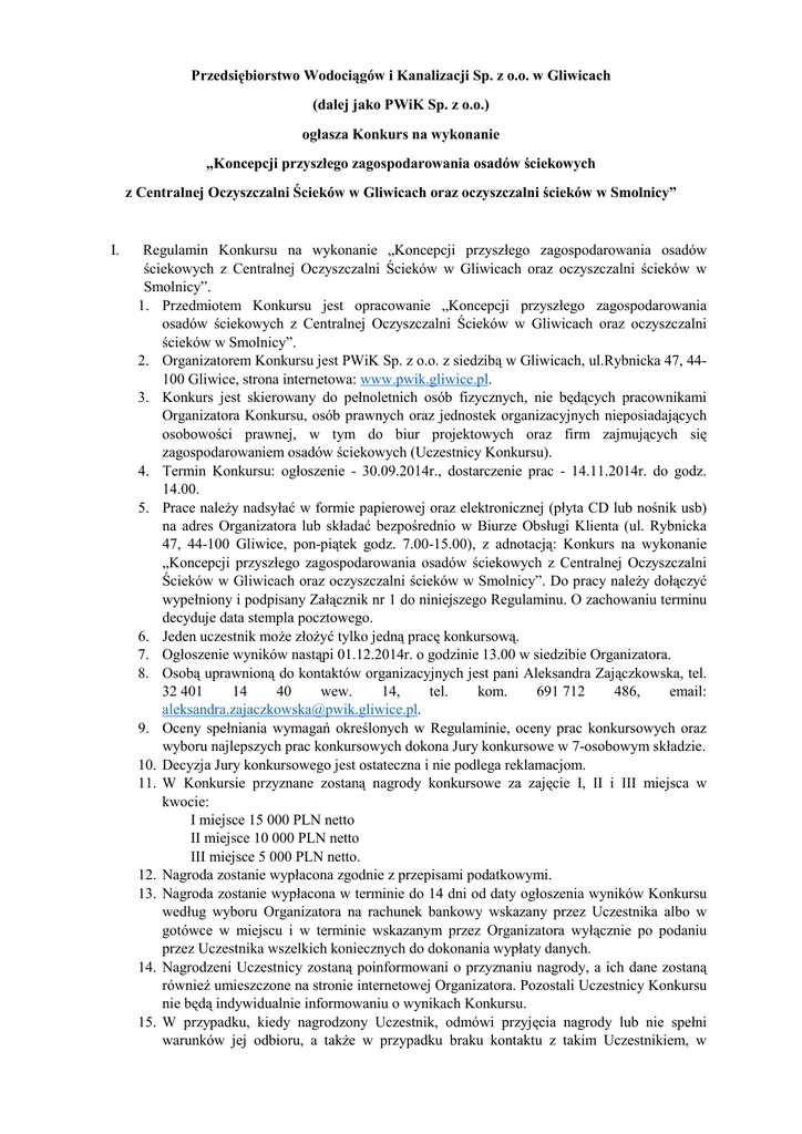 Przedsiębiorstwo Wodociągów i Kanalizacji Sp. z o.o. w Gliwicach (dalej jako PWiK Sp. z o.o.) ogłasza Konkurs na wykonanie „Koncepcji przyszłego zagospodarowania osadów ściekowych z Centralnej Oczyszczalni Ścieków w Gliwicach oraz oczyszczalni ścieków w Smolnicy” I. Regulamin Konkursu na wykonanie „Koncepcji przyszłego zagospodarowania osadów ściekowych z Centralnej Oczyszczalni Ścieków w Gliwicach oraz oczyszczalni ścieków w Smolnicy”. 1. Przedmiotem Konkursu jest opracowanie „Koncepcji przyszłego zagospodarowania osadów ściekowych z Centralnej Oczyszczalni Ścieków w Gliwicach oraz oczyszczalni ścieków w Smolnicy”. 2. Organizatorem Konkursu jest PWiK Sp. z o.o. z siedzibą w Gliwicach, ul.Rybnicka 47, 44100 Gliwice, strona internetowa: www.pwik.gliwice.pl. 3. Konkurs jest skierowany do pełnoletnich osób fizycznych, nie będących pracownikami Organizatora Konkursu, osób prawnych oraz jednostek organizacyjnych nieposiadających osobowości prawnej, w tym do biur projektowych oraz firm zajmujących się zagospodarowaniem osadów ściekowych (Uczestnicy Konkursu). 4. Termin Konkursu: ogłoszenie - 30.09.2014r., dostarczenie prac - 14.11.2014r. do godz. 14.00. 5. Prace naleŜy nadsyłać w formie papierowej oraz elektronicznej (płyta CD lub nośnik usb) na adres Organizatora lub składać bezpośrednio w Biurze Obsługi Klienta (ul. Rybnicka 47, 44-100 Gliwice, pon-piątek godz. 7.00-15.00), z adnotacją: Konkurs na wykonanie „Koncepcji przyszłego zagospodarowania osadów ściekowych z Centralnej Oczyszczalni Ścieków w Gliwicach oraz oczyszczalni ścieków w Smolnicy”. Do pracy naleŜy dołączyć wypełniony i podpisany Załącznik nr 1 do niniejszego Regulaminu. O zachowaniu terminu decyduje data stempla pocztowego. 6. Jeden uczestnik moŜe złoŜyć tylko jedną pracę konkursową. 7. Ogłoszenie wyników nastąpi 01.12.2014r. o godzinie 13.00 w siedzibie Organizatora. 8. Osobą uprawnioną do kontaktów organizacyjnych jest pani Aleksandra Zajączkowska, tel. 32 401 14 40 wew. 14, tel. kom. 691 712 486, email: [email protected]. 9. Oceny spełniania wymagań określonych w Regulaminie, oceny prac konkursowych oraz wyboru najlepszych prac konkursowych dokona Jury konkursowe w 7-osobowym składzie. 10. Decyzja Jury konkursowego jest ostateczna i nie podlega reklamacjom. 11. W Konkursie przyznane zostaną nagrody konkursowe za zajęcie I, II i III miejsca w kwocie: I miejsce 15 000 PLN netto II miejsce 10 000 PLN netto III miejsce 5 000 PLN netto. 12. Nagroda zostanie wypłacona zgodnie z przepisami podatkowymi. 13. Nagroda zostanie wypłacona w terminie do 14 dni od daty ogłoszenia wyników Konkursu według wyboru Organizatora na rachunek bankowy wskazany przez Uczestnika albo w gotówce w miejscu i w terminie wskazanym przez Organizatora wyłącznie po podaniu przez Uczestnika wszelkich koniecznych do dokonania wypłaty danych. 14. Nagrodzeni Uczestnicy zostaną poinformowani o przyznaniu nagrody, a ich dane zostaną równieŜ umieszczone na stronie internetowej Organizatora. Pozostali Uczestnicy Konkursu nie będą indywidualnie informowaniu o wynikach Konkursu. 15. W przypadku, kiedy nagrodzony Uczestnik, odmówi przyjęcia nagrody lub nie spełni warunków jej odbioru, a takŜe w przypadku braku kontaktu z takim Uczestnikiem, w II. III. szczególności jeŜeli Uczestnik nie odpowie w wyznaczonym terminie na zawiadomienie wysłane przez Organizatora, Uczestnik taki moŜe decyzją Organizatora stracić prawo do otrzymania nagrody, a Organizator będzie uprawniony według własnego wyboru do przyznania nagrody Uczestnikowi, który uzyskał następny w kolejności wynik albo będzie mógł w inny sposób zadecydować o przyznaniu nagrody. 16. Z chwilą wypłacenia nagrody Uczestnikowi, Organizator nabywa własność nagrodzonej pracy Uczestnika oraz prawa autorskie na warunkach określonych w Załączniku nr 1 do Regulaminu. 17. Organizator Konkursu wolny jest od obowiązku zwrotu złoŜonych w ramach Konkursu prac i dokumentów. 18. Organizator zastrzega, Ŝe w przypadku, jeŜeli złoŜone prace nie będą spełniać załoŜeń ideowych, Konkurs moŜe pozostać bez rozstrzygnięcia. 19. Organizator zastrzega sobie prawo uniewaŜnienia Konkursu w kaŜdym czasie. 20. Organizator moŜe wykluczyć Uczestnika z Konkursu w przypadku naruszenia przez Uczestnika postanowień niniejszego Regulaminu. 21. W przypadku, gdy okaŜe się, Ŝe zdobywcą nagrody jest osoba, która nie spełnia warunków wskazanych w niniejszym Regulaminie, osoba ta traci prawa do nagrody, a w przypadku ujawnienia tego faktu po doręczeniu tej nagrody, osoba ta będzie zobowiązana do jej zwrotu. 22. Dane osobowe Uczestników będą przetwarzane przy zachowaniu zasad określonych w ustawie o ochronie danych osobowych (t.j. Dz. U. z 2002 roku, Nr 101, poz. 926 z późn. zm.). Administratorem danych osobowych Uczestników jest Organizator. Podanie danych ma charakter dobrowolny, przy czym jest niezbędne dla udziału w Konkursie. Osobom udostępniającym dane przysługuje prawo do wglądu do swoich danych oraz moŜliwość ich poprawiania. 23. Regulamin znajduje się do wglądu na stronie internetowej Organizatora oraz w siedzibie Organizatora w godzinach jego urzędowania. 24. Organizator zastrzega sobie prawo wprowadzenia zmian do niniejszego Regulaminu. Zmiany będą ogłaszane na stronie internetowej Organizatora oraz dostępne w siedzibie Organizatora w godzinach jego urzędowania. 25. Konkurs stanowi przyrzeczenie publiczne w rozumieniu art. 919-921 Kodeksu cywilnego i nie podlega przepisom ustawy z dnia 19 listopada 2009 r. o grach hazardowych (Dz. U. z 2009 r, Nr 201, poz. 1540 z późn. zm.). 26. Wszelkie spory dotyczące Konkursu nie objęte regulaminem rozstrzygane będą na drodze cywilno-prawnej. Kryteria oceny Koncepcji: 1. Szacowany całkowity koszt eksploatacji instalacji, tj. z uwzględnieniem amortyzacji i płac pracowników oraz dostawy mediów, środków c