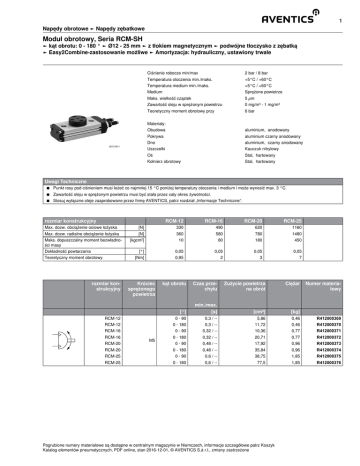 1 Napędy obrotowe ► Napędy zębatkowe Moduł obrotowy, Seria RCM-SH ► kąt obrotu: 0 - 180 ° ► Ø12 - 25 mm ► z tłokiem magnetycznym ► podwójne tłoczysko z zębatką ► Easy2Combine-zastosowanie możliwe ► Amortyzacja: hydrauliczny, ustawiony trwale Ciśnienie robocze min/max 2 bar / 8 bar Temperatura otoczenia min./maks. +5°C / +60°C Temperatura medium min./maks. +5°C / +60°C Medium Sprężone powietrze Maks. wielkość cząstek 5 µm Zawartość oleju w sprężonym powietrzu 0 mg/m³ - 1 mg/m³ Teoretyczny moment obrotowy przy 6 bar Materiały: 00131811 Obudowa aluminium, anodowany Pokrywa aluminium czarny anodowany Dno aluminium, czarny anodowany Uszczelki Kauczuk nitrylowy Oś Stal, hartowany Kołnierz obrotowy Stal, hartowany Uwagi Techniczne ■ Punkt rosy pod ciśnieniem musi leżeć co najmniej 15 °C poniżej temperatury otoczenia i medium i może wynosić max. 3 °C. ■ Zawartość oleju w sprężonym powietrzu musi być stała przez cały okres żywotności. ■ Stosuj wyłączne oleje zaaprobowane przez firmę AVENTICS, patrz rozdział „Informacje Techniczne“. rozmiar konstrukcyjny RCM-12 RCM-16 RCM-20 RCM-25 [N] 360 580 780 1480 [kgcm²] 10 80 180 450 [°] 0,05 0,05 0,05 0,05 [Nm] 0,95 2 3 7 Max. dozw. obciążenie osiowe łożyska [N] Max. dozw. radialne obciążenie łożyska Maks. dopuszczalny moment bezwładności masy Dokładność powtarzania Teoretyczny moment obrotowy rozmiar konstrukcyjny 330 1160 Zużycie powietrza na obrót Ciężar RCM-12 [°] 0 - 90 min./max. [s] [cm³] [kg] 0,46 R412000369 RCM-12 0 - 180 0,3 / -- 11,72 0,46 R412000370 RCM-16 0 - 90 0,32 / -- 10,36 0,77 R412000371 RCM-16 0 - 180 0,32 / -- 20,71 0,77 R412000372 0 - 90 0,48 / -- 17,92 0,96 R412000373 RCM-20 0 - 180 0,48 / -- 35,84 0,96 R412000374 RCM-25 0 - 90 0,6 / -- 38,75 1,85 R412000375 RCM-25 0 - 180 0,6 / -- 77,5 1,85 R412000376 M5 kąt obrotu 620 Czas przechyłu RCM-20 Króciec sprężonego powietrza 490 0,3 / -- 5,86 Pogrubione numery materiałowe są dostępne w centralnym magazynie w Niemczech, informacje szczegółowe patrz Koszyk Katalog elementów pneumatycznych, PDF online, stan 2016-12-01, © AVENTICS S.à r.l., zmiany zastrzeżone Numer materiałowy 2 Napędy obrotowe ► Napędy zębatkowe Moduł obrotowy, Seria RCM-SH ► kąt obrotu: 0 - 180 ° ► Ø12 - 25 mm ► z tłokiem magnetycznym ► podwójne tłoczysko z zębatką ► Easy2Combine-zastosowanie możliwe ► Amortyzacja: hydrauliczny, ustawiony trwale zakres ustawień położeń krańcowych 0° /90° / 180° 00122055 najazd położeń krańcowych 90° / 180° 90° A 0° 180° 00122053_b najazd położenia krańcowego 0° 00122054_c maksymalna dozwolona siła promieniowa Fy [N] w zależności od v [mm] 00117257_c Pogrubione numery materiałowe są dostępne w centralnym magazynie w Niemczech, informacje szczegółowe patrz Koszyk Katalog elementów pneumatycznych, PDF online, stan 2016-12-01, © AVENTICS S.à r.l., zmiany zastrzeżone 3 Napędy obrotowe ► Napędy zębatkowe Moduł obrotowy, Seria RCM-SH ► kąt obrotu: 0 - 180 ° ► Ø12 - 25 mm ► z tłokiem magnetycznym ► podwójne tłoczysko z zębatką ► Easy2Combine-zastosowanie możliwe ► Amortyzacja: hydrauliczny, ustawiony trwale RCM 12 RCM 16 – 25 00125735_b 00117262_b maksymalna dozwolona siła osiowa Fx [N] w zależności od u [mm] 00117258_c RCM 12 RCM 16 – 25 00125738_b Pogrubione numery materiałowe są dostępne w centralnym magazynie w Niemczech, informacje szczegółowe patrz Koszyk Katalog elementów pneumatycznych, PDF online, stan 2016-12-01, © AVENTICS S.à r.l., zmiany zastrzeżone 00117260_b 4 Napędy obrotowe ► Napędy zębatkowe Moduł obrotowy, Seria RCM-SH ► kąt obrotu: 0 - 180 ° ► Ø12 - 25 mm ► z tłokiem magnetycznym ► podwójne tłoczysko z zębatką ► Easy2Combine-zastosowanie możliwe ► Amortyzacja: hydrauliczny, ustawiony trwale A B H6 H1 D2 H2 W1 H4 H3 H5 RCM-12/.../-25 B3 L1 L3 L5 B2 L4 B1 L6 T1 D1 SW1 X SW2 00125724 T1 = głębokość nośna gwintu rozmiar konstrukcyjny B1 B2 B3 Ø D1 Ø D2 H1 H2 H3 H4 H5 H6 RCM-12 43 18 18 35 M5 24 10,5 6 2,9 2,5 18 RCM-16 52 24 20 40 M5 32 10 7 3,3 2,5 21 RCM-20 58 30 20 42 M5 37 11 7 3,3 3 26 RCM-25 69 34 28 48 M5 43 12 8 4 3 29 rozmiar konstrukcyjny L1 L3 L4 L5 L6 SW1 SW2 RCM-12 103 33,5 14 40 9 15 11 4 90° M8x1 RCM-16 108 34 18 40 10 19 13 4 90° M10x1 RCM-20 114 48,5 19 43 9 19 15 4 90° M12x1 RCM-25 153 60 22 60,5 10 23 17 4 90° M14x1,5 T1 W1 X Pogrubione numery materiałowe są dostępne w centralnym magazynie w Niemczech, informacje szczegółowe patrz Koszyk Katalog elementów pneumatycznych, PDF online, stan 2016-12-01, © AVENTICS S.à r.l., zmiany zastrzeżone 5 Napędy obrotowe ► Napędy zębatkowe Moduł obrotowy, Seria RCM-SH ► kąt obrotu: 0 - 180 ° ► Ø12 - 25 mm ► z tłokiem magnetycznym ► podwójne tłoczysko z zębatką ► Easy2Combine-zastosowanie możliwe ► Amortyzacja: hydrauliczny, ustawiony trwale mocowanie i montaż, RCM-12 RCM 16 – 25 00120674_c 00120675_c 1) tuleja centrująca, należy do zakresu dostawy 2) tuleja centrująca rozmiar konstrukcyjny Ø D6 ±0,02 Ø D7 k6 Ø D8 7 RCM-16 30 7 RCM-20 30 7 RCM-25 35 9 rozmiar konstrukcyjny T6 RCM-12 – RCM-16 11,1 RCM-20 15,1 RCM-25 15,1 RCM-12 25 Ø D9 Ø D10 Ø D11 Ø D12 Ø D13 k6 H13 +0,2 H14 +0,2 L9 M4 10 5,1 M5 – M5 10 5 – 2,1 40 M6 9 1,6 2,1 – 60 M5 11 6,8 – – M8 12 1,6 2,1 – 60 – M6 11 6,8 – M8 12 2,1 2,1 – 60 – 9 1,6 Pogrubione numery materiałowe są dostępne w centralnym magazynie w Niemczech, informacje szczegółowe patrz Koszyk Katalog elementów pneumatycznych, PDF online, stan 2016-12-01, © AVENTICS S.à r.l., zmiany zastrzeżone L10 ±0,02 60 T5 8,5