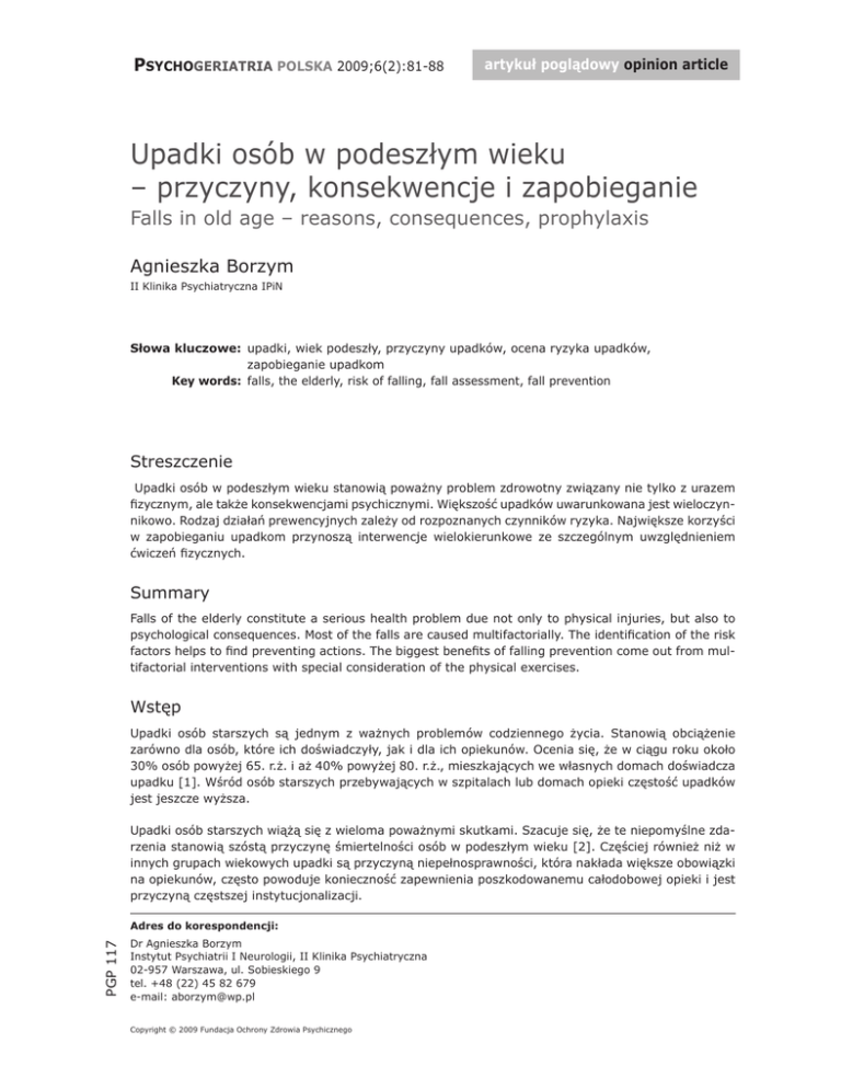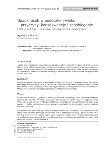PSYCHOGERIATRIA POLSKA 2009;6(2):81-88 artykuł poglądowy opinion article Upadki osób w podeszłym wieku – przyczyny, konsekwencje i zapobieganie Falls in old age – reasons, consequences, prophylaxis Agnieszka Borzym II Klinika Psychiatryczna IPiN Słowa kluczowe: upadki, wiek podeszły, przyczyny upadków, ocena ryzyka upadków, zapobieganie upadkom Key words: falls, the elderly, risk of falling, fall assessment, fall prevention Streszczenie Upadki osób w podeszłym wieku stanowią poważny problem zdrowotny związany nie tylko z urazem fizycznym, ale także konsekwencjami psychicznymi. Większość upadków uwarunkowana jest wieloczynnikowo. Rodzaj działań prewencyjnych zależy od rozpoznanych czynników ryzyka. Największe korzyści w zapobieganiu upadkom przynoszą interwencje wielokierunkowe ze szczególnym uwzględnieniem ćwiczeń fizycznych. Summary Falls of the elderly constitute a serious health problem due not only to physical injuries, but also to psychological consequences. Most of the falls are caused multifactorially. The identification of the risk factors helps to find preventing actions. The biggest benefits of falling prevention come out from multifactorial interventions with special consideration of the physical exercises. Wstęp Upadki osób starszych są jednym z ważnych problemów codziennego życia. Stanowią obciążenie zarówno dla osób, które ich doświadczyły, jak i dla ich opiekunów. Ocenia się, że w ciągu roku około 30% osób powyżej 65. r.ż. i aż 40% powyżej 80. r.ż., mieszkających we własnych domach doświadcza upadku [1]. Wśród osób starszych przebywających w szpitalach lub domach opieki częstość upadków jest jeszcze wyższa. Upadki osób starszych wiążą się z wieloma poważnymi skutkami. Szacuje się, że te niepomyślne zdarzenia stanowią szóstą przyczynę śmiertelności osób w podeszłym wieku [2]. Częściej również niż w innych grupach wiekowych upadki są przyczyną niepełnosprawności, która nakłada większe obowiązki na opiekunów, często powoduje konieczność zapewnienia poszkodowanemu całodobowej opieki i jest przyczyną częstszej instytucjonalizacji. PGP 117 Adres do korespondencji: Dr Agnieszka Borzym Instytut Psychiatrii I Neurologii, II Klinika Psychiatryczna 02-957 Warszawa, ul. Sobieskiego 9 tel. +48 (22) 45 82 679 e-mail: [email protected] Copyright © 2009 Fundacja Ochrony Zdrowia Psychicznego 82 Agnieszka Borzym: Upadki osób w wieku podeszłym Fizyczny uraz to nie jedyna konsekwencja upadku. Innym bardzo ważnym następstwem jest lęk przed kolejnym upadkiem, który może spowodować ograniczenie codziennych aktywności, zwiększać niechęć do czynnego spędzania czasu, osłabiać wiarę w siebie i prowadzić do społecznej izolacji [3]. Tinetti i wsp. oszacowali, że u 48% osób starszych, które upadły przynajmniej raz występował lęk przed kolejnym upadkiem, a 26% osób z tego powodu zmniejszyło swoją codzienną aktywność [1]. Przyczyny upadków Przytoczone dane wskazują na potrzebę wnikliwej analizy przyczyn upadków, która będzie pomocna w opracowaniu odpowiednich strategii prewencji. Chociaż niektóre upadki spowodowane są pojedynczymi, konkretnymi przyczynami to jednak większość z nich uwarunkowana jest wieloczynnikowo, a wraz z ilością czynników ryzyka zwiększa się również zagrożenie upadkiem [1]. Czynniki doprowadzające do upadków można podzielić na wewnętrzne – związane z obniżoną sprawnością organizmu i zewnętrzne, niezależne od procesu starzenia się (tab.1). Tab. 1. Przyczyny upadków Tab. 1. Reasons of falls czynniki wewnętrzne czynniki zewnętrzne zmiany związane z wiekiem choroby o przebiegu przewlekłym choroby o przebiegu ostrym śliskie lub nierówne podłoże słabe oświetlenie niezabezpieczone schody nieodpowiednie umeblowanie niewłaściwe obuwie pora doby instytucje Wśród czynników wewnętrznych możemy wyróżnić fizjologiczne, związane z procesem starzenia i chorobowe (patologiczne). Wraz z wiekiem ulega osłabieniu percepcja narządów zmysłów gwarantujących stabilność postawy takich jak: wzroku, słuchu, równowagi oraz czucia powierzchownego i głębokiego. W młodym organizmie przekazywane z nich bodźce umożliwiają prawidłową orientację położenia w przestrzeni oraz utrzymanie równowagi zarówno w czasie stania jak i w ruchu. Podczas starzenia się dochodzi do licznych zmian strukturalnych w narządzie przedsionkowym (zmniejsza się populacja komórek nabłonka zmysłowego oraz włókien nerwu przedsionkowego), które powodują osłabienie jego pobudliwości. Pogarsza się wzrok -zmniejsza ostrość, adaptacja do ciemności i wrażliwość na kolory, zawęża pole widzenia, zwiększa się wrażliwości na połysk, ulegają zaburzeniu funkcje wzrokowo-przestrzenne. Masa mięśniowa stają się mniejsza, a mięśnie słabsze i mniej sprawne (proces ten w pierwszej kolejności i w największym stopniu dotyczy mięśni kończyn dolnych). Zjawiska te powodują trudności w szybkiej reakcji na nagle pojawiające się przeszkody. Dodatkowo, wskutek postępujących zmian zwyrodnieniowych w układzie mięśniowo-szkieletowym dochodzi do zmiany wzorca chodu. Krok ulega skróceniu, zmniejszają się współruchy kończyn górnych, dłużej trwa faza obunożnego podporu, pochylenie sylwetki przesuwa środek ciężkości ku przodowi, chód spowalnia się [4]. Ponadto zmiany inwolucyjne w układzie mięśniowym, ze względu na lokalizację prioprioceptorów w ścięgnach i wrzecionkach mięśniowych, wpływają niekorzystnie na czucie głębokie. W czasie starzenia spowalnia się również przewodnictwo nerwowe, wydłuża czas reakcji oraz dochodzi do zaburzeń integracji reakcji czuciowych i ruchowych. Wszystkie te zmiany niekorzystnie wpływają na zdolność utrzymania równowagi, czego skutkiem może być ograniczanie fizycznej aktywności, co jak wykazano w licznych badaniach, jest znaczącym czynnikiem 