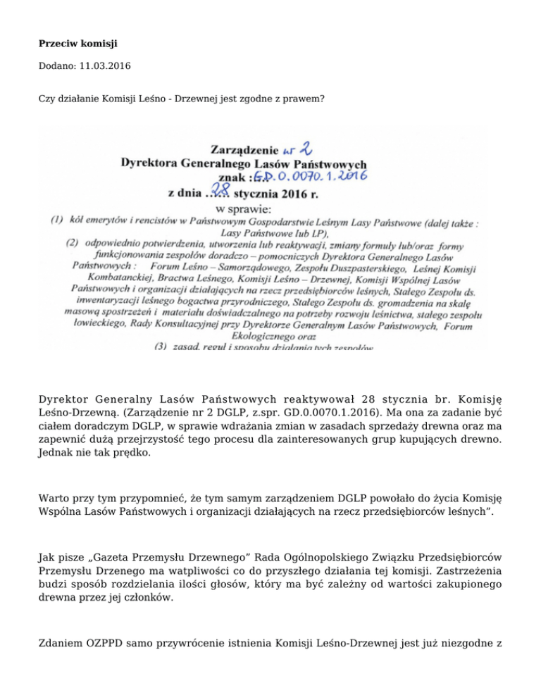 Przeciw komisji Dodano: 11.03.2016 Czy działanie Komisji Leśno - Drzewnej jest zgodne z prawem? Dyrektor Generalny Lasów Państwowych reaktywował 28 stycznia br. Komisję Leśno-Drzewną. (Zarządzenie nr 2 DGLP, z.spr. GD.0.0070.1.2016). Ma ona za zadanie być ciałem doradczym DGLP, w sprawie wdrażania zmian w zasadach sprzedaży drewna oraz ma zapewnić dużą przejrzystość tego procesu dla zainteresowanych grup kupujących drewno. Jednak nie tak prędko. Warto przy tym przypomnieć, że tym samym zarządzeniem DGLP powołało do życia Komisję Wspólna Lasów Państwowych i organizacji działających na rzecz przedsiębiorców leśnych”. Jak pisze „Gazeta Przemysłu Drzewnego” Rada Ogólnopolskiego Związku Przedsiębiorców Przemysłu Drzenego ma watpliwości co do przyszłego działania tej komisji. Zastrzeżenia budzi sposób rozdzielania ilości głosów, który ma być zależny od wartości zakupionego drewna przez jej członków. Zdaniem OZPPD samo przywrócenie istnienia Komisji Leśno-Drzewnej jest już niezgodne z prawem, ponieważ regulacje warunków cen i sprzedaży drewna określa już ustawa o lasach, a także ustawa o izbach gospodarczych, oraz o organizacjach pracodawców. Inne stowarzyszenia nie są uprawnione do wydawania takich opinii. Jak się zakończy ten spór – czas pokaże. Rada OZPPD poprosiła o wnikliwe zbadanie tej sprawy i rozważenie sensu reaktywacji komisji. Komentarze (0) Nie dodano jeszcze żadnego komentarza.