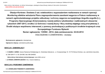 22.4.2014 bzp0.portal.uzp.gov.pl/index.php?ogloszenie=show&pozycja=135594&rok=2014-04-22 Adres strony internetowej, na której Zamawiający udostępnia Specyfikację Istotnych Warunków Zamówienia: www.infish.com.pl/przetargi Olsztyn-Kortowo: Dostawa 2 szt. notebooków z wyposażeniem realizowana w ramach operacji Monitoring efektów wdrażania Planu zagospodarowania zasobami węgorza w Polsce realizowany w ramach ogólnoświatowego projektu odbudowy i ochrony węgorza europejskiego Anguilla anguilla (L.), Programu Operacyjnego Zrównoważony rozwój sektora rybołówstwa i nadbrzeżnych obszarów rybackich 2007-2013, środka 3.2 Ochrona i rozwój fauny i flory wodnej objętego osią priorytetową 3. Środki służące wspólnemu interesowi, z pomocy pochodzącej z publicznych środków krajowych oraz Europejskiego Funduszu Rybacki Numer ogłoszenia: 135594 - 2014; data zamieszczenia: 22.04.2014 OGŁOSZENIE O ZAMÓWIENIU - dostawy Zamieszczanie ogłoszenia: obowiązkowe. Ogłoszenie dotyczy: zamówienia publicznego. SEKCJA I: ZAMAWIAJĄCY I. 1) NAZWA I ADRES: Instytut Rybactwa Śródlądowego im. Stanisława Sakowicza , ul. Oczapowskiego 10, 10-719 Olsztyn-Kortowo, woj. warmińsko-mazurskie, tel. 089 5240171 w. 60; 5241060, faks 089 5240505. Adres strony internetowej zamawiającego: www.infish.com.pl I. 2) RODZAJ ZAMAWIAJĄCEGO: Inny: instytut badawczy. SEKCJA II: PRZEDMIOT ZAMÓWIENIA II.1) OKREŚLENIE PRZEDMIOTU ZAMÓWIENIA http://bzp0.portal.uzp.gov.pl/index.php?ogloszenie=show&pozycja=135594&rok=2014-04-22 1/6 22.4.2014 bzp0.portal.uzp.gov.pl/index.php?ogloszenie=show&pozycja=135594&rok=2014-04-22 II.1.1) Nazwa nadana zamówieniu przez zamawiającego: Dostawa 2 szt. notebooków z wyposażeniem realizowana w ramach operacji Monitoring efektów wdrażania Planu zagospodarowania zasobami węgorza w Polsce realizowany w ramach ogólnoświatowego projektu odbudowy i ochrony węgorza europejskiego Anguilla anguilla (L.), Programu Operacyjnego Zrównoważony rozwój sektora rybołówstwa i nadbrzeżnych obszarów rybackich 2007-2013, środka 3.2 Ochrona i rozwój fauny i flory wodnej objętego osią priorytetową 3. Środki służące wspólnemu interesowi, z pomocy pochodzącej z publicznych środków krajowych oraz Europejskiego Funduszu Rybacki. II.1.2) Rodzaj zamówienia: dostawy. II.1.4) Określenie przedmiotu oraz wielkości lub zakresu zamówienia: Przedmiotem zamówienia jest dostawa dwóch notebooków z wyposażeniem. Szczegółowe określenie przedmiotu zamówienia zawarte jest w dokumencie Szczegółowy opis przedmiotu zamówienia, stanowiącego Załącznik nr 2 do SIWZ. II.1.6) Wspólny Słownik Zamówień (CPV): 30.21.31.00-6. II.1.7) Czy dopuszcza się złożenie oferty częściowej: nie. II.1.8) Czy dopuszcza się złożenie oferty wariantowej: nie. II.2) CZAS TRWANIA ZAMÓWIENIA LUB TERMIN WYKONANIA: Okres w dniach: 7. SEKCJA III: INFORMACJE O CHARAKTERZE PRAWNYM, EKONOMICZNYM, FINANSOWYM I TECHNICZNYM III.2) ZALICZKI III.3) WARUNKI UDZIAŁU W POSTĘPOWANIU ORAZ OPIS SPOSOBU DOKONYWANIA OCENY SPEŁNIANIA TYCH WARUNKÓW III. 3.1) Uprawnienia do wykonywania określonej działalności lub czynności, jeżeli przepisy prawa nakładają obowiązek ich posiadania Opis sposobu dokonywania oceny spełniania tego warunku Zamawiający nie precyzuje w powyższym zakresie żadnych wymagań, których spełnienie Wykonawca jest zobowiązany wykazać w sposób szczególny. III.3.2) Wiedza i doświadczenie Opis sposobu dokonywania oceny spełniania tego warunku Zamawiający nie precyzuje w powyższym zakresie żadnych wymagań, których spełnienie Wykonawca jest zobowiązany wykazać w sposób szczególny. III.3.3) Potencjał techniczny Opis sposobu dokonywania oceny spełniania tego warunku http://bzp0.portal.uzp.gov.pl/index.php?ogloszenie=show&pozycja=135594&rok=2014-04-22 2/6 22.4.2014 bzp0.portal.uzp.gov.pl/index.php?ogloszenie=show&pozycja=135594&rok=2014-04-22 Zamawiający nie precyzuje w powyższym zakresie żadnych wymagań, których spełnienie Wykonawca jest zobowiązany wykazać w sposób szczególny. III.3.4) Osoby zdolne do wykonania zamówienia Opis sposobu dokonywania oceny spełniania tego warunku Zamawiający nie precyzuje w powyższym zakresie żadnych wymagań, których spełnienie Wykonawca jest zobowiązany wykazać w sposób szczególny. III.3.5) Sytuacja ekonomiczna i finansowa Opis sposobu dokonywania oceny spełniania tego warunku Zamawiający nie precyzuje w powyższym zakresie żadnych wymagań, których spełnienie Wykonawca jest zobowiązany wykazać w sposób szczególny. III.4) INFORMACJA O OŚWIADCZENIACH LUB DOKUMENTACH, JAKIE MAJĄ DOSTARCZYĆ WYKONAWCY W CELU POTWIERDZENIA SPEŁNIANIA WARUNKÓW UDZIAŁU W POSTĘPOWANIU ORAZ NIEPODLEGANIA WYKLUCZENIU NA PODSTAWIE ART. 24 UST. 1 USTAWY III.4.1) W zakresie wykazania spełniania przez wykonawcę warunków, o których mowa w art. 22 ust. 1 ustawy, oprócz oświadczenia o spełnianiu warunków udziału w postępowaniu należy przedłożyć: III.4.2) W zakresie potwierdzenia niepodlegania wykluczeniu na podstawie art. 24 ust. 1 ustawy, należy przedłożyć: oświadczenie o braku podstaw do wykluczenia; aktualny odpis z właściwego rejestru lub z centralnej ewidencji i informacji o działalności gospodarczej, jeżeli odrębne przepisy wymagają wpisu do rejestru lub ewidencji, w celu wykazania braku podstaw do wykluczenia w oparciu o art. 24 ust. 1 pkt 2 ustawy, wystawiony nie wcześniej niż 6 miesięcy przed upływem terminu składania wniosków o dopuszczenie do udziału w postępowaniu o udzielenie zamówienia albo składania ofert; III.4.3) Dokumenty podmiotów zagranicznych Jeżeli wykonawca ma siedzibę lub miejsce zamieszkania poza terytorium Rzeczypospolitej Polskiej, przedkłada: III.4.3.1) dokument wystawiony w kraju, w którym ma siedzibę lub miejsce zamieszkania potwierdzający, że: nie otwarto jego likwidacji ani nie ogłoszono upadłości - wystawiony nie wcześniej niż 6 miesięcy przed up