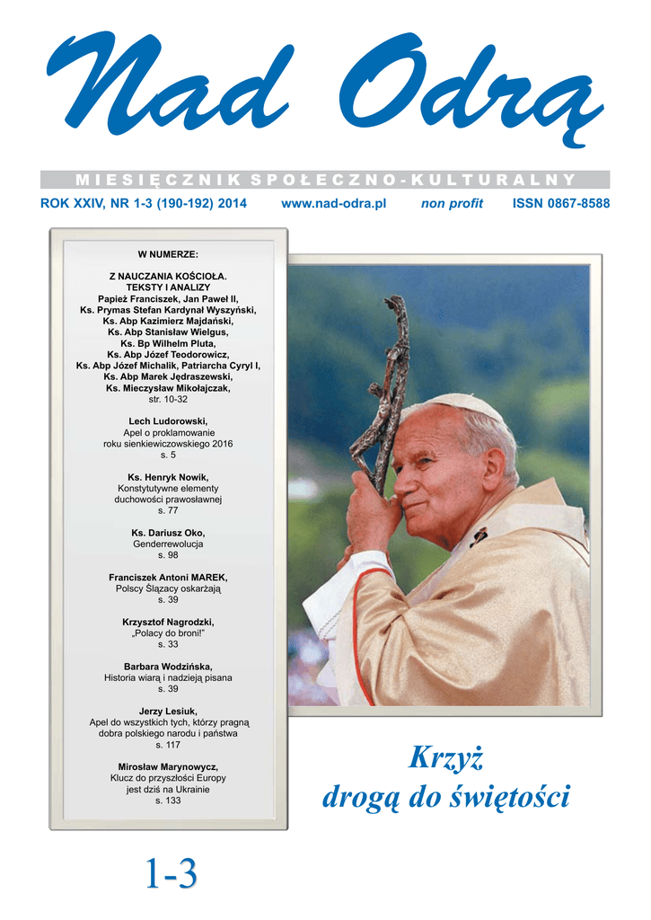MIESIĘCZNIK SPOŁECZNO-KULTURALNY ROK XXIV, NR 1-3 (190-192) 2014 www.nad-odra.pl non profit ISSN 0867-8588 W NUMERZE: Z NAUCZANIA KOŚCIOŁA. TEKSTY I ANALIZY Papież Franciszek, Jan Paweł II, Ks. Prymas Stefan Kardynał Wyszyński, Ks. Abp Kazimierz Majdański, Ks. Abp Stanisław Wielgus, Ks. Bp Wilhelm Pluta, Ks. Abp Józef Teodorowicz, Ks. Abp Józef Michalik, Patriarcha Cyryl I, Ks. Abp Marek Jędraszewski, Ks. Mieczysław Mikołajczak, str. 10-32 Lech Ludorowski, Apel o proklamowanie roku sienkiewiczowskiego 2016 s. 5 Ks. Henryk Nowik, Konstytutywne elementy duchowości prawosławnej s. 77 Ks. Dariusz Oko, Genderrewolucja s. 98 Franciszek Antoni MAREK, Polscy Ślązacy oskarżają s. 39 Krzysztof Nagrodzki, „Polacy do broni!” s. 33 Barbara Wodzińska, Historia wiarą i nadzieją pisana s. 39 Jerzy Lesiuk, Apel do wszystkich tych, którzy pragną dobra polskiego narodu i państwa s. 117 Mirosław Marynowycz, Klucz do przyszłości Europy jest dziś na Ukrainie s. 133 1-3 Krzyż drogą do świętości Papież Franciszek i Ekumeniczny Patriarcha Prawosławny Konstantynopola Bartłomiej modlą się razem w Jerozolimie 2014 przy Grobie Chrystusa o dar Wspólnej Mszy św. Miesięcznik jest wydawany dzięki wsparciu P.T. Czytelników w kraju i za granicą. Dziękujemy Autorom za bezinteresowne współredagowanie pisma. Dobroczyńców prosimy o wpłaty na konto: GBS Gorzów Wielkopolski. Oddz. Zielona Góra, 54 83 63 0004 0003 8771 2000 0001 Numer konta dla wysyłających z zagranicy: PL54836300040003877120000001 oraz BIC: GBWCPLPP Redakcja publikuje materiały, nie zawsze podzielając w całości poglądy ich Autorów. czasopismo społeczno-kulturalne założone przez ks. dra Henryka Nowika w 1991 roku Wydawca: TOWARZYSTWO KULTURY NARODOWO-RELIGIJNEJ „POLSKA BOGIEM SILNA” im. JANA PAWŁA II założone przez ks. dra Henryka Nowika w 1991 roku, 65-238 Zielona Góra, ul. Wileńska 2, tel./fax 68 320 05 02 Redaguje Zespół Międzyregionalny Redaktor odpowiedzialny i naczelny p.o.: ks. dr Henryk Nowik, tel. 510 113 495, [email protected]. Sekretarz Redakcji: dr Barbara Wodzińska, tel. 32 232 23 25 dyżur: wtorek 16.00-18.00, czwartek 16.00-18.00 Strona internetowa: www.nad-odra.pl Wydaje Towarzystwo Kultury Narodowo-Religijnej w ramach działalności statutowej jako działalność non profit. SPIS TREŚCI OD REDAKCJI ................................................................................................................................................................3 APEL Ratujmy Sienkiewiczowską Okrzeję! ............................................................................................................... 4 APEL O PROKLAMOWANIE ROKU SIENKIEWICZOWSKIEGO 2016 ....................................................................... 5 Z NAUCZANIA KOŚCIOŁA. TEKSTY I ANALIZY Papież Franciszek, Lumen Fidei ................................................................................................................................. 10 Ojciec Święty Jan Paweł II, Homilia w czasie Mszy św. w katedrze gnieźnieńskiej .................................................. 14 Ks. Prymas Stefan Kardynał Wyszyński, List Wielkopostny do Duchowieństwa i Wiernych Archidiecezji Gnieźnieńskiej i Warszawskiej ................................................................................................... 17 Ks. Abp Kazimierz Majdański, Słowo pasterskie do Kapłanów i do wszystkich Diecezjan: „Modlitwą i postem” ..... 20 Ks. Abp Stanisław Wielgus, W mojej Ojczyźnie fundamentem życia społecznego jest rodzina ............................... 21 Ks. Bp Wilhelm Pluta, Duszpasterstwo Rodzin .......................................................................................................... 24 Ks. Abp Józef Teodorowicz, Chrystus lub Antychryst ............................................................................................... 26 Ks. Abp Józef Michalik, Patriarcha Cyryl I, Wspólne przesłanie do narodów Polski i Rosji .................................... 28 Abp Marek Jędraszewski, Homilia wygłoszona 11 listopada 2013 r. w trakcie mszy świętej radiowej w kościele św. Krzyża w Warszawie ............................................................................................................... 30 Ks. Mieczysław Mikołajczak, Benedykt XVI o Janie Pawle II: Było dla mnie jasne, że jest święty ........................... 32 KULTURA NARODU. FILOZOFIA – NAUKA – HISTORIA – SZTUKA – LITERATURA Krzysztof Nagrodzki, „Polacy do broni!” .................................................................................................................... 33 Barbara Wodzińska, Historia wiarą i nadzieją pisana ................................................................................................ 39 Franciszek Antoni MAREK, Polscy Ślązacy oskarżają .............................................................................................. 48 Lech Ludorowski, Miłosne podboje Małgorzaty ......................................................................................................... 53 Bolesław Hadaczek, Kresówki – Kresy w literaturze polskiej VIII .............................................................................. 61 Włodzimierz Wawszczak, ks. Jarosław Leśniak, Święty Izydor Oracz z Madrytu ....................................................... 64 Ks. Henryk Nowik, Między płcią a miłością ................................................................................................................ 72 MIĘDZYNARODOWA KONFERENCJA: „Przyszłość chrześcijaństwa w Europie. Rola Kościołów i narodów Polski i Rosji” ................................................................................................... 75 Ks. Henryk Nowik, Konstytutywne elementy duchowości prawosławnej ................................................................... 77 Krzysztof Kołtun, Wo