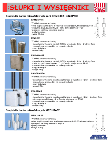 :SŁUPKI I WYSIĘGNIKI Słupki dla barier mikrofalowych serii ERMO482 i 482XPRO ERMOSP105 W skład zestawu wchodzą: dwa słupki aluminiowe, modułowe o wysokości 1,1m i średnicy 6cm ● skrzynka (wys.20,szer.17, gł.13cm) z miejscem na TR30 ● przepust kablowy wewnątrz słupka ● pręty kotwiące ● waga 14,5kg ● PALINOX W skład zestawu wchodzą: ● dwa słupki wykonane ze stali INOX o wysokości 1,2m i średnicy 6cm ● prowadzenie przewodów na zewnątrz słupka ● pręty kotwiące ● waga 5,4kg PALINOX-KIT W skład zestawu wchodzą: ● dwa słupki wykonane ze stali INOX o wysokości 1,2m i średnicy 6cm ● dwie skrzynki (wys.20,szer.17, gł.13cm) z miejscem na TR30 ● prowadzenie przewodów na zewnątrz słupka ● pręty kotwiące ● waga 10kg PAL-ERMUSA W skład zestawu wchodzą: dwa słupki wykonane z włókna szklanego o wysokości 1,26m i średnicy 6cm prowadzenie przewodów na zewnątrz słupka ● pręty kotwiące ● waga 2,3kg ● ● PAL-ERMO W skład zestawu wchodzą: ● dwa słupki wykonane z włókna szklanego o wysokości 1,26m i średnicy 6cm ● skrzynka (wys.25,szer.18, gł.9cm) z miejscem na TR30 ● prowadzenie przewodów na zewnątrz słupka ● pręty kotwiące ● waga 5,6kg Słupki dla barier mikrofalowych MEDUSA02 MEDUSA SP W skład zestawu wchodzą: dwa słupki aluminiowe, modułowe o wysokości 0,75m i śred. 6 / 4cm ● przepust kablowy wewnątrz słupka ● pręty kotwiące ● waga 6,5kg ● :SŁUPKI I WYSIĘGNIKI Słupki dla barier mikrofalowych serii CORAL CORAL SP W skład zestawu wchodzą: ● dwa słupki aluminiowe o wysokości 1,1m i średnicy 6cm ● przepust kablowy wewnątrz słupka ● pręty kotwiące Słupki i wysięgniki dla barier mikrofalowych serii MANTA MANTA SP110 W skład zestawu wchodzą: ● dwa słupki stalowe o wysokości 1,1m i średnicy 4cm ● przepust kablowy wewnątrz słupka ● pręty kotwiące MANTA SP80 ● stalowy słupek do montażu na podłożu betonowym o wysokości 0,8m i śred. 4cm ● przepust kablowy wewnątrz słupka ● wymiary podstawy 20x20cm MANTA SP35 ● stalowy wysięgnik do montażu ściennego o długości 35cm i śred. 4cm ● przepust kablowy wewnątrz słupka ● wymiary podstawy 15x15cm Wysięgniki dla barier MINERMO i ERMUSA oraz czujek ARMIDOR STAFFAMURO ● ● stalowy wysięgnik do montażu ściennego o długości 10cm i śred. 2,2cm wymiary podstawy 8x8cm STAFFAMURO 30 ● ● stalowy wysięgnik do montażu ściennego o długości 30cm i śred. 2,2cm wymiary podstawy 8x8cm STAFFAMURO 40 ● ● stalowy wysięgnik do montażu ściennego o długości 40cm i śred. 2,2cm wymiary podstawy 8x8cm STAFFAPALO ● ● stalowy wysięgnik o długości 10cm do montażu na słupku o śred. 6cm idealny do montażu na słupkach ERMOSP105, PALINOX, PAL-ERMUSA