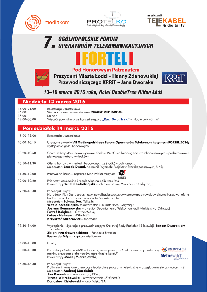 7. ogólnopolskie forum operatorów telekomunikacyjnych Pod Honorowym Patronatem Prezydent Miasta Łodzi – Hanny Zdanowskiej Przewodniczącego KRRiT – Jana Dworaka 13–16 marca 2016 roku, Hotel DoubleTree Hilton Łódź Niedziela 13 marca 2016 15.00–21.00 16.00 18.00 19.00–00.00 Rejestracja uczestników; Walne Zgromadzenie członków ZPMEiT MEDIAKOM; Kolacja; Wieczór powitalny oraz koncert zespołu „Raz. Dwa. Trzy.” w klubie „Wytwórnia” Poniedziałek 14 marca 2016 8.00–19.00 Rejestracja uczestników; 10.00–10.15 Uroczyste otwarcie VII Ogólnopolskiego Forum Operatorów Telekomunikacyjnych FORTEL 2016; wystąpienia gości honorowych; 10.20–10.50 entrum Projektów Polska Cyfrowa: Konkurs POPC na budowę sieci szerokopasmowych – podsumowanie C pierwszego naboru wniosków; 10.50–11.30 Oferta hurtowa w sieciach budowanych ze środków publicznych; Moderator: Leszek Drozd, naczelnik Wydziału Projektów Szerokopasmowych, UKE; 11.30–12.00 Przerwa na kawę – zaprasza Kino Polska Muzyka; 12.00–12.20 Priorytety legislacyjne i regulacyjne na najbliższe lata Prowadzący Witold Kołodziejski – sekretarz stanu, Ministerstwo Cyfryzacji; 12.20–13.30 Panel dyskusyjny: Narodowy Plan Szerokopasmowy, nowelizacja specustawy szerokopasmowej, dyrektywa kosztowa, oferta hurtowa – co to oznacza dla operatorów kablowych? Moderator: Łukasz Dec, Telko.in Witold Kołodziejski, sekretarz stanu, Ministerstwo Cyfryzacji; Justyna Romanowska – dyrektor Departamentu Telekomunikacji Ministerstwa Cyfryzacji; Paweł Dołębski – Gawex Media; Łukasz Hetman – ASTA-NET; Krzysztof Kacprowicz – Macrosat; 13.30–14.00 Wystąpienie i dyskusja z przewodniczącym Krajowej Rady Radiofonii i Telewizji, Janem Dworakiem, z udziałem: Zbigniewa Gawrońskiego – Fundacja Protelko Ryszarda Młynarczyka – Mediakom 14.00–15.00 Lunch; 15.00–15.30 rezentacja Systemics-PAB – Gdzie są moje pieniądze? Jak operatorzy podnoszą P marżę, przyciągają abonentów, ograniczają koszty? Prowadzący Maciej Mierzejewski; 15.30–16.30 Panel dyskusyjny: Platformy internetowe oferujące nieodpłatnie programy telewizyjne – przyglądamy się czy walczymy? Moderator: Andrzej Marciniak Jan Dworak – przewodniczący KRRiT; Teresa Wierzbowska – Stowarzyszenie „SYGNAŁ”; Bogusław Kisielewski – Kino Polska S.A.; Michał Kozicki – HBO Polska; Jarosław Pijanowski – INEA; 17.00–18.00 Seans filmowy – na pierwszy odcinek serialu „FEAR the Walking Dead”, zaprasza AMC Networks; 20.00 Gala Kablowa połączona z wręczaniem nagród specjalnych „Mocarz Kabla Polskiego”; Galę uświetni występ zespołu „Drugi Tydzień” 22.00–02.00 After Party Niespodzianka od HBO Wtorek 15 marca 2016 9.00–12.00 Rejestracja uczestników 11.00–11.30 „Inteligentne repozytorium treści multimedialnych w lokalnych sieciach TVK” Mariusz Kruger, Jacek Wyszyński, Arkadiusz Węgłowski; 11.30–12.00 „ Jak wykorzystać BRAS/BNG na platformach Cisco w celu świadczenia dodatkowych usług?” Prowadzący Piotr Szafran; 12.00–12.30 Przerwa na kawę – zaprasza FILMBOX PREMIUM; 12.30–13.30 „Psychopata za drzwiami: jak sobie radzić z ludźmi pozbawionymi sumienia?” dr Maciej Błaszak, UAM w Poznaniu, Michał Fajbusiewicz; 13.30–14.00 „Platforma OTT nowej generacji” Prowadzący Łukasz Jokiel; 14.00–15.00 Lunch; 15.00–15.30 „Wykorzystaj technologie” Prowadzący Łukasz Pryłowski; 15.30–16.00 „Wzajemne przenikanie sieci TVK i systemu LTE 800” Prowadzący Wojciech Sala; 16.00–17.00 Panel dyskusyjny: Co nowego w prawie? Prowadząca Mec. Anna Gąsecka (kancelaria BN Adwokaci); 17.00–18.00 Uroczyste zakończenie konferencji. Losowanie i wręczenie nagród dla uczestników Forum; 19.00 Kolacja i wieczór pożegnalny. Wtorek 15 marca 2016 – Program warsztatów redakcji telewizji lokalnych 11.00–11.30 „ Inteligentne repozytorium treści multimedialnych w lokalnych sieciach TVK” Mariusz Kruger, Jacek Wyszyński, Arkadiusz Węgłowski, sala główna konferencyjna 11.30–12.00 Informacje prawne, część 1 – omówienie zagadnień związanych z tematyką reklamy i sponsoringu, ograniczenia i dozwolona praktyka, mec. Anna Gąsecka – sala B, 1 piętro 12.00–12.30 Przerwa kawowa 12.30–13.00 Informacje prawne, część 2 – omówienie zagadnień związanych z tematyką reklamy i sponsoringu, ograniczenia i dozwolona praktyka, mec. Anna Gąsecka – sala B, 1 piętro 13.00–14.00 Informacje prawne, część 3 – omówienie zagadnień związanych z zatrudnieniem redaktorów i pracowników programów lokalnych (umowy zlecenia, umowy o dzieło), prawa autorskie do utworów tworzonych przez redaktorów/dziennikarzy, mec. Anna Gąsecka – sala B, 1 piętro 14.00–15.30 Przerwa obiadowa 15.30–17.00 Wizyta w TV Toya 17.00 Zakończenie warsztatów Środa 16 marca 2016 9.00–12.00 Wyjazd uczestników