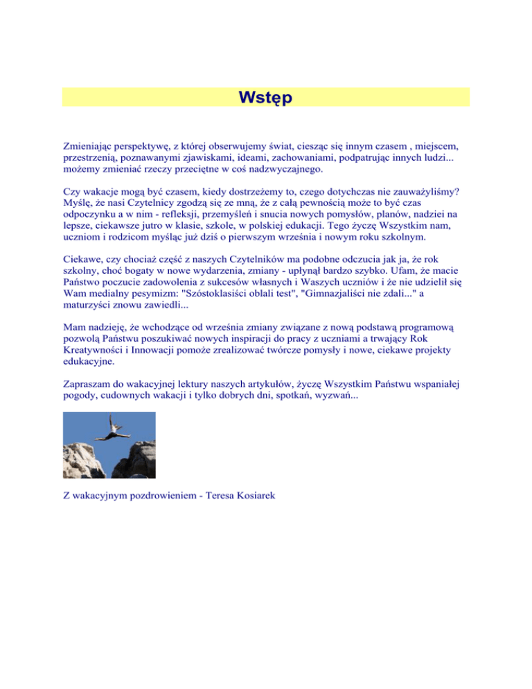 Wstęp Zmieniając perspektywę, z której obserwujemy świat, ciesząc się innym czasem , miejscem, przestrzenią, poznawanymi zjawiskami, ideami, zachowaniami, podpatrując innych ludzi... możemy zmieniać rzeczy przeciętne w coś nadzwyczajnego. Czy wakacje mogą być czasem, kiedy dostrzeżemy to, czego dotychczas nie zauważyliśmy? Myślę, że nasi Czytelnicy zgodzą się ze mną, że z całą pewnością może to być czas odpoczynku a w nim - refleksji, przemyśleń i snucia nowych pomysłów, planów, nadziei na lepsze, ciekawsze jutro w klasie, szkole, w polskiej edukacji. Tego życzę Wszystkim nam, uczniom i rodzicom myśląc już dziś o pierwszym września i nowym roku szkolnym. Ciekawe, czy chociaż część z naszych Czytelników ma podobne odczucia jak ja, że rok szkolny, choć bogaty w nowe wydarzenia, zmiany - upłynął bardzo szybko. Ufam, że macie Państwo poczucie zadowolenia z sukcesów własnych i Waszych uczniów i że nie udzielił się Wam medialny pesymizm: "Szóstoklasiści oblali test", "Gimnazjaliści nie zdali..." a maturzyści znowu zawiedli... Mam nadzieję, że wchodzące od września zmiany związane z nową podstawą programową pozwolą Państwu poszukiwać nowych inspiracji do pracy z uczniami a trwający Rok Kreatywności i Innowacji pomoże zrealizować twórcze pomysły i nowe, ciekawe projekty edukacyjne. Zapraszam do wakacyjnej lektury naszych artykułów, życzę Wszystkim Państwu wspaniałej pogody, cudownych wakacji i tylko dobrych dni, spotkań, wyzwań... Z wakacyjnym pozdrowieniem - Teresa Kosiarek Internetowy magazyn CODN 1. nr 1/2009 str. 3 Maciej Maciołek Filozofowanie bez filozofii - jak dzieci zadają pytania dorosłym i dlaczego warto ich słuchać? 2. Barbara Ochmańska Czy polska szkoła może być kuźnią talentów? str. 7 3. Krzysztof Wojewodzic Dzieci mają skrzydła, pomóż im je rozwinąć. str. 11 4. Wiga Bednarzowa str. 16 5. Krzysztof Wojewodzic, Teresa Kosiarek Jak motywować nauczycieli, aby chcieli rozwijać zdolności Szept Galileusza str. 23 uczniów? 6. str. 28 Katarzyna Kuhnke,Teresa Kosiarek Nauczanie w Finlandii i nie tylko - opracowanie na podstawie filmu Reinharda Khala str. 39 7. J.F.Smutny 8. Wokół ciebie są ludzie... (przesłanie skłaniające do refleksji) Charakterystyka zachowań ucznia uznanego za uzdolnionego str. 41 Magazyn wydawany przez Pracownię Informacji Pedagogicznej Centralny Ośrodek Doskonalenia Nauczycieli 00-478 Warszawa, Aleje Ujazdowskie 28 Redaktor prowadzący: Teresa Kosiarek tel. (22) 345 37 29 Zamieszczone w magazynie teksty prezentują poglądy ich autorów i nie są równoznaczne ze stanowiskiem CODN jako instytucji. Prawa autorskie zastrzeżone. Korzystanie z materiałów dozwolone do użytku własnego i pracy z uczniami; przedruki i inne formy używania materiałów są możliwe po uzgodnieniu z redakcją. 2 Internetowy magazyn CODN nr 1/2009 Maciej Maciołek Filozofia bez filozofii - jak dzieci zadają pytania dorosłym i dlaczego warto ich słuchać. Wszyscy znamy humorystyczne cytaty z zeszytów szkolnych. Bawimy się doskonale naiwnością, niedouczeniem, czy też nieporozumieniem do jakiego doszło na styku świata dzieci i świata dorosłych, wiedzy szkolnej i wyobraźni ucznia, pewności podręcznika i wątpliwości czytelnika. Niestety, nie wiemy jakie pytanie zadało sobie dziecko i jak z niego wyciągnęło wniosek. Bo tak naprawdę ważne są pytania, a szkoła większość pytań zamyka w treści nauczanego materiału. Stąd każde pytanie poza tym kręgiem wydaje się niestosowne. Ale czy my wiemy, choćby pobieżnie, co w naszej kulturze uważa się za stosowne dla dziecka? Czy pytanie dziecięce nie są początkiem niezakończonej nigdy z powodzeniem próby odpowiedzi na fundamentalne problemy filozoficzne. Czy filozofowie, to nie ci nieliczni, którzy zachowali i uratowali dziecięcą naiwność? Dziecko zaczyna filozofować gdy siedząc w toalecie woła: „Tato, właściwie jak to jest, że te duże drzwi do ubikacji mieszczą się w moich oczach?”. Albo pytając przy zasypianiu: „Czy rzeczy istnieją także wtedy, kiedy się na nie patrzy?”. Podczas urodzin brata pyta: „Kim byłem zanim się urodziłem?” Wiele tego rodzaju pytań wyprowadza dorosłych z równowagi. Wiele też pytań również podczas lekcji w szkole, nie zostaje dopuszczonych do głosu. Czyżby zdziwienie i zdumienie będące początkiem tych bezdomnych i bezszkolnych pytań nie miało być motorem i powodem głodu wiedzy i postępów w edukacji? Marzą się nauczycielom uczniowie ciekawi świata. Marzą się dzieci głodne wiedzy. Marzą się młodzi dociekliwi badacze, którzy swoimi pytaniami ożywiają nudne zajęcia i dowodzą, że za pytaniem ze sprawdzianu, testu, egzaminu kryje się zagadka, tajemnica, niezrozumiała jeszcze i czekająca na pytania rzeczywistość. Poeta pisał, że jako pięcioletni chłopiec wychodził na podwórko po drewno, kiedy po raz pierwszy uderzyła go – nagła, ostra świadomość – że istnieje Inny pisarz zwierzał się z dziecięcych przeżyć tak : „ Bywałem bliski szaleństwa ze zdumienia i szczęścia, jak to właściwie jest, że jakaś rzecz ni stąd, ni zowąd okazuje się żywa.” Dziecko bardziej niż człowiek dorosły wychwytuje z wielkiego świata – świat mały, a z jego wielkich cudów, wybiera szczególnie ulubione. Poeta hinduski Tagore napisał: Przypominam sobie dzień, kiedy z wysiłkiem opanowawszy alfabet języka bengalskiego, nieoczekiwanie trafiłem na pierwsze proste połączenie liter, które złożyły się razem i ofiarowały mi pierwsze słowa: „Pada deszcz. Drżą liście.” Byłem przejęty obrazem, jaki stworzyły”. Niewątpliwie każdy może wrócić pamięcią do własnego dzieciństwa i przywołać wspomnienia własnych odkryć. Uznanie dla wartości takiej wiedzy mogłoby zmienić nasze spojrzenie na dzieciństwo i wychowanie. 3 Internetowy magazyn CODN nr 1/2009 A oto inny przykład ni