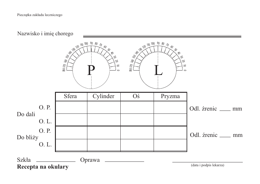 Pieczątka zakładu leczniczego Nazwisko i imię chorego 50 130 Cylinder O. P. Do dali Oś 90 80 7 0 6 110 100 0 50 L 0 20 10 30 0 20 10 30 P 120 40 40 Sfera 90 80 7 0 6 110 100 0 180 170 16 0 15 01 40 120 180 170 16 0 15 01 40 130 Pryzma Odl. źrenic mm Odl. źrenic mm O. L. O. P. Do bliży O. L. Szkła Recepta na okulary Oprawa (data i podpis lekarza) MIEJSCE DLA WYCENY Pieczątka Wydziału Zdrowia zatwierdzającego receptę Oprawa zł Cena oprawy odliczona od droższej oprawy zł Prawe szkło zł Lewe szkło zł Futerał zł Pieczątka z adresami sklepów Suma zł Usługa zł Razem zł