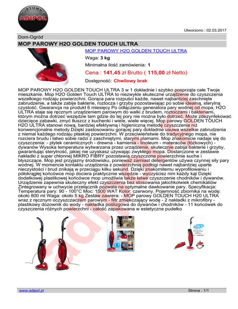 Utworzono : 02.03.2017 Dom-Ogród MOP PAROWY H2O GOLDEN TOUCH ULTRA MOP PAROWY H2O GOLDEN TOUCH ULTRA Waga: 3 kg Minimalna ilość zamówienia: 1 Cena : 141,45 zł Brutto ( 115,00 zł Netto) Dostępność: Chwilowy brak ad ip ol .p l MOP PAROWY H2O GOLDEN TOUCH ULTRA 3 w 1 dokładnie i szybko posprząta całe Twoje mieszkanie. Mop H2O Golden Touch ULTRA to niezwykle skuteczne urządzenie do czyszczenia wszelkiego rodzaju powierzchni. Gorąca para rozpuści każde, nawet najbardziej zaschnięte zabrudzenie, a także zabije bakterie, roztocza i grzyby pozostawiając po sobie idealną, sterylną czystość. Gwarancja na produkt 6 miesięcy Po odłączeniu generatora pary wodnej od mopa, H2O ULTRA staje się ręcznym urządzeniem parowym do walki z brudem, roztoczami i bakteriami, którym można dotrzeć wszędzie tam gdzie do tej pory nie można było dotrzeć. Może zdezynfekować dziecięce zabawki, zmyć tłuszcz z kuchenki i wiele, wiele więcej. Mop parowy GOLDEN TOUCH H2O ULTRA stanowi nową, bardziej efektywną i higieniczną metodę czyszczenia niż konwencjonalne metody.Dzięki zastosowaniu gorącej pary dokładnie usuwa wszelkie zabrudzenia z niemal każdego rodzaju płaskiej powierzchni. W przeciwieństwie do tradycyjnego mopa, nie rozciera brudu i łatwo sobie radzi z zaschniętymi, starymi plamami. Mop znakomicie nadaje się do czyszczenia: - płytek ceramicznych - drewna - kamienia - linoleum - materaców (łóżkowych) dywanów Wysoka temperatura wytwarzana przez urządzenie, skutecznie zabija bakterie i grzyby, gwarantując sterylność, jakiej nie uzyskasz używając zwykłego mopa. Dostarczone w zestawie nakładki z super chłonnej MIKRO FIBRY pozostawią czyszczone powierzchnie suche i błyszczące. Mop jest przyjazny środowisku, ponieważ zamiast detergentów używa czynnej siły pary wodnej. W momencie kontaktu urządzenia z powierzchnią podłogi nawet najbardziej uparte nieczystości i brud znikają w przeciągu kilku sekund. Dzięki znakomitemu wyprofilowaniu i półokrągłej końcówce mop dociera praktycznie wszędzie - wyczyścisz nim każdy kąt Dzięki dodatkowej plastikowej końcówce mop umożliwia także łatwe czyszczenie chodników i dywanów. Urządzenie zapewnia skuteczny efekt czyszczenia bez stosowania jakichkolwiek chemikaliów Zintegrowany w uchwycie przełącznik pozwala na optymalne dawkowanie pary. Specyfikacja: Temperatura pary: 90 - 100°C Moc: 1500 WAT Kolor: czerwony. Pojemność zbiornika na wodę: około 800 ml Waga: około 5 kg Zestaw zawiera: - MOP parowy GOLDEN TOUCH H20 ULTRA wraz z ręcznym oczyszczaczem parowym - filtr zmiękczający wodę - 2 nakładki z mikrofibry plastikowy dozownik do wody - nakładka poślizgowa do dywanów i chodników - 11 końcówek do czyszczenia różnych powierzchni - całość zapakowana w estetyczne pudełko www.adipol.pl Powered by TCPDF (www.tcpdf.org) Strona : 1/1