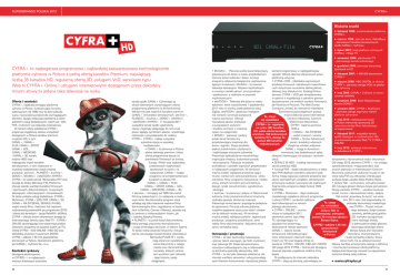 SUPERBRANDS POLSKA 2012 cyfra+ Historia marki listopad 1998: uruchomienie platformy CYFRA+ marzec 1999: start ale kino! i MiniMaxa – pierwszych kanałów tematycznych spółki CANAL+ Cyfrowy lipiec 2001: fuzja platform cyfrowych CYFRA+ i Wizja TV wrzesień 2006: start kuchni TV – pierwszego kanału kulinarnego CYFRA+ to najbogatsza programowo i najbardziej zaawansowana technologicznie platforma cyfrowa w Polsce z pełną ofertą kanałów Premium, największą liczbą 35 kanałów HD, regularną ofertą 3D, usługami VoD, serwisem typu Web tv CYFRA+ Online i usługami internetowymi dostępnymi przez dekodery. Innymi słowy to jedyna taka telewizja na rynku. Oferta i wartości CYFRA+, najdłużej istniejąca platforma cyfrowa w Polsce, funkcjonująca na rynku telewizyjnym od 1998 roku to dziś rozbudowany, nowoczesny produkt dla wymagających klientów, łączący telewizję satelitarną z całym pakietem usług dodatkowych, takich jak: VoD, PVR, multiroom czy telewizja internetowa. W ramach oferty satelitarnej CYFRA+ proponuje wyjątkowy zestaw wszystkich dostępnych w Polsce kanałów premium w jakości HD, w tym: CANAL+, CANAL+ FILM, CANAL+ SPORT, CANAL+ GOL, CANAL+ WEEKEND i CANAL+ 3D, kanały rodziny HBO oraz najbogatszy wybór kanałów tematycznych, w tym nadawane w wysokiej rozdzielczości stacje własnej produkcji: ale kino+, PLANETE+, kuchnia+, DOMO+, MiniMini+ i teleTOON+/HYPER+. CYFRA+ to wybór ponad 150 kanałów RTV oraz dostęp do blisko 400 stacji FTA. Platforma oferuje szeroki wachlarz kanałów filmowych i sportowych, dokumentalnych, muzycznych, dziecięcych, informacyjnych i rozrywkowych. To także unikalne usługi dodatkowe: CYFRA+ Multiroom, CYFRA+ VOD, PVR, CANAL+ 3D, CANAL+ NA ŻYCZENIE, SERIALE W HBO, wybór wersji filmu z lektorem lub napisami, rozbudowany przewodnik po programach (EPG) i oferta dla dorosłych – opcje RelaXXX i eXXXtra. CYFRA+ oferuje swoim abonentom dostęp do internetowego serwisu typu Web TV – CYFRA+ ONLINE zawierającego live streaming kanałów własnych, programy na życzenie (catch up TV), ofertę CYFRA+ VOD ONLINE i HBO GO oraz bibliotekę utworów muzycznych MOOD. CYFRĘ+ odbiera 1,55 mln gospodarstw domowych w Polsce. Operatorem platformy jest CANAL+ Cyfrowy Sp. z o.o. Kontekst rynkowy Dostępne ekskluzywnie w CYFRZE+ i w najlepszych sieciach kablowych autorskie 40 kanały spółki CANAL+ Cyfrowego są silnym elementem wyróżniającym ofertę programową platformy na tle konkurencji. Wśród nich jest rodzina 5 kanałów premium CANAL+ i 6 kanałów tematycznych: ale kino+, PLANETE+, kuchnia+, DOMO+, MiniMini+ i teleTOON+/HYPER+. 11 listopada 2011 wszystkie kanały spółki ujednoliciły nazwy i logotypy dołączając do nich znak plusa, będący symbolem jakości, wspólnego rodowodu i przynależności do rodziny CYFRY+. CYFRA+ nadaje wszystkie autorskie stacje w wysokiej rozdzielczości. • CANAL+ to pierwsza w Polsce płatna telewizja premium, której oferta programowa bazuje na premierach filmowych ze świata, Europy i Polski oraz najbardziej prestiżowych rozgrywkach sportowych na żywo i na wyłączność. CANAL+ nadaje programy na komplementarnych kanałach w jakości HD: CANAL+, CANAL+ FILM, CANAL+ SPORT, CANAL+ GOL, CANAL+ WEEKEND i CANAL+ 3D. • ale kino+: istniejący od 1999 roku kanał filmowy prezentuje to, co najlepsze w światowym kinie. Na różnorodny program stacji składają się tylko starannie wybrane filmy. Kontrowersyjne kino, nagradzane na festiwalach w Berlinie, Cannes i Wenecji, spotyka się tu zarówno z hollywoodzkimi hitami, jak i wybitną klasyką filmową. • PLANETE+ to polski kanał dokumentalny, który pomaga zrozumieć skomplikowany i wciąż zmieniający się świat, w którym żyjemy. To kanał, który poszerza horyzonty i kreuje opinie, poruszając kwestie bliskie człowiekowi. Ramówkę PLANETE+ wyróżniają starannie wyselekcjonowane dokumenty z całego świata oraz różnorodność tematów, których centralnym punktem jest człowiek – jego historia, pasje, osiągnięcia. grudzień 2006: pierwsza transmisja sportowa w HD • MiniMini+ : Pierwszy polski kanał telewizyjny kontent programowy w najdogodniejszy listopad 2007: 1 000 000 abonentów adresowany do dzieci w wieku przedszkolnym. sposób. Wśród obecnie oferowanych przez CYFRY+ Ceniony przez rodziców i dzieci, emituje platformę usług są: programy całkowicie bezpieczne, pozbawione • CYFRA+VOD – biblioteka najnowszych styczeń 2008: HBO DIGITAL w ofercie agresji i brutalności. MiniMini+ to również produkcji kinowych i serialowych nieemitowaCYFRY+: pierwsza usługa VOD na platfortelewizja edukacyjna. Wspiera najmłodszych nych dotychczas na antenie żadnej płatnej mie cyfrowej w rozwoju intelektualnym, emocjonalnym telewizji oraz klasyka kina. Katalog filmów maj 2008: CANAL+ Cyfrowy w nowoi społecznym, a rodziców w procesie serwisu CYFRA+ VOD jest kompletowany czesnej siedzibie wychowawczym. w oparciu o współpracę z szerokim gronem wrzesień 2008: Start lifestylowego • teleTOON+: Telewizja dla dzieci w wieku dystrybutorów, od wielkich studiów filmowych, kanału DOMO+ szkolnym, która wystartowała 1 października jak Paramount Pictures, The Walt Disney 2011 roku w wyniku przekształcenia stacji Company Limited, po wytwórnie niezależne. sierpień 2009: CYFRA+ Multiroom – pierwsza usługa tego typu wśród ZigZap. teleTOON+ dostarcza inteligentZamówienia poszczególnych pozycji platform cyfrowych nej rozrywki i promuje pozytywne można dokonać przez Internetowe To, czego wzorce zachowań. Oferuje Centrum Abonenta, Centrum maj 2010: realizacja pierwszej nie wiedziałeś najwyższej jakości produkcje Telefoniczne Abonentów w Polsce transmisji sportowej 3D CYFRA+ to: najwięcej z europejskich wytwórni CYFRY+ bądź za pomocą i pierwsza emisja filmu fabularnego na rynku (35) kanałów i studiów animacji w znacznej SMS-a. w trójwymiarze HD, pełna oferta kanałów części na wyłączność. • CANA