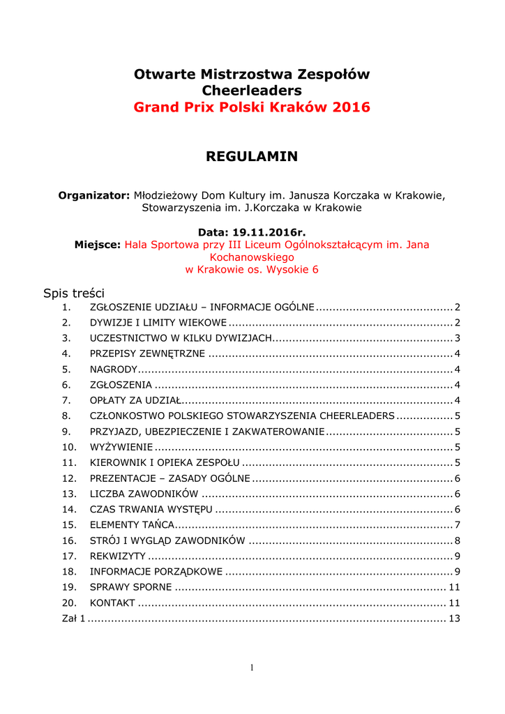 Otwarte Mistrzostwa Zespołów Cheerleaders Grand Prix Polski Kraków 2016 REGULAMIN Organizator: Młodzieżowy Dom Kultury im. Janusza Korczaka w Krakowie, Stowarzyszenia im. J.Korczaka w Krakowie Data: 19.11.2016r. Miejsce: Hala Sportowa przy III Liceum Ogólnokształcącym im. Jana Kochanowskiego w Krakowie os. Wysokie 6 Spis treści 1. ZGŁOSZENIE UDZIAŁU – INFORMACJE OGÓLNE ......................................... 2 2. DYWIZJE I LIMITY WIEKOWE ................................................................... 2 3. UCZESTNICTWO W KILKU DYWIZJACH...................................................... 3 4. PRZEPISY ZEWNĘTRZNE ......................................................................... 4 5. NAGRODY .............................................................................................. 4 6. ZGŁOSZENIA ......................................................................................... 4 7. OPŁATY ZA UDZIAŁ................................................................................. 4 8. CZŁONKOSTWO POLSKIEGO STOWARZYSZENIA CHEERLEADERS ................. 5 9. PRZYJAZD, UBEZPIECZENIE I ZAKWATEROWANIE ...................................... 5 10. WYŻYWIENIE ......................................................................................... 5 11. KIEROWNIK I OPIEKA ZESPOŁU ............................................................... 5 12. PREZENTACJE – ZASADY OGÓLNE ............................................................ 6 13. LICZBA ZAWODNIKÓW ........................................................................... 6 14. CZAS TRWANIA WYSTĘPU ....................................................................... 6 15. ELEMENTY TAŃCA................................................................................... 7 16. STRÓJ I WYGLĄD ZAWODNIKÓW ............................................................. 8 17. REKWIZYTY ........................................................................................... 9 18. INFORMACJE PORZĄDKOWE .................................................................... 9 19. SPRAWY SPORNE ................................................................................. 11 20. KONTAKT ............................................................................................ 11 Zał 1 ........................................................................................................... 13 1 1. ZGŁOSZENIE UDZIAŁU – INFORMACJE OGÓLNE Formalne zgłoszenie udziału w Grand Prix Polski polega na równoczesnym spełnieniu poniższych warunków: • Dokładne wypełnienie karty zgłoszenia (załącznik 1) • Dokonanie stosownych opłat startowych określonych w regulaminie Grand Prix (patrz punkt 7 Regulaminu) • Zespoły zagraniczne - muszą być członkiem ECU • zespoły polskie - mogą uczestniczyć jedynie te, których zawodnicy i trenerzy są aktualnymi członkami Polskiego Stowarzyszenia Cheerleaders z opłaconą składką członkowską za rok bieżący. (patrz punkt 8 Regulaminu) • zespoły przedstawiają podpisaną przez trenera listę o braku przeciwwskazań do udziału w zawodach. 2. DYWIZJE I LIMITY WIEKOWE Grand Prix Polski 2016 - Otwarte Międzynarodowe Mistrzostwa Krakowa rozgrywane będą w 3 dywizjach: a. POM Dance - zespoły W dywizji POM Dance wyróżnia się niżej wymienione kategorie wiekowe: Grupa wiekowa Wiek SENIOR II 29 lat i starsi SENIOR 14 do 29 lat JUNIOR 12 do 16 lat JUNIOR MŁODSZY 7 do 13 lat DZIECI do 8 O przynależności do danej kategorii wiekowej decyduje rok urodzenia zawodnika. b. CHEER Dance - FREESTYLE POM zespoły - CHEER HIP HOP zespoły - CHEER JAZZ zespoły 2 W dywizji CHEER Dance wyróżnia się niżej wymienione kategorie wiekowe: Grupa wiekowa Wiek SENIOR 14 lat i starsi JUNIOR 12 do 16 lat JUNIOR MŁODSZY do 13 lat O przynależności do danej kategorii wiekowej decyduje rok urodzenia zawodnika. c. CHEER - GROUP STUNT ALL-GIRL - GROUP STUNT MIX - CHEER ALL-GIRL - CHEER MIX - PARTNER STUNT W dywizji CHEER wyróżnia się niżej wymienione kategorie wiekowe: Grupa wiekowa wiek SENIOR /cheer/ 14 lat i starsi SENIOR /group stunt i partner stunt/ 15 lat i starsi JUNIOR 12 do 16 lat JUNIOR MŁODSZY do 13 lat O przynależności do danej kategorii wiekowej decyduje rok urodzenia zawodnika. 3. UCZESTNICTWO W KILKU DYWIZJACH 3.1 Zespół w dywizji cheer dance może równocześnie uczestniczyć w rywalizacji we wszystkich konkurencjach tej dywizji tzn. Freestyle Pom, Cheer Jazz, Cheer Hip hop. 3.2 Zespół w dywizji cheer dance nie może równocześnie uczestniczyć w rywalizacji sportowej w dywizji pom dance i odwrotnie. 3.3 Zespół w dywizji cheer dance lub pom dance może równocześnie uczestniczyć w rywalizacji w dywizji cheer. 3 4. PRZEPISY ZEWNĘTRZNE Grand Prix Polski - Otwarte Międzynarodowe Mistrzostwa Krakowa Zespołów Cheerleaders rozegrane zostaną zgodnie z obowiązującymi od 01.12.2015 r. Przepisami Turniejowymi i Przepisami Sędziowskimi PSCh. (dostępne na www.psch.pl) 5. NAGRODY Nagrodami w Grand Prix Polski będą medale: złoty, srebrny, brązowy w każdej dywizji i kategorii wiekowej, puchary dla zwycięskich zespołów za miejsca I-VI oraz dyplomy dla wszystkich uczestników. 6. ZGŁOSZENIA DO TURNIEJU 6.1 Zgłoszenia do turnieju należy przesłać do dnia 31.10.2016 roku na adres [email protected], kopia na [email protected] oraz [email protected]. 6.2 Zgłoszenia dokonane po terminie mogą zostać przyjęte pod warunkiem wpłacenia podwójnej opłaty startowej. 6.3 Zgłoszenie musi zawierać wypełnioną kartę zgłoszenia, potwierdzenie dokonania przelewu, podkład muzyczny oraz krótką informacje o zespole. 6.4 Organizator ma prawo do wcześniejszego zamknięcia list startowych. 6.5 W przypadku rezygnacji ze startu nie będzie zwracana opłata startowa. 6.6 Organizator zastrzega sobie prawo weryfikacji zawodników na podstawie ważnego dokumentu tożsamości w dniu zawodów. 7. OPŁATY ZA UDZIAŁ 7.1 Każdy ze