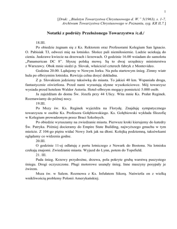 1 [Druk: „Biuletyn Towarzystwa Chrystusowego d. W.” 5(1963), s. 1-7, Archiwum Towarzystwa Chrystusowego w Poznaniu, syg. KR II,7.] Notatki z podróży Przełożonego Towarzystwa /c.d./ 18.III. Po obiedzie żegnam się z Ks. Rektorem oraz Profesorami Kolegium San Ignacio. O. Pabisiak TJ, odwozi mię na lotnisko. Słońce pali niemiłosiernie. Ludzie uciekają do cienia. Jaskrawe kwiecie na drzewach i krzewach. O godzinie 16.00 wsiadam do samolotu „Panamerican DC 8”. Słyszę polską mowę. Są to dwaj urzędnicy ministerstwa z Warszawy. Obok mnie siedzi p. Slovak, właściciel czterech fabryk z Montevideo. Godzina 20.00. Lądujemy w Nowym Jorku. Na polu startowym śnieg. Zimny wiatr hula po olbrzymim lotnisku. Rewizja celna dosyć dokładna. Z p. Slovakiem jedziemy taksówką do miasta. To jakieś 40 km. Wspaniała droga, fantastycznie oświetlona. Przed nami wyrastają słynne wysokościowce. Mój towarzysz wysiada przed hotelem Waldor Astoria. Hotel-olbrzym mogący pomieścić 5.000 osób. Ja zajeżdżam do domu Św. Józefa przy 44 Ulicy. Wita mnie Ks. Prałat Reginek. Rozmawiamy do późnej nocy. 19.III. Po Mszy św. Ks. Reginek wyjeżdża na Florydę. Znajduję sympatycznego towarzysza w osobie Ks. Profesora Gołębiowskiego. Ks. Gołębiowski wykłada filozofię w Kolegium prowadzonym przez Braci Szkolnych. Po obiedzie wyruszamy na zwiedzanie miasta. Pierwsze kroki kierujemy do katedry Św. Patryka. Później docieramy do Empire State Building, najwyższego gmachu w tym mieście. Z 104-go piętra widać Nowy Jork jak na dłoni. Kolejką podziemną, taksówkami oglądamy co widzenia godne. 20.III. O godzinie 11-ej odlatuję z portu lotniczego z Newark do Bostonu. Na lotnisku czekają znajomi. Zwiedzanie miasta. Wyjazd do Lynn, potem do Topsfield. 21. III. Pada śnieg. Krzewy przydrożne, drzewa, pola pokryte grubą warstwą puszystego śniegu. Drogi oczyszczone. Pługi motorowe usunęły śnieg. Inne maszyny posypały je żwirem. Msza św. w Salem. Rozmowa z Ks. Infułatem Sikorą. Naświetla on z wielką wnikliwością problemy Polonii Amerykańskiej. 2 Jedziemy do New Bedford. Po drodze wstępujemy do Lynn, by odwiedzić Ks. Prob. Cieszyńskiego. Dojeżdżamy do New Bedford. Szukamy kościoła pod wezwaniem Św. Kazimierza. Wreszcie go odnajdujemy. Ks. Prob. Kwiatkowski przycina krzewy przy plebanii. Kościół nieduży, świeżo zbudowany. Kosztował 250.000 dolarów. Ks. Proboszczowi pomaga przelotnie Ks. Józef Mikołajewski T.Chr. Nie zastajemy go w domu. Głosi on rekolekcje w Fall River. Jesteśmy w Fall River. Wchodzimy do kościoła polskiego. Na ambonie Ksiądz Józef. Mówi z zapałem o miłosierdziu Bożym. Gdy mię zobaczył, przystanął na chwileczkę, a potem już mówił swobodnie do końca. Spotykamy się po nabożeństwie. Aż trudno się oswoić z myślą, że spotykamy się na dalekiej amerykańskiej ziemi. [s. 1] Wieczorom powrót do Bostonu. Stąd odlot do Nowego Jorku. Zachwycam się panoramą, widokiem tego miasta-olbrzyma, czarującego swym bajkowym oświetleniem. 22.III. Spotykam się z O. Michałem Zembrzuskim, Przełożonym OO. Paulinów w Ameryce. Jest on inicjatorem budowy Częstochowy Amerykańskiej w Doyleatown. Pokazuje mi plany. Wspaniałe przedsięwzięcie. Na razie zbiera fundusze. Koszt budowy 6 milionów dolarów. Zwiedzamy miasto. Rozpoczynamy od starego miasta, a kończymy na gmachu O.N.Z. Istna to wieża Babel języków, strojów i zwyczajów. Wieczorem oglądamy film angielski w jednym z wielkich kin amerykańskich. 23.III. Zwiedzamy w dalszym ciągu. Odwiedzam znajomych. Wszyscy bardzo usłużni. Podziwiam ich gościnność. 24.III. Niedziela. Jadę na obchód 50-lecia domu Sióstr Felicjanek w Lodi - jakieś 40 km od Nowego Jorku. Kiedyś było tu szczere pole. Pierwszy dom liczył 6 Sióstr. Dziś jest tu 80 zakonnic. Sam budynek, w którym mieści się gimnazjum, kosztował półtora miliona dolarów. Mszę św. pontyfikalną celebruje Arcybiskup z Newarku. Kazanie głosi Prowincjał Księży Marianów, były wychowanek zakładu w Lodi. Obecnych trzech biskupów, kilkudziesięciu księży. Po obiedzie akademia w sali gimnazjalnej. Poziom wysoki. Bogate stroje, wyszukane dekoracje świadczą o zamożności uczennic. 25.III. Odlot z lotniska w Newark do Detroit. Na lotnisku oczekuje mnie Ks. Prof. Peszkowski z Seminarium w Orchard Lake. Z lotniska do Zakładu 50 km. Drogi wspaniałe. Mimo to budują obok nich nowe super-autostrady ekspresowe. 3 Dojeżdżamy do Seminarium. Jest tu niemałe święto. Dziś odprawiła się pierwsza Msza święta w nowozbudowanym kościele seminaryjnym. Kościół w kształcie namiotu. Prostota pomieszana z luksusem. Do budowy sprowadzono najszlachetniejsze marmury z Italii. Koszt - pół miliona. Po południu jestem w domu prowincjalnym Sióstr Felicjanek w Livonn. Kompleks najnowocześniejszych gmachów w olbrzymim, wspaniałym parku. Świątynia zakonna mieni się od marmurów i złotych ozdób. Siostry budują nowe Kolegium na 800 uczennic. Na skraju parku znajduje się wielki szpital, również własność Sióstr. 26.III. Dziś słoneczny, piękny dzień. Szpaki wygwizdują wśród gałęzi starych klonów i lip parku seminaryjnego. Jedziemy do Cranebrock. Zwiedzamy nowoczesną szkołę amerykańską umieszczoną w budynkach zbudowanych na wzór słynnego Cranebrock w Anglii. 27.III. Wyruszamy do Detroit. Odwiedzam Zakład Sióstr Felicjanek, w pobliżu kościoła Św. Wojciecha. Do tego domu Ks. Dąbrowski sprowadził pierwsze Felicjanki z Polski. [s. 2] Jestem w parafii Św. Wojciecha, Niepokalanego Poczęcia i Najśw. Serca Maryi. 28.III. W dalszym ciągu odwiedzanie parafii polskich w Detroit - Św. Stanisława, Św. Floriana, Św. Andrzeja, Św. Jacka i Bł. Kunegundy. 29.III. Jestem na lekcji Języka polskiego w Seminarium. Przemawiam do kleryków. Jutro wygłoszę wykład dla całego Seminarium. Pojutrze znowu do Detroit. Mam bilet na koncert chóru Stuligrosza z Poznania. 30.III. Do Orch
