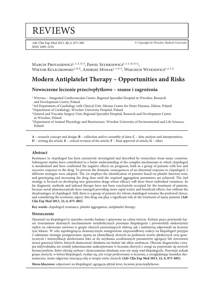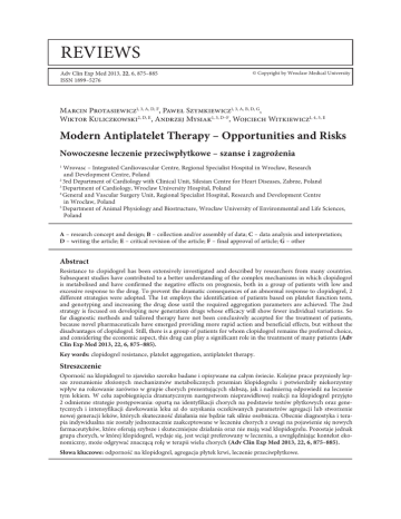 Reviews Adv Clin Exp Med 2013, 22, 6, 875–885 ISSN 1899–5276 © Copyright by Wroclaw Medical University Marcin Protasiewicz1, 3, A, D, F, Paweł Szymkiewicz1, 3, A, B, D, G, Wiktor Kuliczkowski2, D, E, Andrzej Mysiak1, 3, D–F, Wojciech Witkiewicz1, 4, 5, E Modern Antiplatelet Therapy – Opportunities and Risks Nowoczesne leczenie przeciwpłytkowe – szanse i zagrożenia Wrovasc – Integrated Cardiovascular Centre, Regional Specialist Hospital in Wrocław, Research and Development Centre, Poland 2 3rd Department of Cardiology with Clinical Unit, Silesian Centre for Heart Diseases, Zabrze, Poland 3 Department of Cardiology, Wroclaw University Hospital, Poland 4 General and Vascular Surgery Unit, Regional Specialist Hospital, Research and Development Centre in Wrocław, Poland 5 Department of Animal Physiology and Biostructure, Wrocław University of Environmental and Life Sciences, Poland 1 A – research concept and design; B – collection and/or assembly of data; C – data analysis and interpretation; D – writing the article; E – critical revision of the article; F – final approval of article; G – other Abstract Resistance to clopidogrel has been extensively investigated and described by researchers from many countries. Subsequent studies have contributed to a better understanding of the complex mechanisms in which clopidogrel is metabolised and have confirmed the negative effects on prognosis, both in a group of patients with low and excessive response to the drug. To prevent the dramatic consequences of an abnormal response to clopidogrel, 2 different strategies were adopted. The 1st employs the identification of patients based on platelet function tests, and genotyping and increasing the drug dose until the required aggregation parameters are achieved. The 2nd strategy is focused on developing new generation drugs whose efficacy will show fewer individual variations. So far diagnostic methods and tailored therapy have not been conclusively accepted for the treatment of patients, because novel pharmaceuticals have emerged providing more rapid action and beneficial effects, but without the disadvantages of clopidogrel. Still, there is a group of patients for whom clopidogrel remains the preferred choice, and considering the economic aspect, this drug can play a significant role in the treatment of many patients (Adv Clin Exp Med 2013, 22, 6, 875–885). Key words: clopidogrel resistance, platelet aggregation, antiplatelet therapy. Streszczenie Oporność na klopidogrel to zjawisko szeroko badane i opisywane na całym świecie. Kolejne prace przyniosły lepsze zrozumienie złożonych mechanizmów metabolicznych przemian klopidogrelu i potwierdziły niekorzystny wpływ na rokowanie zarówno w grupie chorych prezentujących słabszą, jak i nadmierną odpowiedź na leczenie tym lekiem. W celu zapobiegnięcia dramatycznym następstwom nieprawidłowej reakcji na klopidogrel przyjęto 2 odmienne strategie postępowania: opartą na identyfikacji chorych na podstawie testów płytkowych oraz genetycznych i intensyfikacji dawkowania leku aż do uzyskania oczekiwanych parametrów agregacji lub stworzenie nowej generacji leków, których skuteczność działania nie będzie tak silnie osobnicza. Obecnie diagnostyka i terapia indywidualna nie zostały jednoznacznie zaakceptowane w leczeniu chorych z uwagi na pojawienie się nowych farmaceutyków, które oferują szybsze i skuteczniejsze działania oraz nie mają wad klopidogrelu. Pozostaje jednak grupa chorych, w której klopidogrel, wydaje się, jest wciąż preferowany w leczeniu, a uwzględniając kontekst ekonomiczny, może odgrywać znaczącą rolę w terapii wielu chorych (Adv Clin Exp Med 2013, 22, 6, 875–885). Słowa kluczowe: odporność na klopidogrel, agregacja płytek krwi, leczenie przeciwpłytkowe. 876 Antiplatelet agents have been the major type of pharmacological treatment in atherosclerotic cardiovascular diseases for many years. After decades of aspirin (ASA) being used alone, it was adjoined with thienopyridine derivatives, particularly clopidogrel. The high efficacy of clopidogrel was confirmed in a number of randomized clinical trials. In combination with aspirin this drug became a part of routine pharmacological regimes in the treatment of patients with acute coronary syndrome (ACS) and those who had percutaneous coronary interventions (PCI). Over time, reports were published on patients who had suboptimal responses to treatment with clopidogrel. Initially, this problem was named as resistance to clopidogrel and later a more precise definition was adopted: high on-treatment platelet reactivity. According to different authors this reaction is found in 5–44% of patients [1]. There is substantial evidence that low platelet inhibition demonstrated by laboratory tests in patients during treatment with clopidogrel is associated with a higher risk of adverse cardiovascular events compared with patients who adequately respond to clopidogrel [2]. Assuming that globally over 40 m people are taking clopidogrel, the problem of low response to this drug has become particularly important. Potential tools for the identification of low responders to clopidogrel include genetic tests and in vitro platelet function tests. These tests, however, have not been conclusively standardized and accepted. According to current opinion, even a partial evaluation of responsiveness to treatment with clopidogrel requires the use of a relevant in vitro test and patient genotyping. According to the current guidelines of the European Society of Cardiology (ESC, 2011) on the diagnosis and treatment of patients with acute coronary syndrome without persistent ST-segment elevation, such a procedure is recommended as a diagnostic element only in selected cases (class of recommendation IIb, level of evidence C). While trying to classify patients with low response to antiplatelet treatment scientists sought alternative methods to treatment with 