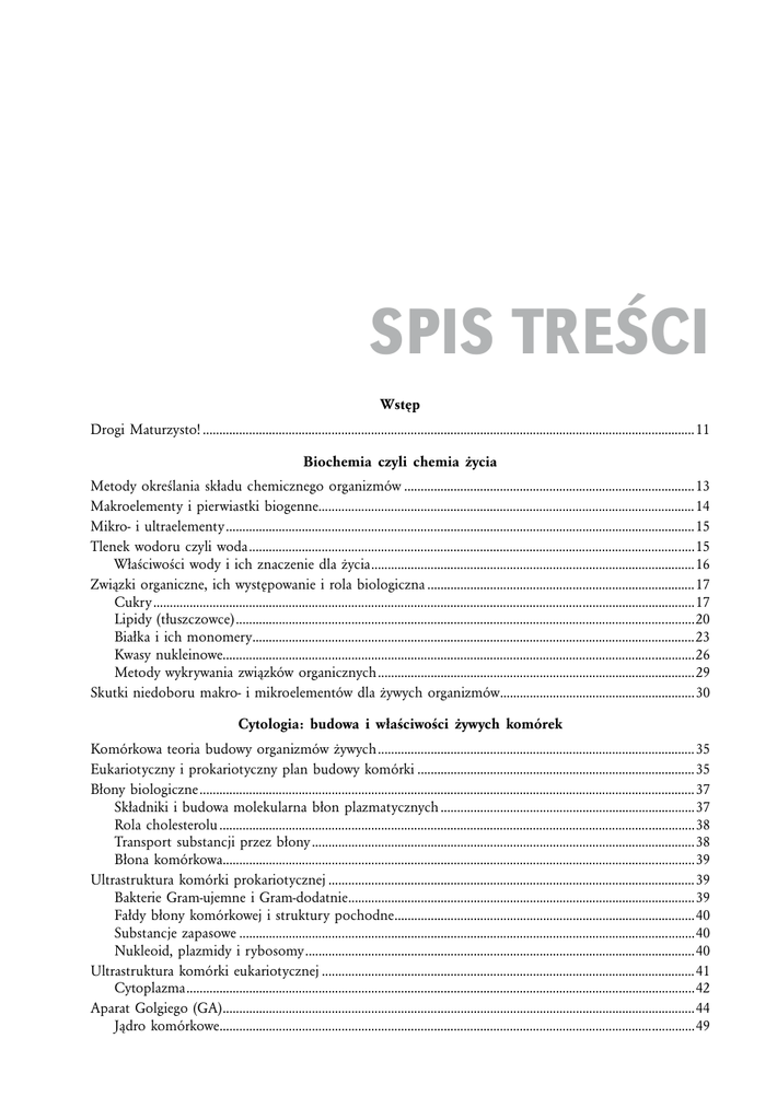 Spis treści Wstęp Drogi Maturzysto!......................................................................................................................................................11 Biochemia czyli chemia życia Metody określania składu chemicznego organizmów.........................................................................................13 Makroelementy i pierwiastki biogenne..................................................................................................................14 Mikro- i ultraelementy...............................................................................................................................................15 Tlenek wodoru czyli woda........................................................................................................................................15 Właściwości wody i ich znaczenie dla życia...................................................................................................16 Związki organiczne, ich występowanie i rola biologiczna..................................................................................17 Cukry.....................................................................................................................................................................17 Lipidy (tłuszczowce)............................................................................................................................................20 Białka i ich monomery.......................................................................................................................................23 Kwasy nukleinowe...............................................................................................................................................26 Metody wykrywania związków organicznych.................................................................................................29 Skutki niedoboru makro- i mikroelementów dla żywych organizmów............................................................30 Cytologia: budowa i właściwości żywych komórek Komórkowa teoria budowy organizmów żywych.................................................................................................35 Eukariotyczny i prokariotyczny plan budowy komórki.....................................................................................35 Błony biologiczne....................................................................................................................................................... 37 Składniki i budowa molekularna błon plazmatycznych..............................................................................37 Rola cholesterolu.................................................................................................................................................38 Transport substancji przez błony.....................................................................................................................38 Błona komórkowa................................................................................................................................................39 Ultrastruktura komórki prokariotycznej................................................................................................................39 Bakterie Gram-ujemne i Gram-dodatnie..........................................................................................................39 Fałdy błony komórkowej i struktury pochodne............................................................................................40 Substancje zapasowe...........................................................................................................................................40 Nukleoid, plazmidy i rybosomy.......................................................................................................................40 Ultrastruktura komórki eukariotycznej..................................................................................................................41 Cytoplazma...........................................................................................................................................................42 Aparat Golgiego (GA)................................................................................................................................................44 Jądro komórkowe.................................................................................................................................................49 4 Spis treœci Fizjologia żywej komórki Metabolizm komórkowy...........................................................................................................................................52 Enzymy..................................................................................................................................................................52 Tempo reakcji enzymatycznej...........................................................................................................................54 Enzymy i szlaki metaboliczne...........................................................................................................................56 Procesy anaboliczne i kataboliczne..................................................................................................................57 ATP jako uniwersalna waluta energetyczna....................................................................................................57 Odżywianie się komórek...........................................................................................................................................58 Autotrofy...............................................................................................................................................................58 Przyswajanie azotu atmosferycznego u bakterii autotroficznych..............................
