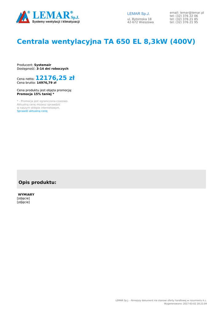 LEMAR Sp.J. ul. Bytomska 18 42-672 Wieszowa email: [email protected] tel: (32) 376 22 06 tel: (32) 376 21 85 tel: (32) 376 21 95 Centrala wentylacyjna TA 650 EL 8,3kW (400V) Producent: Systemair Dostępność: 3-14 dni roboczych 12176,25 zł Cena netto: Cena brutto: 14976,79 zł Cena produktu jest objęta promocją: Promocja 15% taniej * * - Promocja jest ograniczona czasowo. Aktualną cenę możesz sprawdzić w naszym sklepie internetowym. Sprawdź aktualną cenę Opis produktu: WYMIARY [zdjęcie] [zdjęcie] LEMAR Sp.J. - Niniejszy dokument nie stanowi oferty handlowej w rozumieniu k.c. Wygenerowano: 2017-03-02 18:21:04 Powered by TCPDF (www.tcpdf.org)