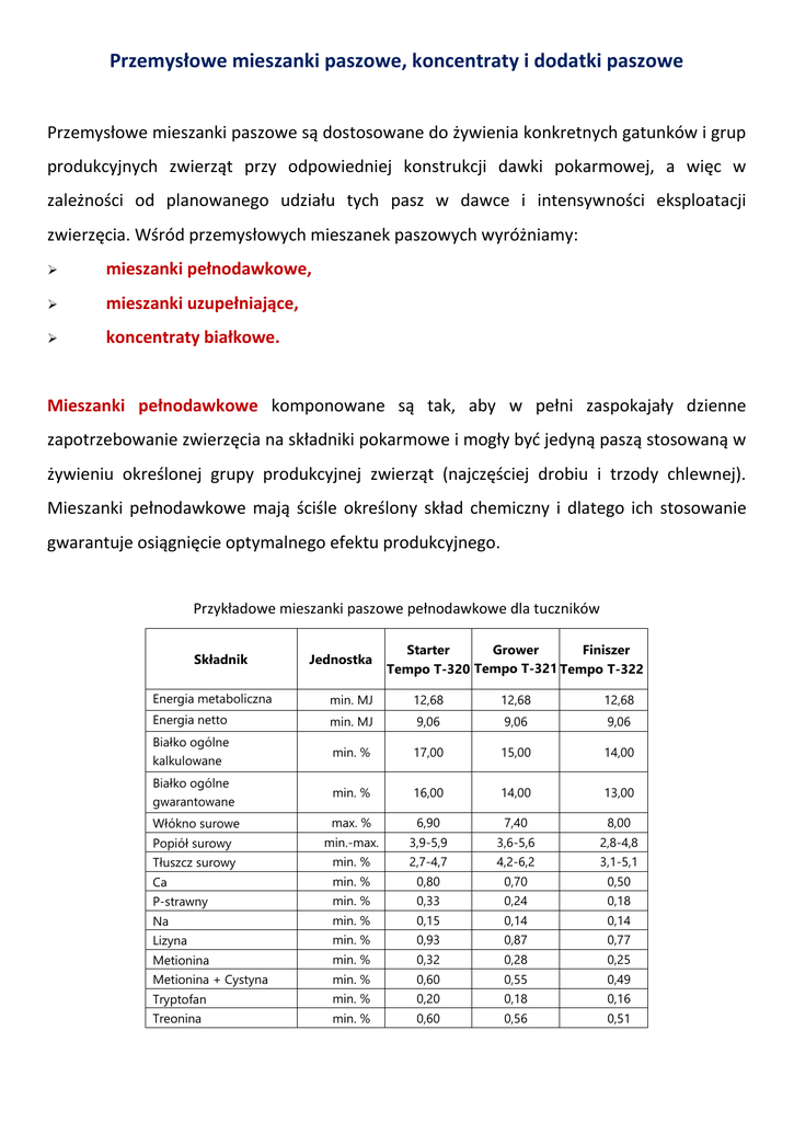 Przemysłowe mieszanki paszowe, koncentraty i dodatki paszowe Przemysłowe mieszanki paszowe są dostosowane do żywienia konkretnych gatunków i grup produkcyjnych zwierząt przy odpowiedniej konstrukcji dawki pokarmowej, a więc w zależności od planowanego udziału tych pasz w dawce i intensywności eksploatacji zwierzęcia. Wśród przemysłowych mieszanek paszowych wyróżniamy: mieszanki pełnodawkowe, mieszanki uzupełniające, koncentraty białkowe. Mieszanki pełnodawkowe komponowane są tak, aby w pełni zaspokajały dzienne zapotrzebowanie zwierzęcia na składniki pokarmowe i mogły być jedyną paszą stosowaną w żywieniu określonej grupy produkcyjnej zwierząt (najczęściej drobiu i trzody chlewnej). Mieszanki pełnodawkowe mają ściśle określony skład chemiczny i dlatego ich stosowanie gwarantuje osiągnięcie optymalnego efektu produkcyjnego. Przykładowe mieszanki paszowe pełnodawkowe dla tuczników Składnik Jednostka Starter Grower Finiszer Tempo T-320 Tempo T-321 Tempo T-322 Energia metaboliczna min. MJ 12,68 12,68 12,68 Energia netto min. MJ 9,06 9,06 9,06 Białko ogólne kalkulowane min. % 17,00 15,00 14,00 Białko ogólne gwarantowane min. % 16,00 14,00 13,00 max. % 6,90 7,40 8,00 Popiół surowy min.-max. 3,9-5,9 3,6-5,6 2,8-4,8 Tłuszcz surowy min. % 2,7-4,7 4,2-6,2 3,1-5,1 Ca min. % 0,80 0,70 0,50 P-strawny min. % 0,33 0,24 0,18 Na min. % 0,15 0,14 0,14 Lizyna min. % 0,93 0,87 0,77 Metionina min. % 0,32 0,28 0,25 Metionina + Cystyna min. % 0,60 0,55 0,49 Tryptofan min. % 0,20 0,18 0,16 Treonina min. % 0,60 0,56 0,51 Włókno surowe Mieszanki uzupełniające zawierają powyżej 10% białka i są dodatkiem do pasz gospodarskich. W ich skład wchodzą zwykle śruty zbożowe i otręby, śruty poekstrakcyjne, śruty z nasion roślin strączkowych lub odpowiedni koncentrat czy superkoncentrat. Zawartość białka dostosowana jest do zestawu pasz objętościowych, jakimi żywione są zwierzęta w różnych okresach żywieniowych. Mieszanki paszowe uzupełniające przeznaczone dla bydła mlecznego decydują o możliwościach zwiększenia produkcji mleka. Przykładowe mieszanki paszowe uzupełniające dla krów Składniki Białko ogólne Energia metaboliczna Włókno surowe max Bezazotowe wyciągowe Wapń (Ca) Fosfor (P) Sód (Na) Chlorek sodu (NaCl) J.M. % MJ % % % % % % Krowa Z Krowa L (Z- okres zimowy) (L – okres letni) 19,5 6,00 7,00 55,0 13,0 6,00 5,00 65,0 0,90 0,70 0,20 0,50 0,80 0,80 0,20 0,50 Krowa M (M- dla krów wysokomlecznych) 25,0 6,00 7,50 50,0 1,20 0,80 0,20 0,50 Koncentraty białkowe są paszami zawierającymi powyżej 30% białka, a superkoncentraty powyżej 40% białka. W ich skład wchodzą śruty poekstrakcyjne, śruty i nasiona roślin strączkowych oraz dodatki stymulujące (witaminy, składniki mineralne, antybiotyki i probiotyki). Koncentraty i superkoncentraty wykorzystuje się do przygotowania mieszanek z własnych śrut zbożowych. Dodaje się do 20% koncentratu lub 10% superkoncentratu, wzbogacając w ten sposób pasze gospodarskie w białko. Dodatki paszowe stanowią uzupełnienie składników mineralnych i witamin w paszach naturalnych, niezbędne w intensywnej produkcji zwierzęcej. Kreda pastewna jest związkiem wapniowym. Zawiera również małe ilości potasu, sodu, magnezu i żelaza. Dodatek kredy do dawki żywieniowej wynosi 10 g na 100 kg masy ciała. Dla drobiu dobrym źródłem wapnia są również skorupy jaj. Związki wapniowo-fosforowe znajdują się w fosforanach mineralnych i mączkach kostnych surowych, odklejonych i precypitowanych. Mączki zwierzęce zawierają dość trudno przyswajalny trójfosforan wapnia. Fosforany paszowe mineralne to jedno- dwu- i trójwapniowe fosforany oraz niewielkie ilości sodowych, potasowych i amonowych, łatwiej przyswajalne dla zwierząt. W fosforanach wapniowych znajduje się 17-23 % fosforu i 1834% wapnia. Podawanie zwierzętom związków zawierających fosfor jest wskazane, ponieważ w paszach pochodzenia roślinnego występują jego niedobory lub występuje w powiązaniu z fityną, co ogranicza jego przyswajalność. Na rynku paszowym spotyka się wiele dodatków mineralnych o różnych nazwach handlowych. Preparaty zawierające sól pastewną sprzedawane są w postaci specjalnych bloków zwanych lizawkami. Mieszanki, które zawierają składniki mineralne, witaminy, antybiotyki, probiotyki, kokcydiostatyki (dla drobiu) i inne dodatki wpływające na zdrowie i produkcyjność zwierząt noszą nazwę premiksów. Dodaje się je do pasz w ilościach 0,5-1%. Niektóre mieszanki mineralne zawierają w swoim składzie także mikroelementy.