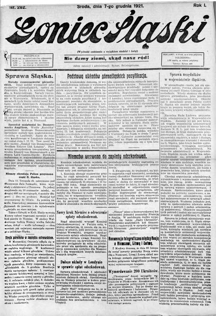 ivr. zöz. Rok I. Środa, dnia 7-go grudnia 1921. (Wychodzi codziennie z wyjątkiem niedziel i świąt) \ PRZEDPŁATA: 14.10 mk. na ćwierć roku bez odnoszenia 16.50 „ z odnoszeniem do domu 4.70 „ na miesiąc bez odnoszenia 5.50 „ na miesiąc z odnoszeniem S p ra w a Ś lą s k a . Narady rzeczoznawców górnoślą skich. Rząd polski w yznaczył jako ek sp ertó w g ó rn o śląsk ich , oprócz pp. Z y g m u n ta Seydy i b. m in is tra Engli•h a, p. K uczyńskiego. N arad y rzeczo znaw ców g ó rn o śląsk ich toczą się obec nie w W arszaw ie. W iadom ość, iż w n a ra d a c h ty c h bierze u d z ia ł poseł K or fanty, w edle dzisiejszych dzienników w arszaw sk ich , p o tw ierd za się. Rząd T s k i u w a ż a śm ierć p. D iam an d a za e|K p lk ą s tra tę : obecnie jest b ardzo tru ffAo znaleźć rów nie zn akom itego zn aw cę sp ra w ekonom icznych i sk a rb o w ych, ja k im był ś. p. D iam and. R BK LAMY : 4.s")0mk. za wiersz petytowy Nie damy ziemi, ską d n asz ród! Adres redakcji i administracji: Bytom, Brüningstrasse. Podstaw uBładto górnoślasKicb pccyfiKacja. G azety k ra k o w sk ie donoszą, iż w e dle o św iadczenia jednego z w y b itn y ch u czestników w u k ła d a c h g ó rn o ślą sk ich w y tyczną lin ją w u k ła d a c h bę dzie — p acy fik acja. Ów u czestn ik z a znaczył, że ze stro n y polskiej w y su n ię to n a czoło zasad ę pacy fik acji i k o nieczności p o w ro tu do sto su n k ó w , um o żliw iający ch n o rm a ln ą pracę, k tó rej ta k gorąco p rag n ie G órny Ś ląsk . Zaznaczono też, że u trz y m a n ie w całej p ełn i życia gospodarczego p b u części G órnego Ś ląsk a, pow inno być m y ślą p rzew o d n ią u k ład ó w , k tó re m u szą być ożyw ione d u ch em pojednaw czym i po rz u c e n ia politycznych anim ozyj. W ty m sam y m m n iej w iecej d u ch u p rze m a w ia ła i d eleg acja n iem ieck a n a od bytej 23. list. k o n feren cji. D elegacja p o lsk a p rzed ło ży ła p ro je k t re g u la m in u k o n feren cji. Chodzi d eleg acji polsk. o to, aby przez przedłożenie w łasnego r e g u la m in u uniem ożliw ić N iem com s a b o taż pracy. K onw encja m a być spis a x a w yłącznie w języku fra n c u s k im Sprzedaż m ajętności hr. Donnersm arka A nglikom . W edle „K ato lik a“ p o siadłości h rabiego D o n n ersm ark a ' sp rzed an e zostały tow . an g ielsk iem u z siedzibą, w L ondynie. Z apis do re je s tru kandlow ego w L o n d y n ie d o k o n a n y zo stał d n ia 1. 12. 21. Tow. nosić bę dzie nazw ę „H enkel von D o n n ersm ark B eu th en E sta te s Ltd. L o n d o n “. P ie r w szym p rezy d en tem to w arzy stw a jest h ra b ia E d g a rd von D o n n e rsm a rk a. za stęp ca L ord C ozens-H ardy. D y rek cja te ch n icz n a w w ojew ództw ie Śląskiem zostanie bez zm iany, praw dopodobK om isja odszkodow ań w y sła ła do nem je st p rzesła n ie w c h a ra k te rz e dy rz ą d u niem ieckiego notę za w ie ra ją c ą re k to ró w re p reze n tató w an g ielskiego w ezw anie do z ap łaty odszkodow ań. k a p ita łu . T reść no ty je st n a stę p u ją c a : 1. K om isja o b staje stanow czo p rzy N iem cy okradają P olsce przyznaną tem , by rząd niem ieck i poczynił k o część 6 . Śląska. nieczne zarz ąd zen ia w celu u b ezp ie Dnia 11. listopada rb. zatrzymano pod czenia r a t p ła tn y c h 15 sty czn ia i 15 lu ©horzowem dwie furmanki, które wyje tego 1922 ro k u . Rząd niem ieck ie z a chały z elektrowni z Chorzowa. N a jednej pobiegnie w te n sposób pow ażnym anajdowało się 50 centnarów miedzi, na sk u tk o m , k tó re z konieczności w y n ik drugiej 600 rur mosiążnych, 6 metrów dłu n ęłyby d la N iem iec w razie n iew y p łagości i dwa cm. grubości. M aterjał był cen ia r a t w w sp o m n ian y m te rm in ie. K om isja w zyw a n ag ląco rz ą d n ie m ie przyznaczony do Gliwic. Za pomocą pa- cki, by poczynił w szelkie niezbędne trolki francuskiej zmuszono kierowników k ro k i w sto s u n k u do sw oich o b yw ateli, ^y m an ek do powrotu i do wyładowania . yterjału na stare miejsce. Także z fabryki w Król. Hucie wywożą üiemcy całymi wagonami surowiec z wiel kich pieców do Niemiec. W okolicy WalRząd niem iecki wręczył Komisji «fenburga budują Niemcy wielką fabrykę Odszkodowawczej w Paryżu notę, w áelaza, dokąd — wedle informacji — chcą której oświadcza, iż uw aża się za zu wywieść jak najwięcej m aterjału surowe pełnie w prawie, jeśli powołując się na go z polskiego kląska. Traktat W ersalski, pragnie uzyskać odroczenie spłaty odszkodowań. Rząd Streik 'górników v zagłębiu ostrawskiem. niem iecki zwraca uw agę Kom isji Od W Morawskiej Ostrawie odbyła się w szkodowawczej na żyw iołow e skutki, któreby pociągnęło za sobą odm ów ie nobotę konferencja górniczych karwińskienie przez nią zgodzenia się na propo jfo zagłębia węglowego. W konferencji zycje niem ieckie nietylko dla N iem iec wzięło udział kilkuset górników. Uchwa ale i dla w szystkich innych in tereso lono rer.olucję, w której po stwierdzeniu, w anych krajów. óe przedsiębiorcy górniczy odrzucili słuwne żądania górników, proklamowano r^ e jk generalny, który rozpocznie się w, ^niedziałek dn. 5. grudnia. Rezolucja stawia następujące żądania: 1. rozwiąsaSprawa odszkodowań i zdolności mie umowy kolektywnej zawartej w listo płatniczej N iem iec była dzisiaj przed padzie i zawarcie nowej umowy z górnika- m iotem dalszych obratL Spodziewają » i, 2 . cofnięcie redukcji plac, 3. dodatko się, że Niem cy przecież w końcu prze wa wypłata kwot, o które zniżono wypłatę zw yciężą trudności i spełnią swoje zo •statnich zarobków górników. Tylko w bowiązania odszkodowawcze. „Daily Mail“ w skazuje na to, iż w yazie przyjęcia tych ijzech żądań górnicy spraw ie tej jest m ożliw e porozum ienie kyliby skłonni do zrezy