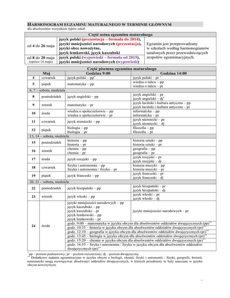 HARMONOGRAM EGZAMINU MATURALNEGO W TERMINIE GŁÓWNYM dla absolwentów wszystkich typów szkół od 4 do 26 maja od 8 do 20 maja (oprócz 14 maja) Część ustna egzaminu maturalnego język polski (prezentacja – formuła do 2014), języki mniejszości narodowych (prezentacja), Egzamin jest przeprowadzany języki obce nowożytne, w szkołach według harmonogramów język łemkowski, język kaszubski ustalonych przez przewodniczących zespołów egzaminacyjnych. język polski (wypowiedź – formuła od 2015), języki mniejszości narodowych (wypowiedź) Maj Część pisemna egzaminu maturalnego Godzina 9:00 Godzina 14:00 4 czwartek język polski – pp* 5 piątek matematyka – pp język polski – pr * wiedza o tańcu – pp wiedza o tańcu – pr 6, 7 – sobota, niedziela 8 poniedziałek język angielski – pp 9 wtorek matematyka – pr 10 środa wiedza o społeczeństwie – pp wiedza o społeczeństwie – pr 11 czwartek język niemiecki – pp biologia – pp biologia – pr 13, 14 – sobota, niedziela historia – pp poniedziałek 15 historia – pr chemia – pp wtorek 16 chemia – pr 12 piątek 17 środa język rosyjski – pp 18 czwartek fizyka i astronomia – pp fizyka i astronomia / fizyka – pr 19 piątek język francuski – pp język angielski – pr język angielski – dj* język łaciński i kultura antyczna – pp język łaciński i kultura antyczna – pr informatyka – pp informatyka – pr język niemiecki – pr język niemiecki – dj filozofia – pp filozofia – pr historia sztuki – pp historia sztuki – pr geografia – pp geografia – pr język rosyjski – pr język rosyjski – dj historia muzyki – pp historia muzyki – pr język francuski – pr język francuski – dj 20, 21 – sobota, niedziela język hiszpański – pr język hiszpański – dj język włoski – pr język włoski – dj 22 poniedziałek język hiszpański – pp 23 wtorek język włoski – pp środa języki mniejszości narodowych – pp język kaszubski – pp język kaszubski – pr języki mniejszości narodowych – pr język łemkowski – pp język łemkowski – pr godz. 9:00 – matematyka w języku obcym dla absolwentów oddziałów dwujęzycznych (pp) ** godz. 10:35 – historia w języku obcym dla absolwentów oddziałów dwujęzycznych (pr) ** godz. 12:10 – geografia w języku obcym dla absolwentów oddziałów dwujęzycznych (pr) ** godz. 13:45 – biologia w języku obcym dla absolwentów oddziałów dwujęzycznych (pr) ** godz. 15:20 – chemia w języku obcym dla absolwentów oddziałów dwujęzycznych (pr) ** godz. 16:55 – fizyka i astronomia / fizyka w języku obcym dla absolwentów oddziałów dwujęzycznych (pr)** 24 – poziom podstawowy; pr – poziom rozszerzony; dj – poziom dwujęzyczny Dodatkowe zadania egzaminacyjne w języku obcym z biologii, chemii, fizyki i astronomii / fizyki, geografii, historii, matematyki mogą rozwiązywać absolwenci oddziałów dwujęzycznych, w których przedmioty te były nauczane w języku obcym nowożytnym. * pp ** HARMONOGRAM EGZAMINU MATURALNEGO W TERMINIE DODATKOWYM* dla zdających (absolwentów wszystkich typów szkół), którzy uzyskali zgodę dyrektora okręgowej komisji egzaminacyjnej na przystąpienie do egzaminu maturalnego w dodatkowym terminie od 1 do 20 czerwca od 5 do 7 czerwca Część ustna egzaminu maturalnego język polski (prezentacja – formuła do 2014), Egzamin jest przeprowadzany języki mniejszości narodowych (prezentacja), w szkołach według języki obce nowożytne, harmonogramów ustalonych język łemkowski, język kaszubski przez przewodniczących język polski (wypowiedź – formuła od 2015), zespołów egzaminacyjnych. języki mniejszości narodowych (wypowiedź) Czerwiec czwartek 1 piątek 2 3, 4 – sobota, niedziela Część pisemna egzaminu maturalnego Godzina 9:00 Godzina 14:00 język polski – pp** matematyka – pp 5 poniedziałek język angielski – pp 6 wtorek historia – pp, pr 7 środa język niemiecki – pp czwartek biologia – pp, pr 8 piątek wiedza o społeczeństwie – pp, pr 9 10, 11 – sobota, niedziela 12 poniedziałek chemia – pp, pr 13 wtorek język rosyjski – pp 14 środa język francuski – pp 15 czwartek Boże Ciało 16 piątek język hiszpański – pp język polski – pr** matematyka – pr język angielski – pr język angielski – dj** filozofia – pp, pr historia muzyki – pp, pr informatyka – pp, pr język niemiecki – pr język niemiecki – dj język łaciński i kultura antyczna – pp, pr historia sztuki – pp, pr geografia – pp, pr wiedza o tańcu – pp, pr język rosyjski – pr język rosyjski – dj fizyka i astronomia / fizyka – pp, pr język francuski – pr język francuski – dj język hiszpański – pr język hiszpański – dj 17, 18 – sobota, niedziela 19 poniedziałek język włoski – pp 20 wtorek języki mniejszości narodowych – pp język włoski – pr język włoski – dj języki mniejszości narodowych – pr język kaszubski – pp, pr język łemkowski – pp, pr zadania w języku obcym *** Informacja o miejscach egzaminu zostanie umieszczona na stronie internetowej właściwej okręgowej komisji egzaminacyjnej w ostatnim tygodniu maja 2017 r. * ** pp – poziom podstawowy; pr – poziom rozszerzony; dj – poziom dwujęzyczny Dodatkowe zadania egzaminacyjne w języku obcym z biologii, chemii, fizyki i astronomii / fizyki, geografii, historii, matematyki mogą rozwiązywać absolwenci oddziałów dwujęzycznych, w których przedmioty te były nauczane w języku obcym nowożytnym. *** Termin ogłaszania wyników egzaminu maturalnego: Termin przekazania szkołom świadectw, aneksów i informacji o wynikach: Termin wydania zdającym świadectw, aneksów i informacji o wynikach: 30 czerwca 2017 r. 30 czerwca 2017 r. 30 czerwca 2017 r. HARMONOGRAM EGZAMINU MATURALNEGO W TERMINIE POPRAWKOWYM* dla zdających (absolwentów wszystkich typów szkół), którzy przystąpili do egzaminu maturalnego