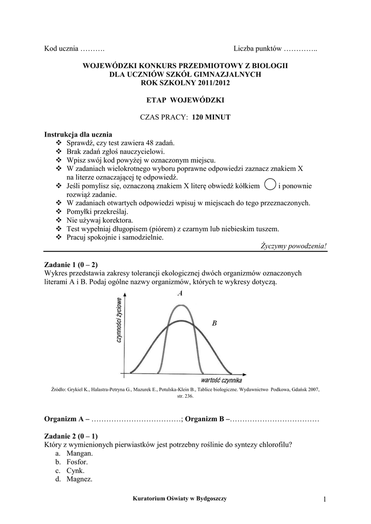 Kod ucznia ………. Liczba punktów ………….. WOJEWÓDZKI KONKURS PRZEDMIOTOWY Z BIOLOGII DLA UCZNIÓW SZKÓŁ GIMNAZJALNYCH ROK SZKOLNY 2011/2012 ETAP WOJEWÓDZKI CZAS PRACY: 120 MINUT Instrukcja dla ucznia Sprawdź, czy test zawiera 48 zadań. Brak zadań zgłoś nauczycielowi. Wpisz swój kod powyżej w oznaczonym miejscu. W zadaniach wielokrotnego wyboru poprawne odpowiedzi zaznacz znakiem X na literze oznaczającej tę odpowiedź. Jeśli pomylisz się, oznaczoną znakiem X literę obwiedź kółkiem i ponownie rozwiąż zadanie. W zadaniach otwartych odpowiedzi wpisuj w miejscach do tego przeznaczonych. Pomyłki przekreślaj. Nie używaj korektora. Test wypełniaj długopisem (piórem) z czarnym lub niebieskim tuszem. Pracuj spokojnie i samodzielnie. Życzymy powodzenia! Zadanie 1 (0 – 2) Wykres przedstawia zakresy tolerancji ekologicznej dwóch organizmów oznaczonych literami A i B. Podaj ogólne nazwy organizmów, których te wykresy dotyczą. Źródło: Grykiel K., Halastra-Petryna G., Mazurek E., Potulska-Klein B., Tablice biologiczne. Wydawnictwo Podkowa, Gdańsk 2007, str. 236. Organizm A – ………………………………; Organizm B –……………………………… Zadanie 2 (0 – 1) Który z wymienionych pierwiastków jest potrzebny roślinie do syntezy chlorofilu? a. Mangan. b. Fosfor. c. Cynk. d. Magnez. Kuratorium Oświaty w Bydgoszczy 1 Zadanie 3 (0 – 1) Kariotyp dorosłej kobiety można określić na podstawie preparatów mikroskopowych przygotowanych z: a. dojrzałych erytrocytów. b. gamet. c. złuszczonych komórek nabłonka. d. limfocytów. Zadanie 4 (0 – 4) Dokonaj analizy rysunku przedstawiającego przebieg pewnego doświadczenia. Na podstawie wyników doświadczenia oceń prawdziwość zamieszczonych w tabeli zdań. Wpisz literę X w odpowiednią kolumnę przy każdym zdaniu. Próba Wyniki obserwacji Czas w minutach 0 - rozpoczęcie 5 10 15 Temperatura doświadczenia a b 15 15 15,5 16,5 16 18 17 22 0 0 C C Źródło: Müller J., Stawiński W., Palka S., Obserwacje i doświadczenia w nauczaniu biologii. Fizjologia zwierząt. WSiP, Warszawa 1992, str. 123. Zdania Prawda Fałsz Ubrania uszyte z jasnych tkanin pochłaniają więcej energii świetlnej niż ciemne. W słoneczne i gorące dni lata należy nosić ubrania uszyte z ciemnych tkanin. Ubrania uszyte z ciemnych tkanin pochłaniają więcej energii świetlnej niż jasne. W słoneczne i gorące dni lata organizm człowieka bardziej się przegrzewa w ubraniach uszytych z jasnych tkanin. Zadanie 5 (0 – 1) Krew kobiety, która nie dziedziczy genu warunkującego czynnik Rh (Rh-): a. zawiera stale przeciwciała anty Rh, jako czynnik dziedziczny. b. wytwarza przeciwciała anty Rh w czasie pierwszej ciąży z płodem Rh(+). c. nabywa zdolność zlepiania krwi płodów Rh(-) w kolejnych ciążach. d. produkuje przeciwciała anty Rh na pierwszy rozwijający się płód Rh(-). Kuratorium Oświaty w Bydgoszczy 2 Zadanie 6 (0 – 3) Tabela przedstawia proporcje długości jelita w stosunku do długości ciała występujące u różnych ssaków oznaczonych literami A, B i C. Zwierzęta te przystosowane są do odżywania się różnym pokarmem. Dokonaj analizy danych zawartych w tabeli. Do jakiej grupy, pod względem zjadanego pokarmu, zaliczamy te ssaki? Zapisz odpowiednio w tabeli. A Proporcje długości jelita do długości ciała 5:1 B 14 : 1 C 30 : 1 Organizm Nazwy grup zwierząt pobierających określony pokarm Źródło: Mizerski W. (red.), Tablice biologiczne, Wydawnictwo Adamantan, Warszawa 2003, str.146 Zadanie 7 (0 – 2) Poniżej przedstawiono przykłady cech występujących u ludzi, które warunkują allele dominujące i allele recesywne. Odpowiednio przyporządkuj podane przykłady. kręcone włosy; jasne włosy; umiejętność zwijania języka w rurkę; policzki bez dołków; odstające uszy; brak piegów; składanie kciuka prawego na lewy; niebieskie oczy. Cecha warunkowana przez allel dominujący: …………………………………………………………………………………………….., ……………………………………………………………………………………………… Cecha warunkowana przez allel recesywny: ………………………………………………………………………………………………, ………………………………………………………………………………………………. Zadanie 8 (0 – 3) Odpowiedz na poniższe pytania, wpisując w miejsce kropek odpowiednie cyfry lub liczby. a. Ile chromosomów jest w diploidalnej komórce człowieka? …… b. Ile kodonów koduje 9 aminokwasów? …….. c. Ile rodzajów aminokwasów buduje białka? …… d. Ile chromosomów autosomalnych jest w somatycznej komórce człowieka? ……. e. Ile nukleotydów koduje 7 aminokwasów? …… Zadanie 9 (0 – 3) Uzupełnij tabelę w taki sposób, aby otrzymać porównanie budowy kwasów nukleinowych RNA i DNA. Budowa RNA DNA jedna nić Liczba nici a– Cukier b– deoksyryboza Zasada azotowa c– A; T; G; C Kuratorium Oświaty w Bydgoszczy 3 Zadanie 10 (0 – 6) Rysunki przedstawiają organy roślin, które uległy modyfikacji. Ustal, jaki organ uległ modyfikacji. Podaj nazwę tej części rośliny, która powstała w wyniku przekształcenia. Źródło: Grykiel K., Halastra-Petryna G., Mazurek E., Potulska-Klein B., Tablice biologiczne. Wydawnictwo Podkowa, Gdańsk 2007, str. 134-137. Oznaczenie organu A Nazwa organu, który uległ modyfikacji Nazwa części rośliny, która powstała w wyniku przekształcenia B C D E F Zadanie 11 (0 – 3) Do podanych w tabeli funkcji dopisz nazwę odpowiedniej organelli. Funkcja Organella Reguluje ruch substancji wnikających do komórki i opuszczających komórkę. Kieruje czynnościami życiowymi komórki, zawiera materiał genetyczny. Zachodzi na nich synteza białek. Przekształcają energię pochodzącą z glukozy na energię zgromadzoną w ATP. Bierze udział 