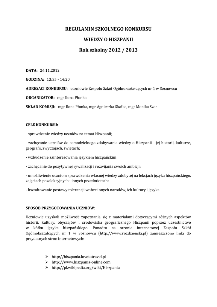 REGULAMIN SZKOLNEGO KONKURSU WIEDZY O HISZPANII Rok