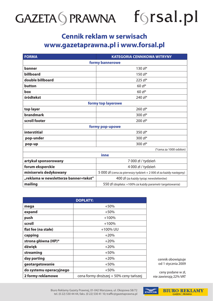 Cennik reklam w serwisach www.gazetaprawna.pl i www