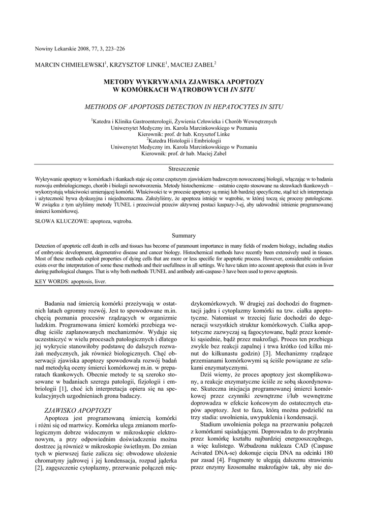 Nowiny Lekarskie 2008, 77, 3, 223–226 MARCIN CHMIELEWSKI1, KRZYSZTOF LINKE1, MACIEJ ZABEL2 METODY WYKRYWANIA ZJAWISKA APOPTOZY W KOMÓRKACH WĄTROBOWYCH IN SITU METHODS OF APOPTOSIS DETECTION IN HEPATOCYTES IN SITU 1 Katedra i Klinika Gastroenterologii, Żywienia Człowieka i Chorób Wewnętrznych Uniwersytet Medyczny im. Karola Marcinkowskiego w Poznaniu Kierownik: prof. dr hab. Krzysztof Linke 2 Katedra Histologii i Embriologii Uniwersytet Medyczny im. Karola Marcinkowskiego w Poznaniu Kierownik: prof. dr hab. Maciej Zabel Streszczenie Wykrywanie apoptozy w komórkach i tkankach staje się coraz częstszym zjawiskiem badawczym nowoczesnej biologii, włączając w to badania rozwoju embriologicznego, chorób i biologii nowotworzenia. Metody histochemiczne – ostatnio często stosowane na skrawkach tkankowych – wykorzystują właściwości umierającej komórki. Właściwości te w procesie apoptozy są mniej lub bardziej specyficzne, stąd też ich interpretacja i użyteczność bywa dyskusyjna i niejednoznaczna. Założyliśmy, że apoptoza istnieje w wątrobie, w której toczą się procesy patologiczne. W związku z tym użyliśmy metody TUNEL i przeciwciał przeciw aktywnej postaci kaspazy-3-ej, aby udowodnić istnienie programowanej śmierci komórkowej. SŁOWA KLUCZOWE: apoptoza, wątroba. Summary Detection of apoptotic cell death in cells and tissues has become of paramount importance in many fields of modern biology, including studies of embryonic development, degenerative disease and cancer biology. Histochemical methods have recently been extensively used in tissues. Most of these methods exploit properties of dying cells that are more or less specific for apoptotic process. However, considerable confusion exists over the interpretation of some these methods and their usefullness in all settings. We have taken into account apoptosis that exists in liver during pathological changes. That is why both methods TUNEL and antibody anti-caspase-3 have been used to prove apoptosis. KEY WORDS: apoptosis, liver. Badania nad śmiercią komórki przeżywają w ostatnich latach ogromny rozwój. Jest to spowodowane m.in. chęcią poznania procesów rządzących w organizmie ludzkim. Programowana śmierć komórki przebiega według ściśle zaplanowanych mechanizmów. Wydaje się uczestniczyć w wielu procesach patologicznych i dlatego jej wykrycie stanowiłoby podstawę do dalszych rozważań medycznych, jak również biologicznych. Chęć obserwacji zjawiska apoptozy spowodowała rozwój badań nad metodyką oceny śmierci komórkowej m.in. w preparatach tkankowych. Obecnie metody te są szeroko stosowane w badaniach szeregu patologii, fizjologii i embriologii [1], choć ich interpretacja opiera się na spekulacyjnych uzgodnieniach grona badaczy. ZJAWISKO APOPTOZY Apoptoza jest programowaną śmiercią komórki i różni się od martwicy. Komórka ulega zmianom morfologicznym dobrze widocznym w mikroskopie elektronowym, a przy odpowiednim doświadczeniu można dostrzec ją również w mikroskopie świetlnym. Do zmian tych w pierwszej fazie zalicza się: obwodowe ułożenie chromatyny jądrowej i jej kondensacja, rozpad jąderka [2], zagęszczenie cytoplazmy, przerwanie połączeń mię- dzykomórkowych. W drugiej zaś dochodzi do fragmentacji jądra i cytoplazmy komórki na tzw. ciałka apoptotyczne. Natomiast w trzeciej fazie dochodzi do degeneracji wszystkich struktur komórkowych. Ciałka apoptotyczne zazwyczaj są fagocytowane, bądź przez komórki sąsiednie, bądź przez makrofagi. Proces ten przebiega zwykle bez reakcji zapalnej i trwa krótko (od kilku minut do kilkunastu godzin) [3]. Mechanizmy rządzące przemianami komórkowymi są ściśle powiązane ze szlakami enzymatycznymi. Dziś wiemy, że proces apoptozy jest skomplikowany, a reakcje enzymatyczne ściśle ze sobą skoordynowane. Skuteczna inicjacja programowanej śmierci komórkowej przez czynniki zewnętrzne i/lub wewnętrzne doprowadza w efekcie końcowym do ostatecznych etapów apoptozy. Jest to faza, którą można podzielić na trzy stadia: uwolnienia, uwypuklenia i kondensacji. Stadium uwolnienia polega na przerwaniu połączeń z komórkami sąsiadującymi. Doprowadza to do przybrania przez komórkę kształtu najbardziej energooszczędnego, a więc kulistego. Wzbudzona nukleaza CAD (Caspase Acivated DNA-se) dokonuje cięcia DNA na odcinki 180 par zasad [4]. Fragmenty te ulegają dalszemu strawieniu przez enzymy lizosomalne makrofagów tak, aby nie do- 224 Marcin Chmielewski i inni prowadzić do wzbudzenia choroby autoimmunologicznej przez pozostałości jądrowe. W stadium uwypuklenia następuje seria skurczów włókien aktynowych oddziaływujących z miozyną, co doprowadza do uwypuklania się błony komórkowej. W stadium kondensacji tworzą się ostatecznie ciałka apoptotyczne [5]. Egzekucja apoptozy jest więc o tyle ważna metodologicznie, że jedynie w tym czasie jesteśmy pewni, że komórka ulega programowanej śmierci. Wydaje się to więc jasnym, że większość metod badawczych skupia się na tej właśnie fazie. METODA OPARTA NA ZASTOSOWANIU PRZECIWCIAŁ PRZECIW AKTYWNEJ POSTACI KASPAZY-3-CIEJ Wiadomo, że w ostatnim etapie apoptozy następuje wzbudzenie kaskady kaspaz. Do tej pory odkryto ich 14, ale chyba najważniejszą z nich jest kaspaza-3. Ona to bowiem uaktywnia bezpośrednio DFF (DNA Fragmentation Factor) doprowadzając do trawienia DNA. Rozkłada PARP (Poly ADP-Ribose Polymarse) inaktywując możliwość naprawy uszkodzonego genomu. Jest końcowym etapem przemian kaspaz i w związku z tym stanowi prosty i właściwy punkt wykrywania apoptozy. Do jej wykrywania używa się przeciwciał monoklonalnych skierowanych selektywnie przeciwko wybranemu epitopowi antygenowemu aktywnej kaspazy-3. Wydaje się to ważnym, ponieważ kaspaza-3 występuje w komórkach niezmienionych apoptotycznie w formie prokaspazy. Gdybyśmy więc dysponowali przeciwciałami nieselektywnymi tzn. takimi, które znak